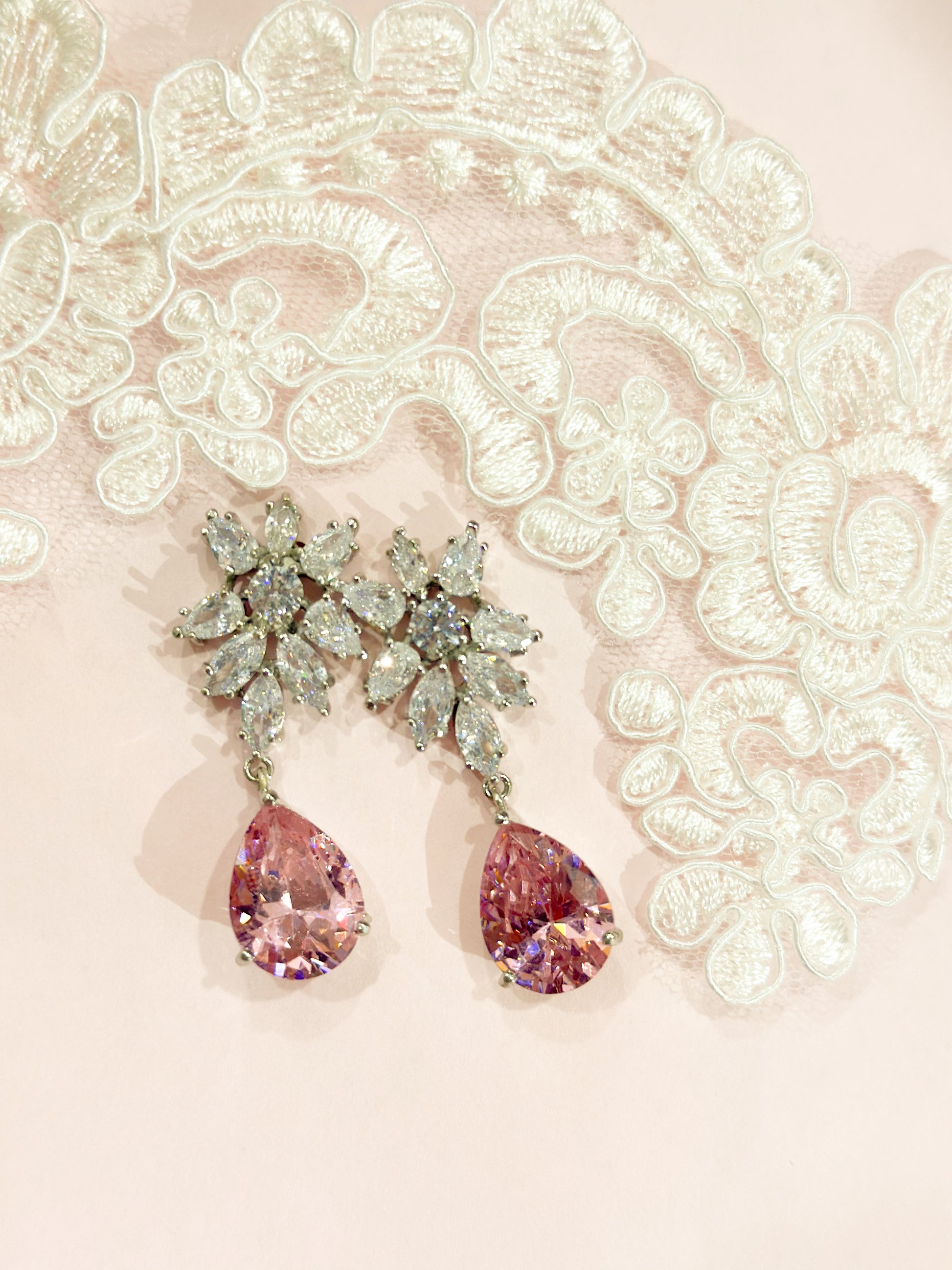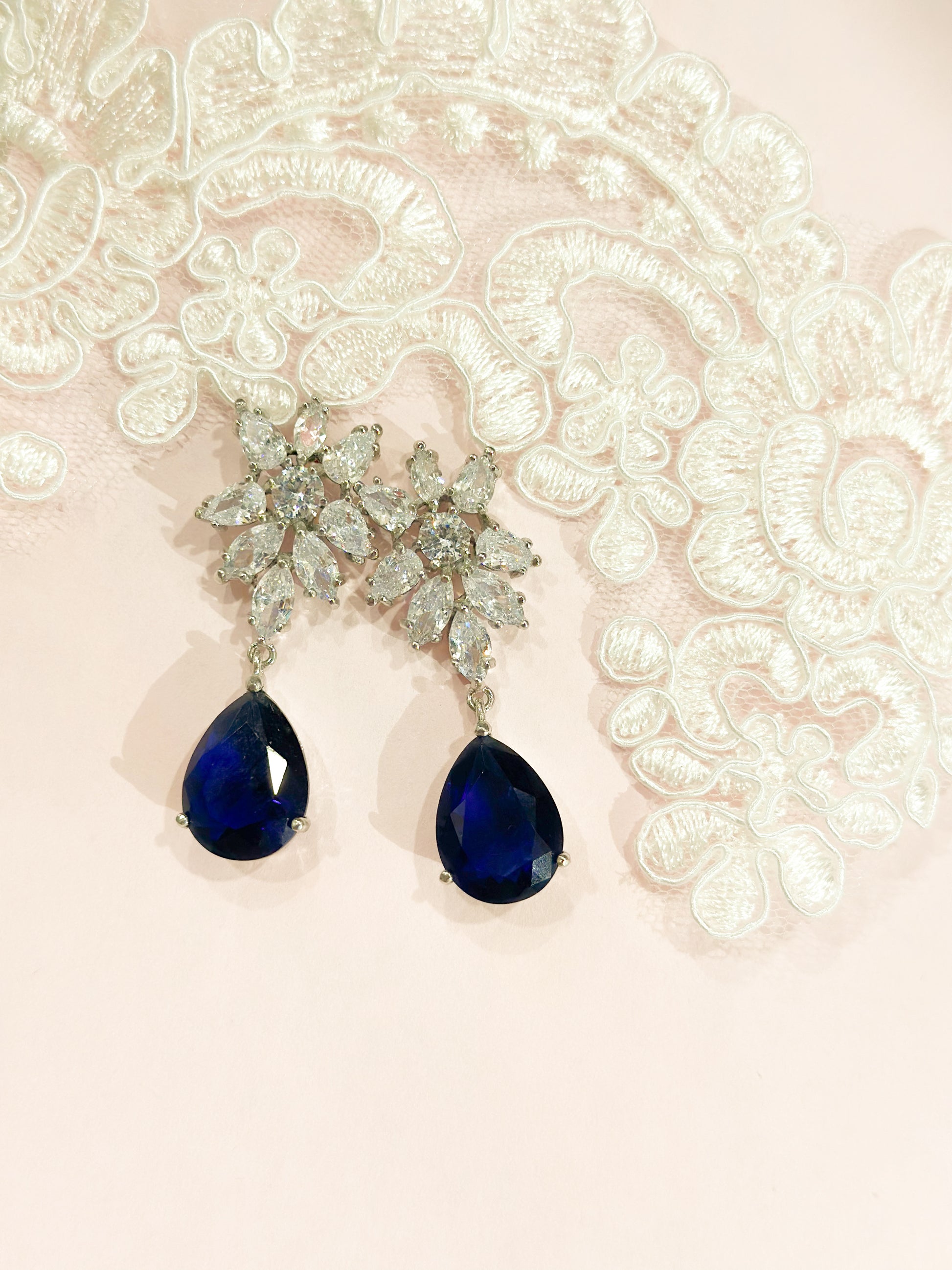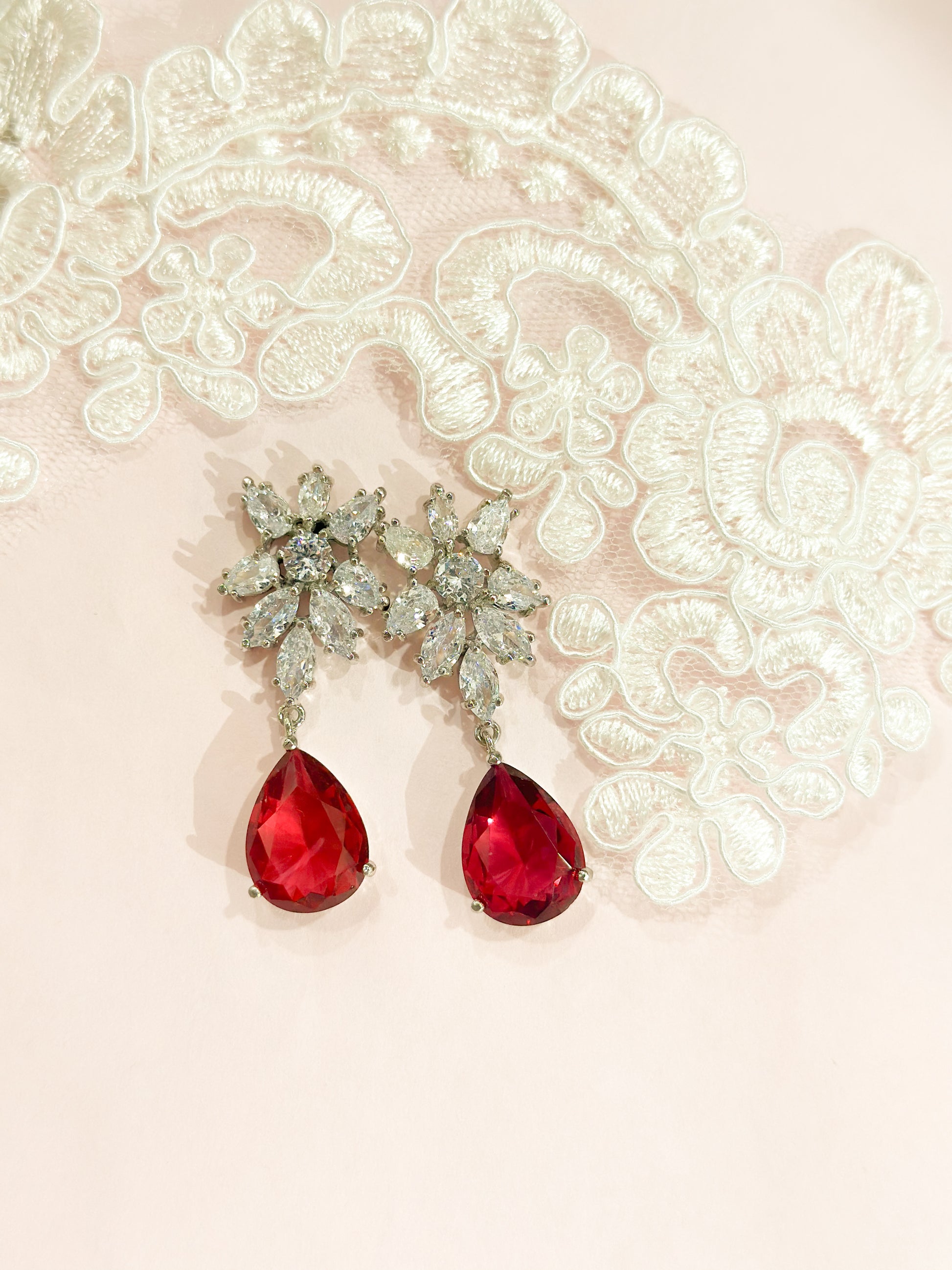 Tipo: Arete Largo con forma de hojas sin halo en la parte superior con una gota de zirconia de color al final sin halo montado en aleación de acero inoxidable en baño de rodio