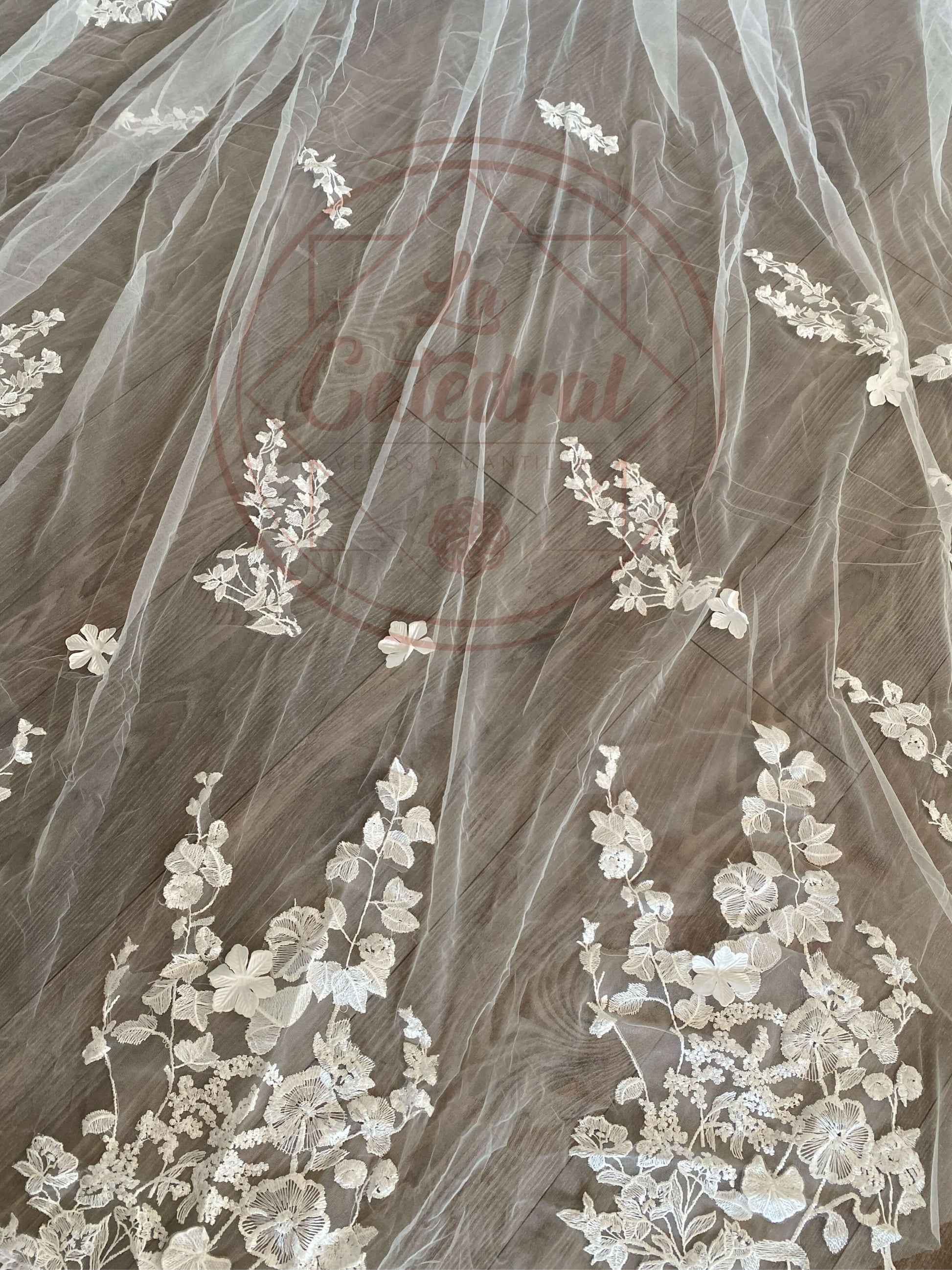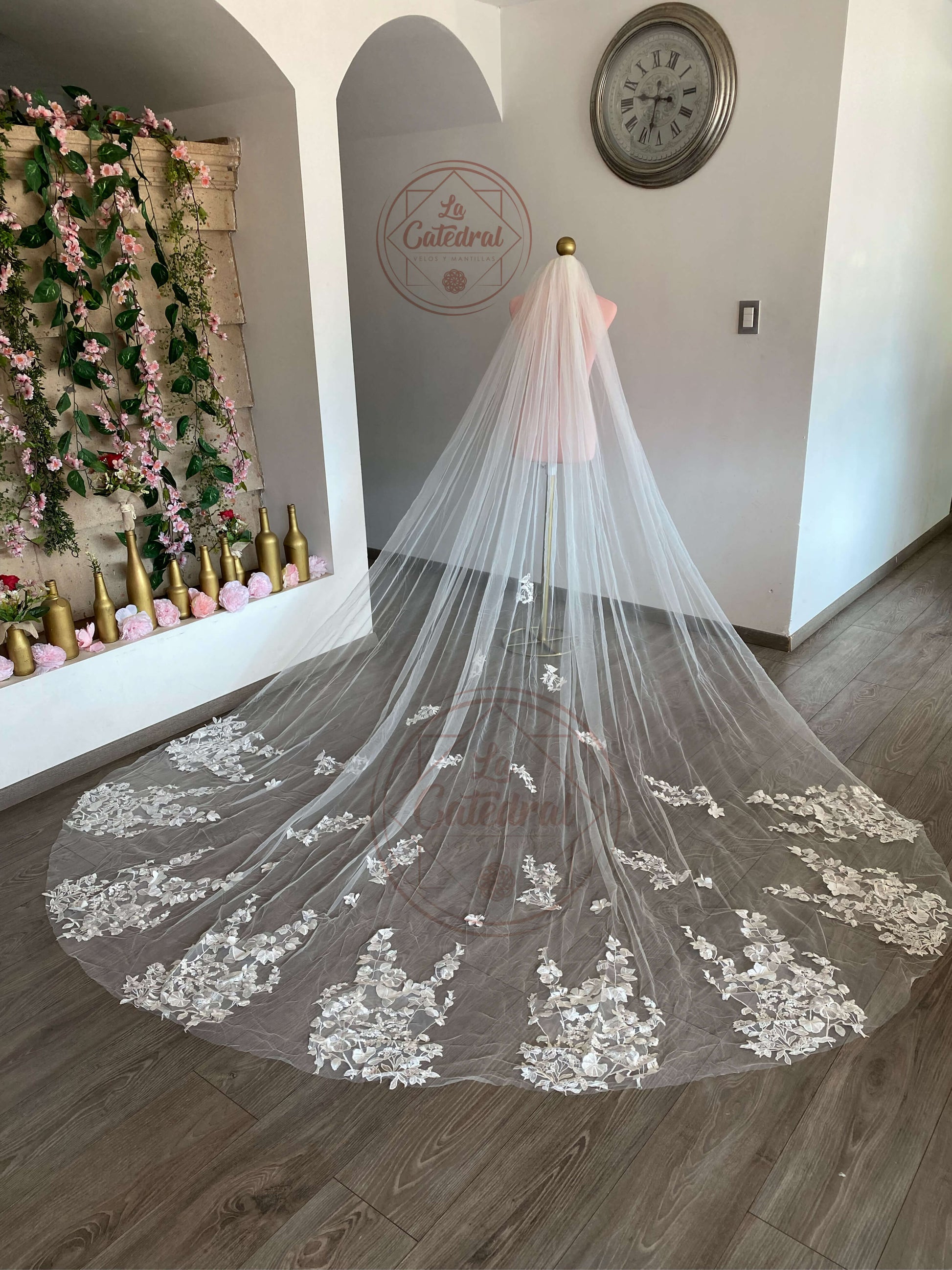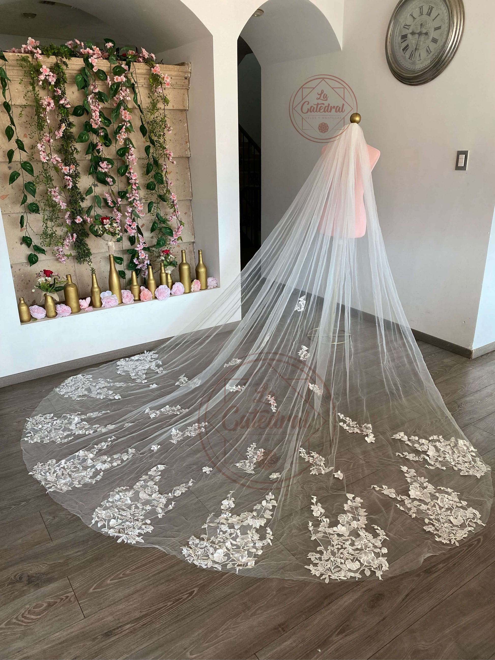 Tipo: Velo catedral una capa con peineta, montado en tulle de seda con aplicaciones de flores y hojas grandes esporádicas y flores de seda 3D en la parte final del velo para crear un estilo cargado pero equilibrando para dejar lucir la belleza de tu vestido.