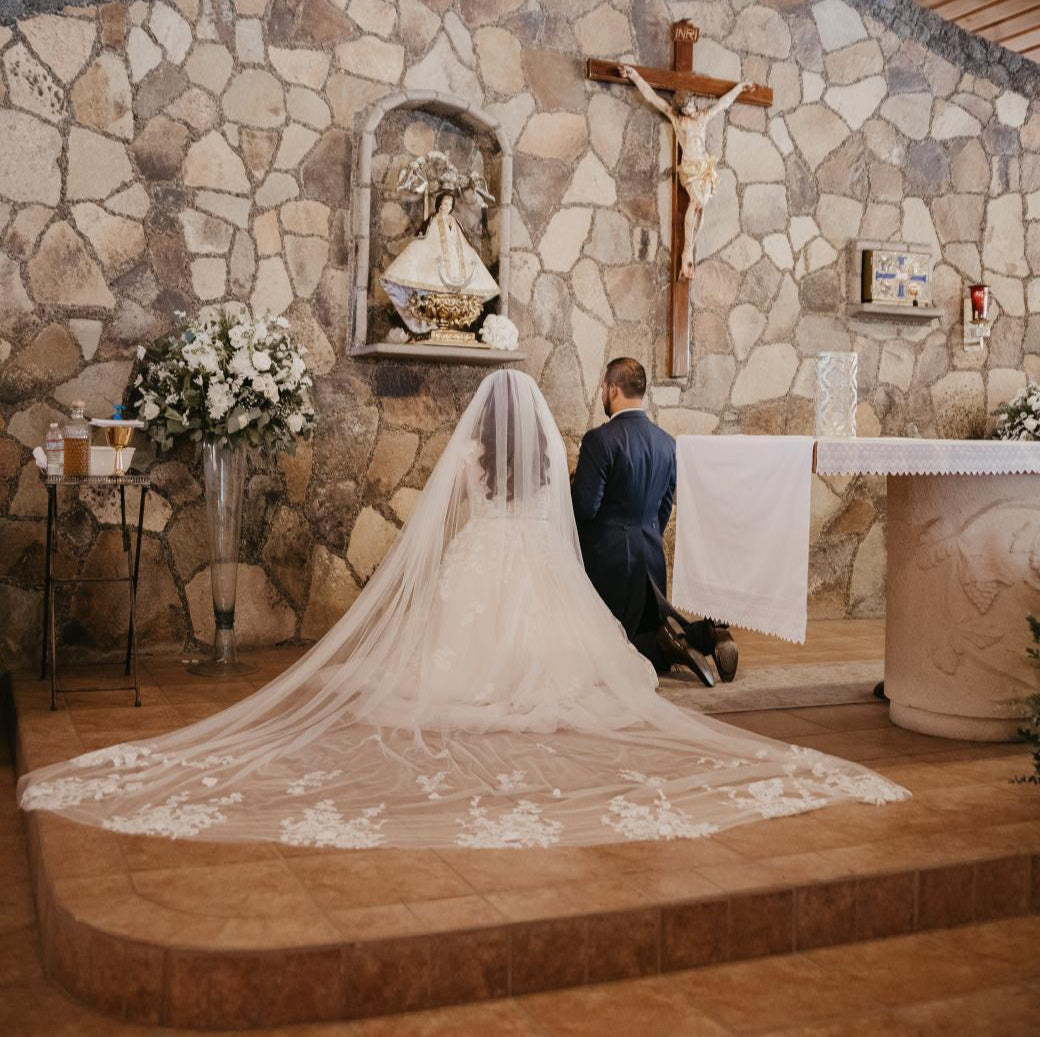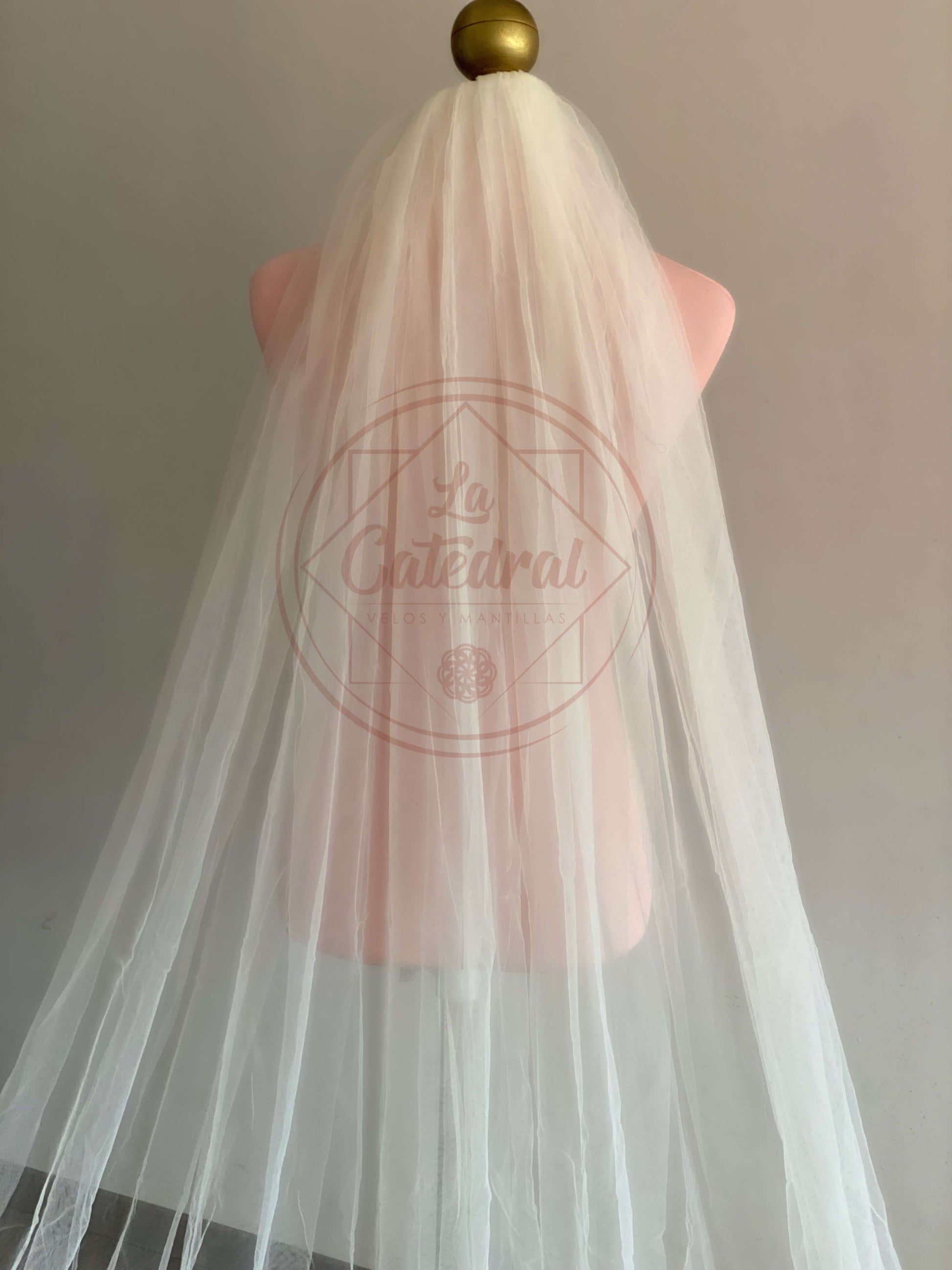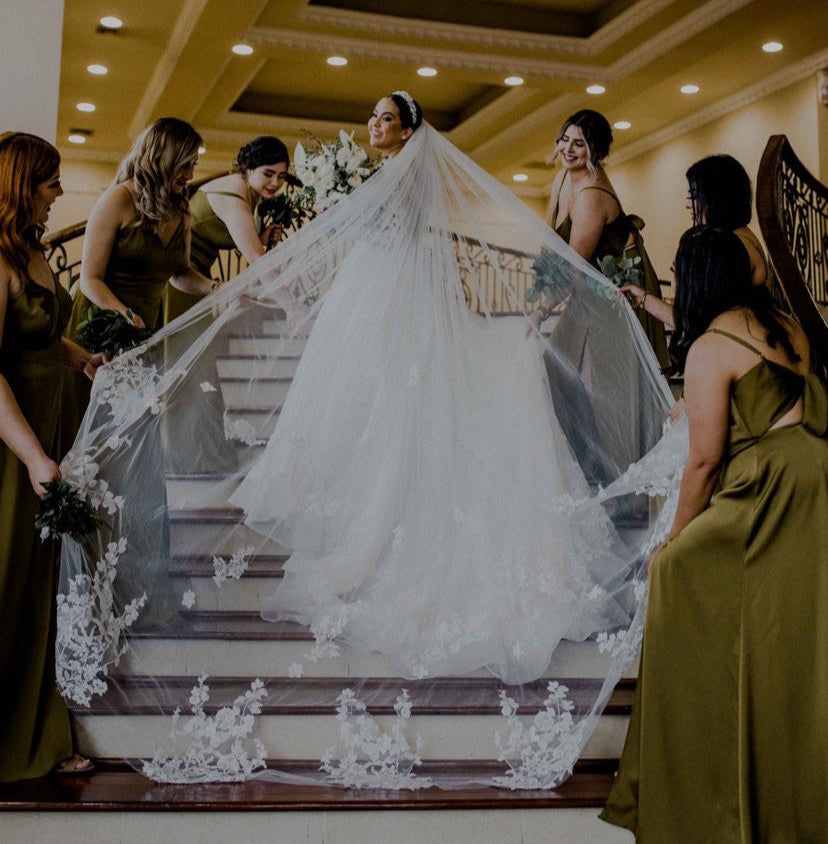 Tipo: Velo catedral una capa con peineta, montado en tulle de seda con aplicaciones de flores y hojas grandes esporádicas y flores de seda 3D en la parte final del velo para crear un estilo cargado pero equilibrando para dejar lucir la belleza de tu vestido.
