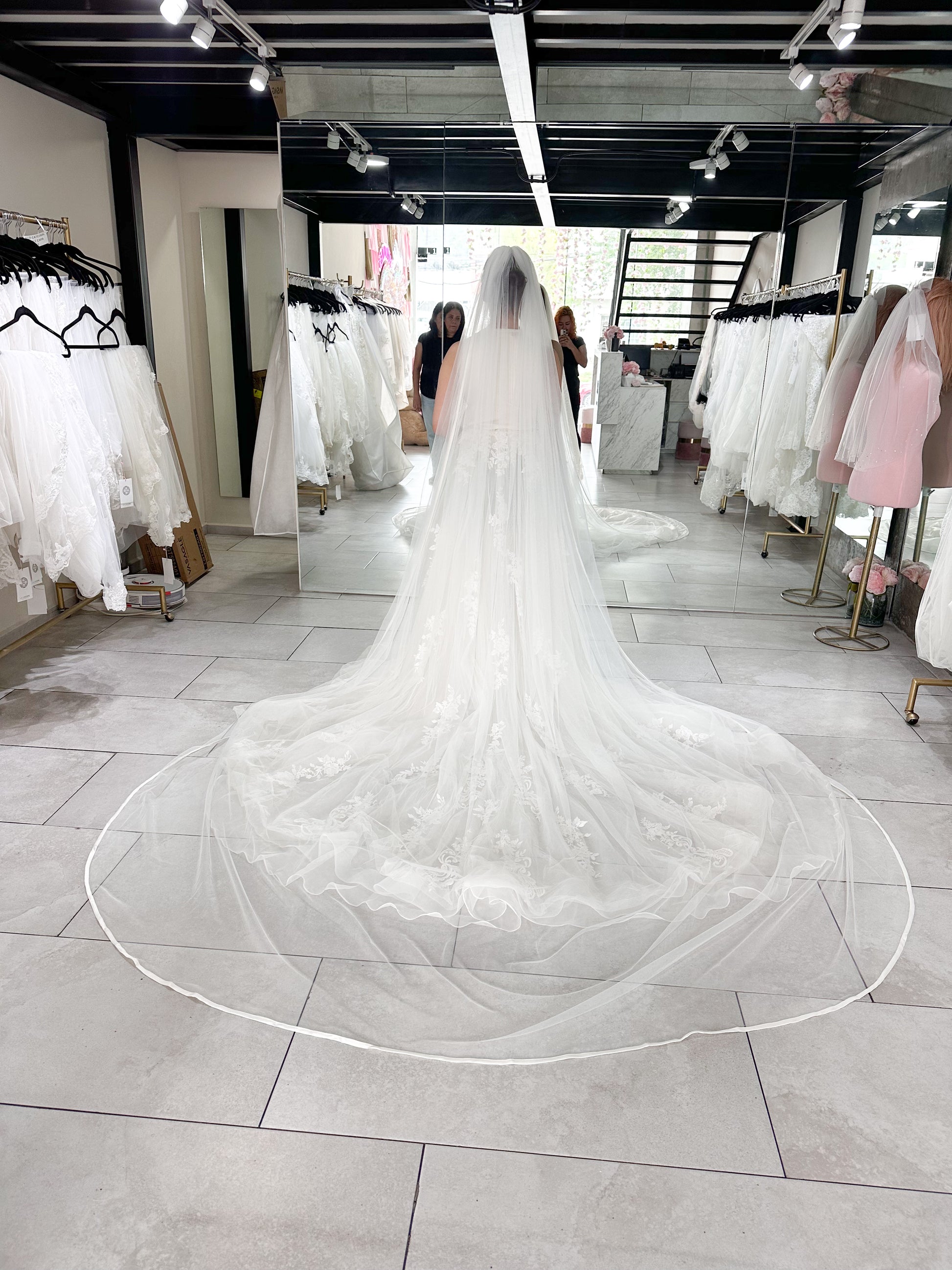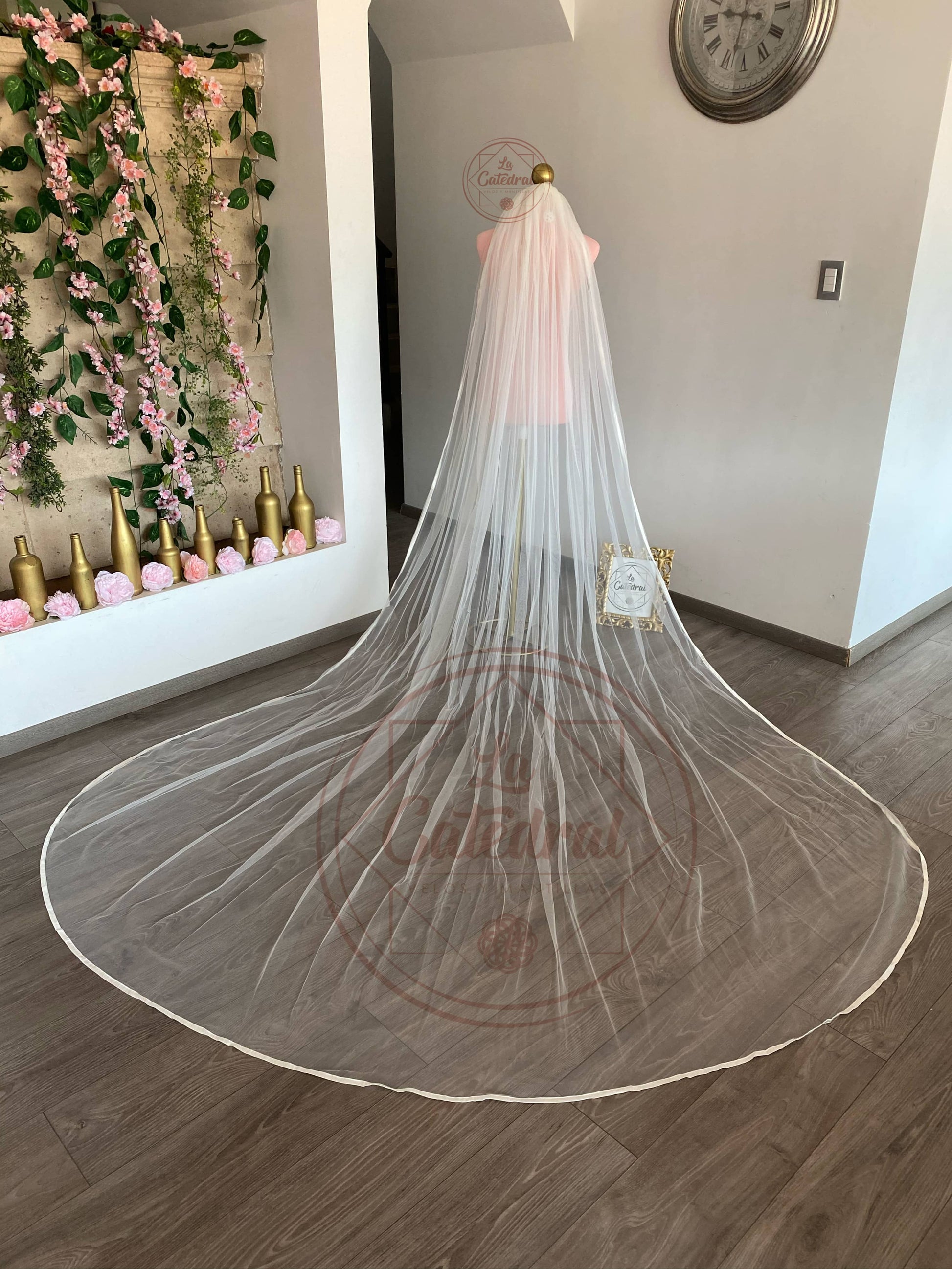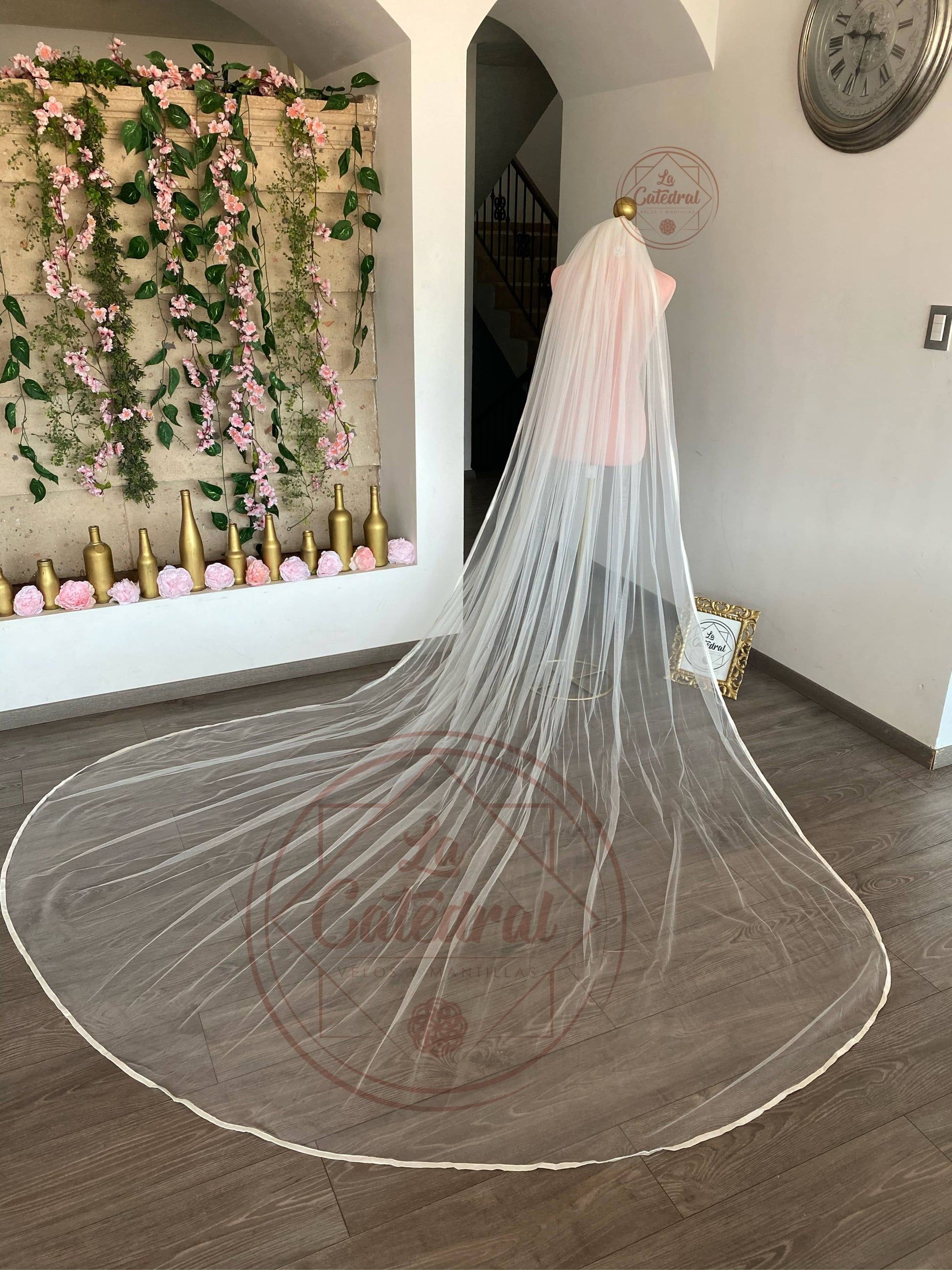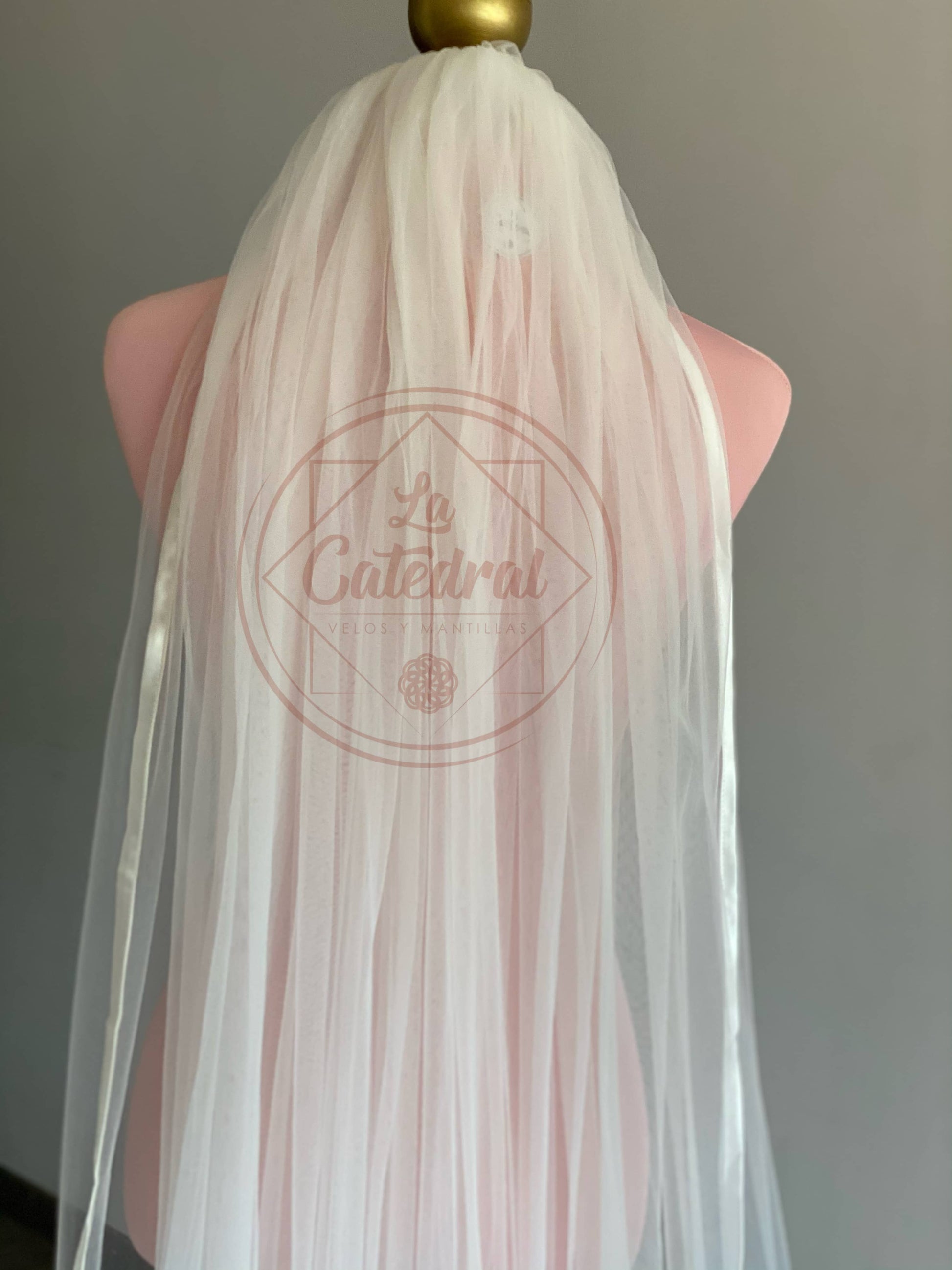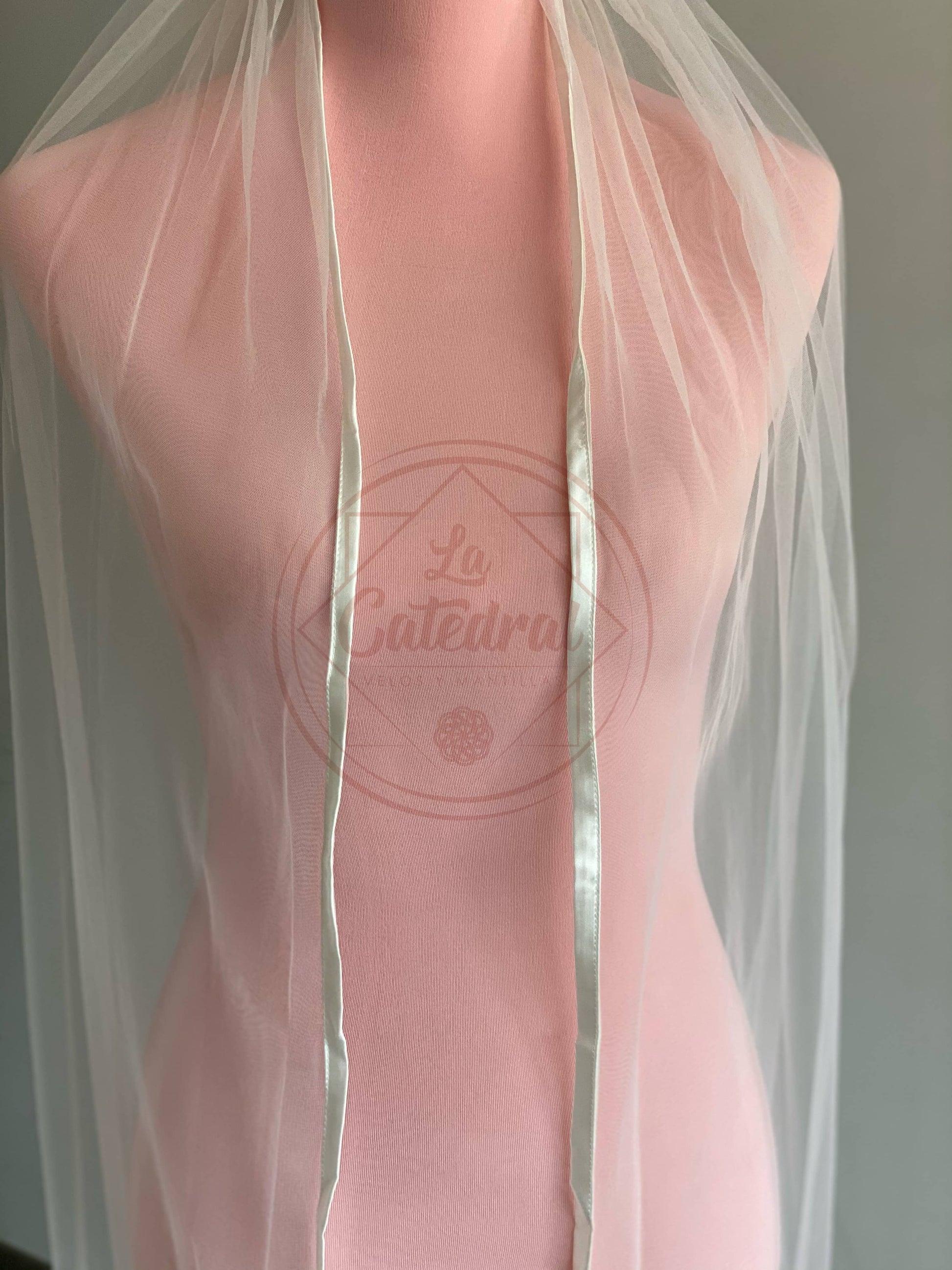 Tipo: Velo catedral Una capa con peineta y orilla de listón satinado en toda la orilla para un look sofisticado.