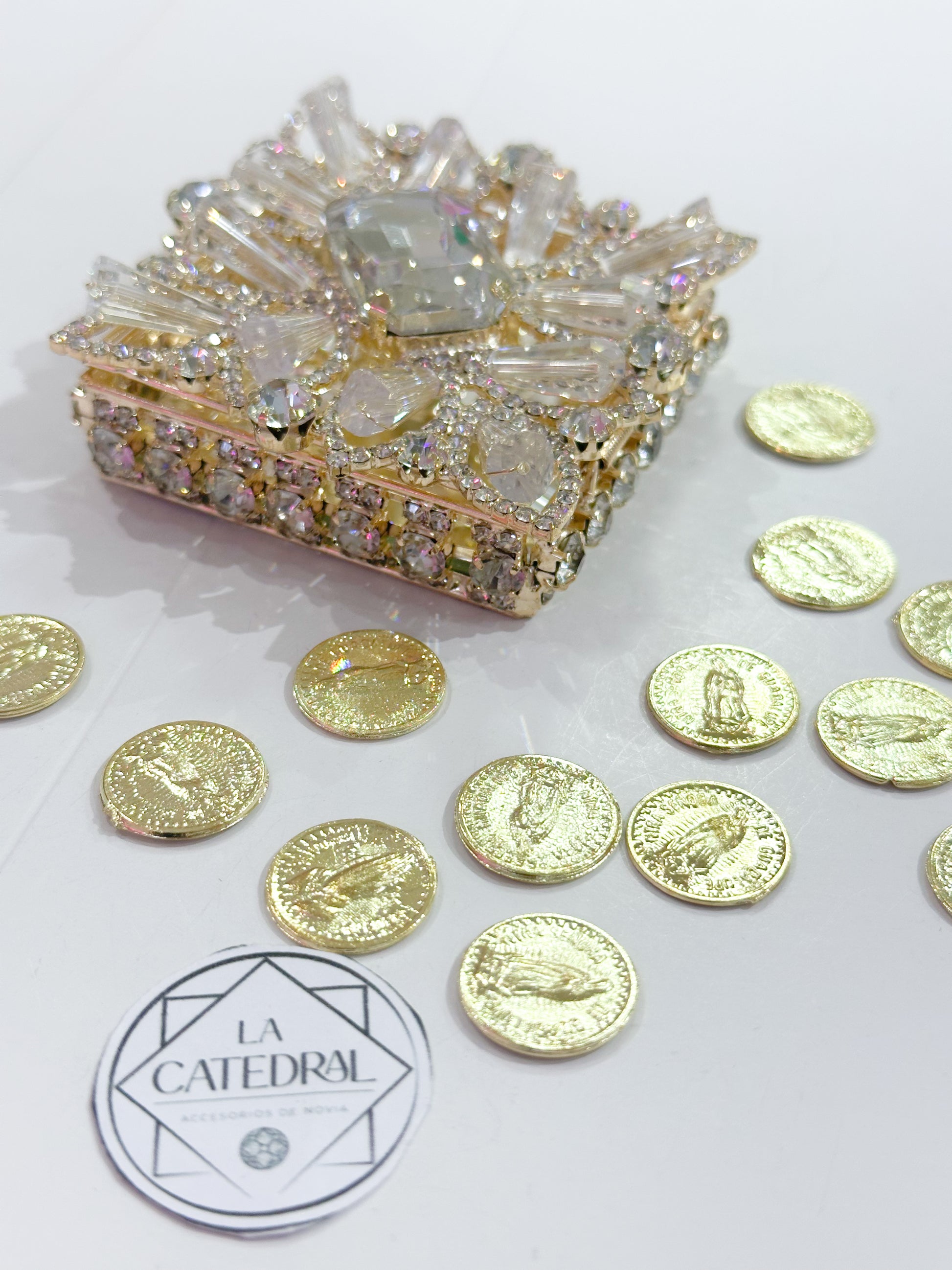 Material: Monedas en aleación de acero inoxidable en baño de rodio con su cofre de cristales austriacos y cristales rusos en aleación de metal con acero inoxidable de forma cuadrada