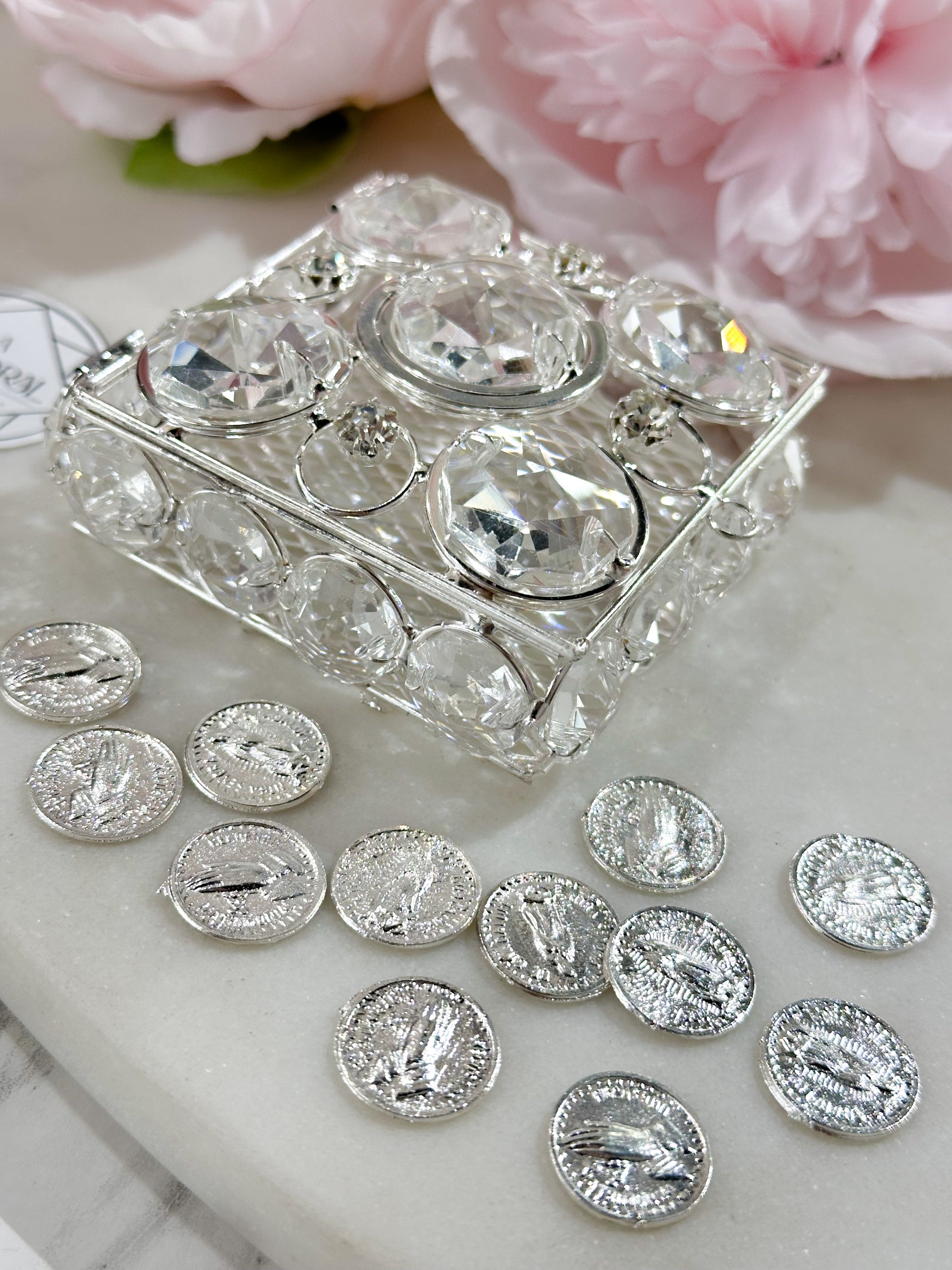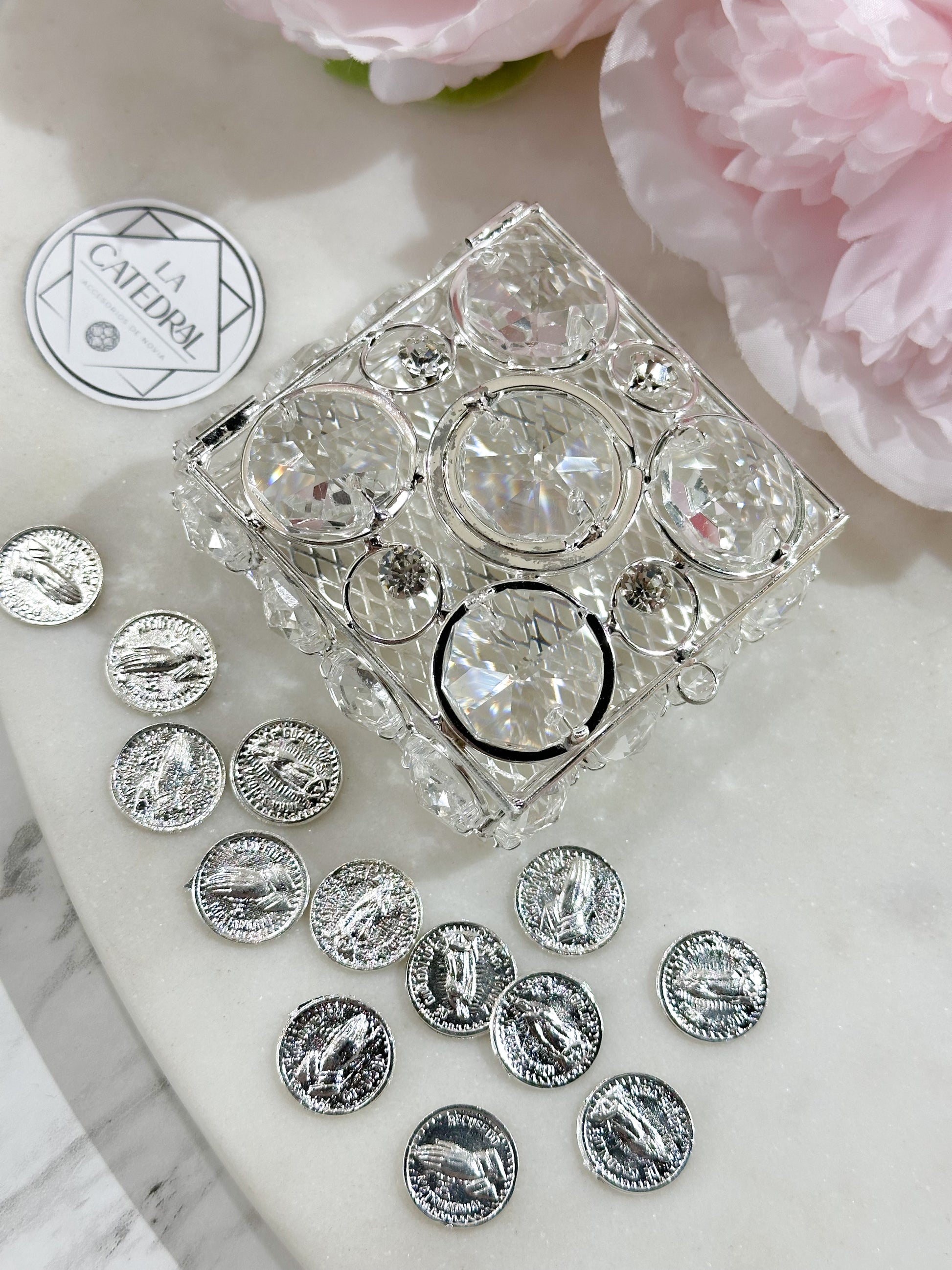Material: Monedas en aleación de acero inoxidable en baño de rodio con su cofre de cristales rusos en aleación de metal con acero inoxidable de forma cuadrada