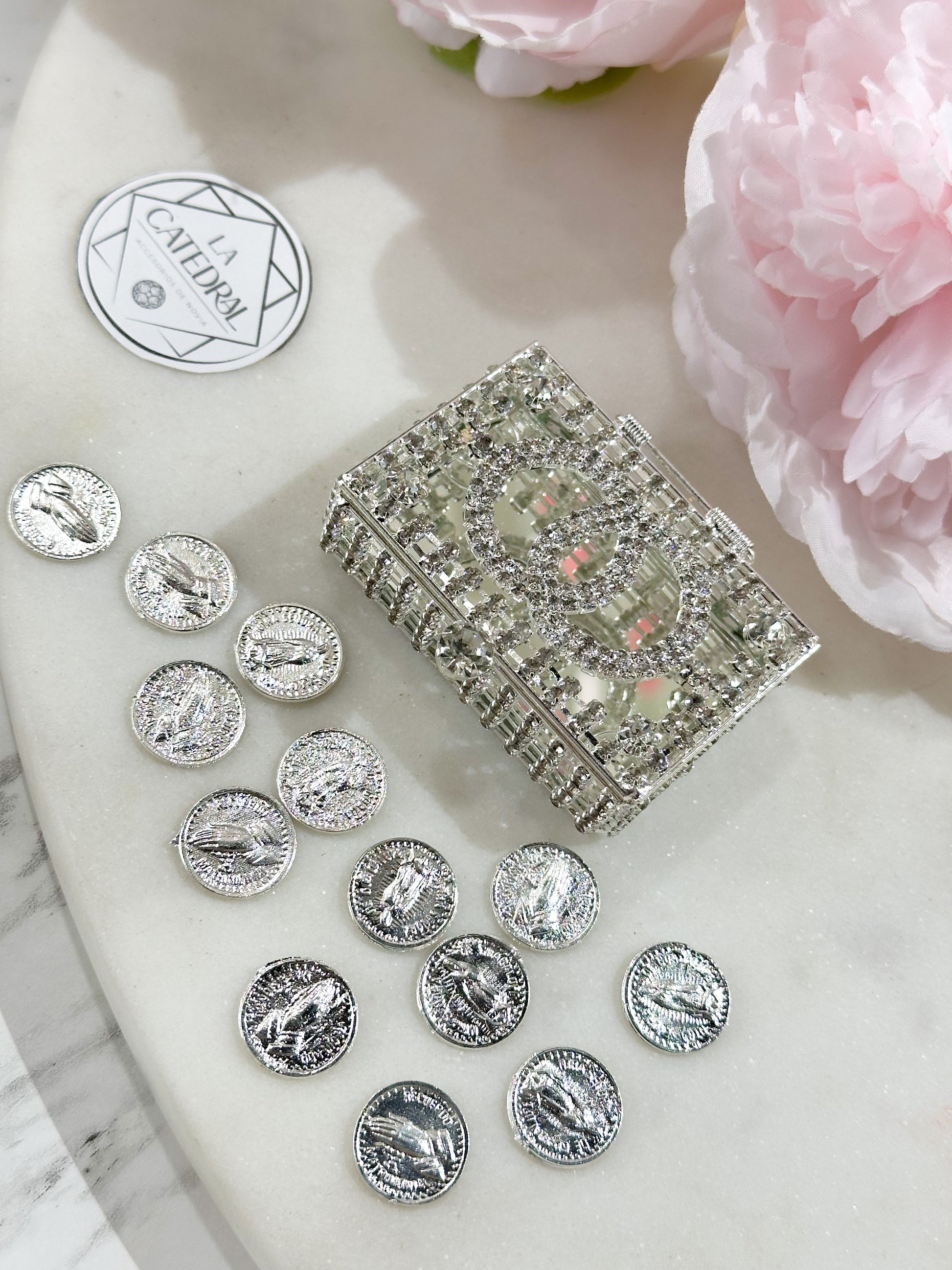 Material: Monedas en aleación de acero inoxidable en baño de rodio con su cofre de cristales austriacos en aleación de metal con acero inoxidable de forma rectangular exquisita