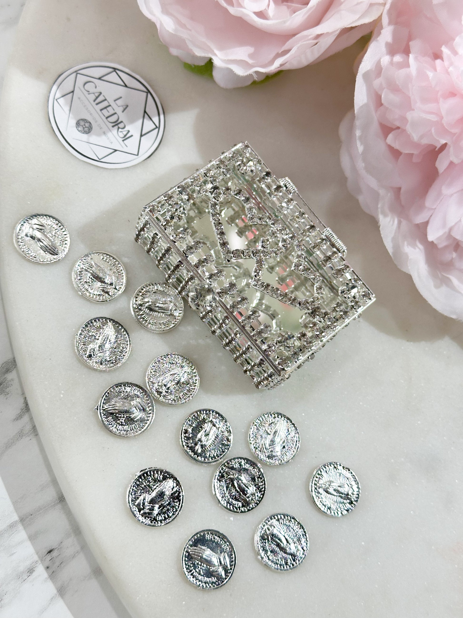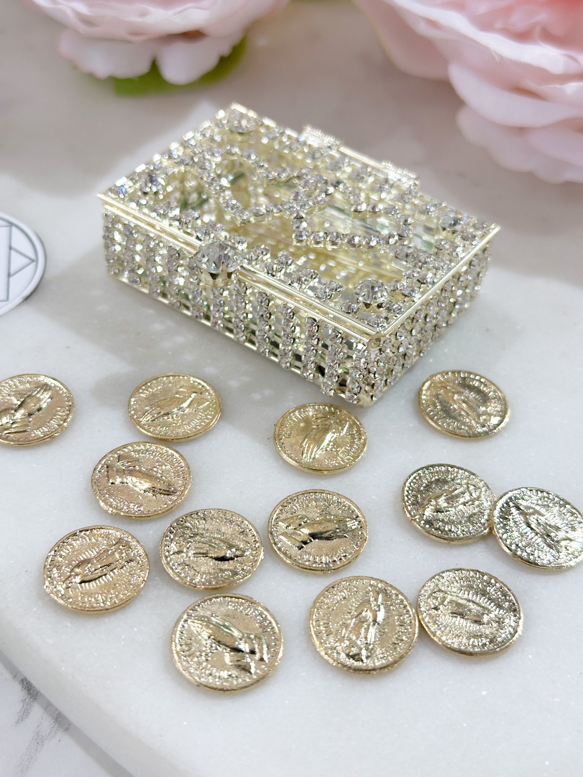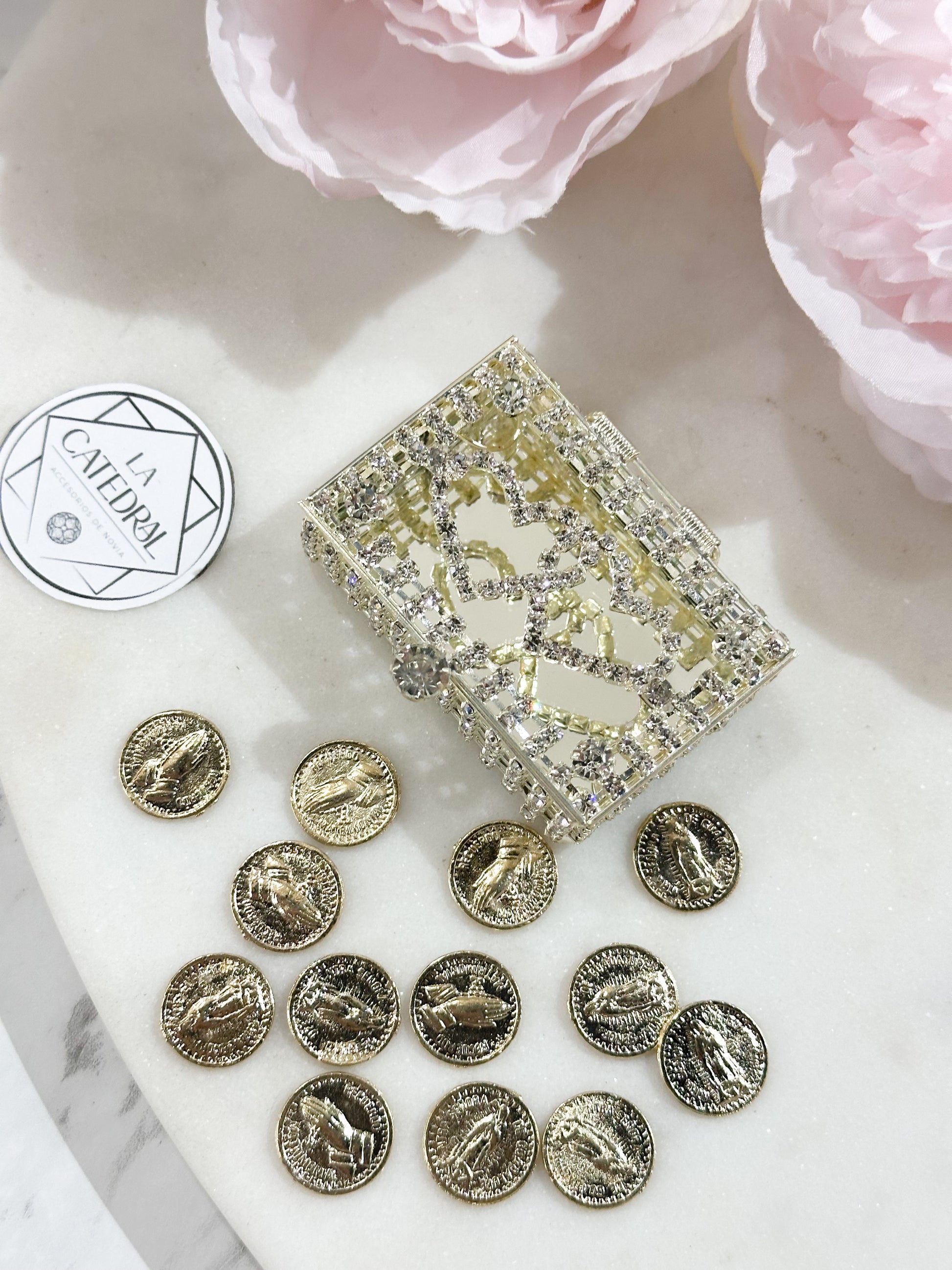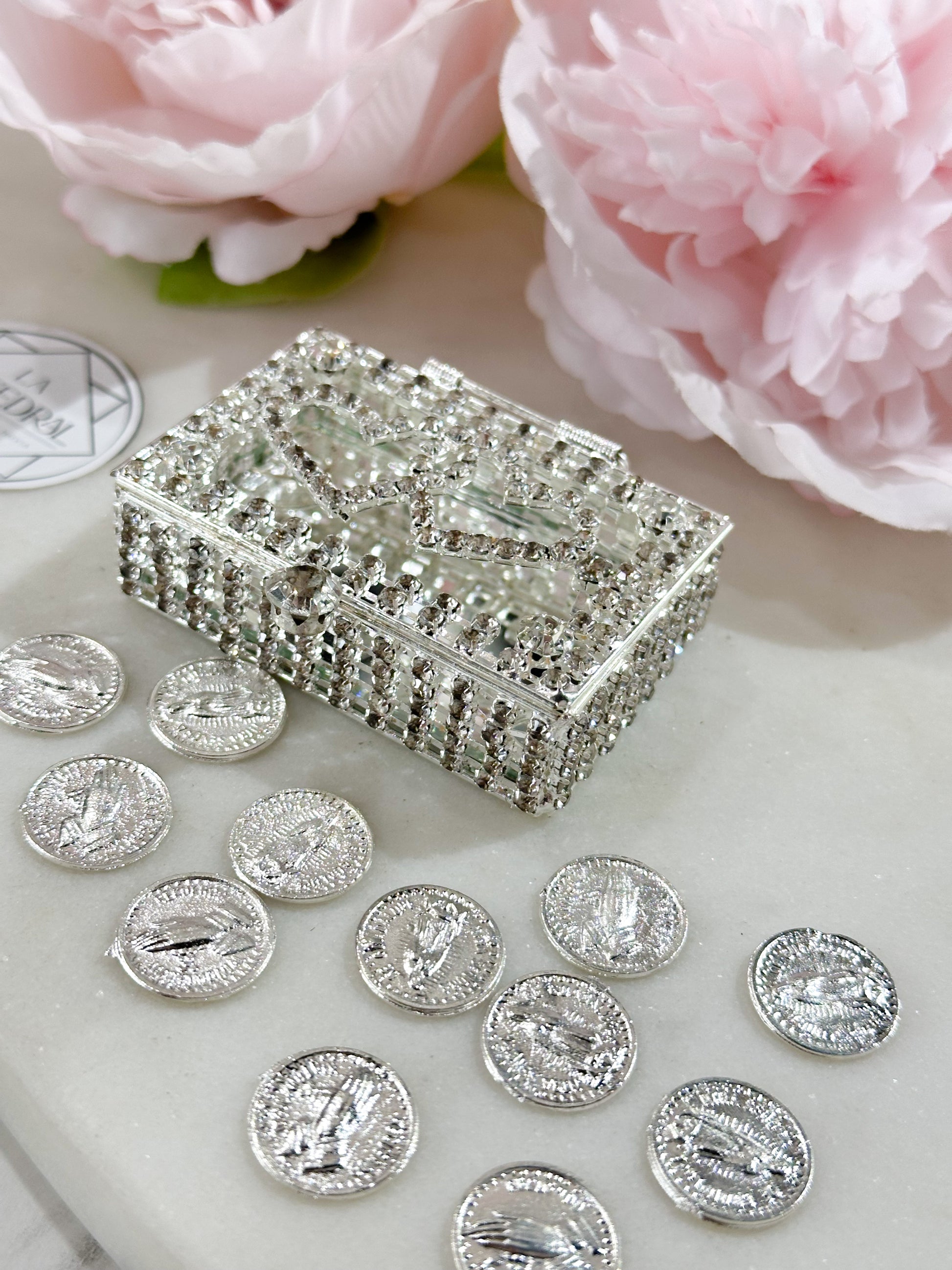 Material: Monedas en aleación de acero inoxidable en baño de rodio con su cofre de cristales austriacos en aleación de metal con acero inoxidable de forma rectangular con diseño de corazones exquisitos