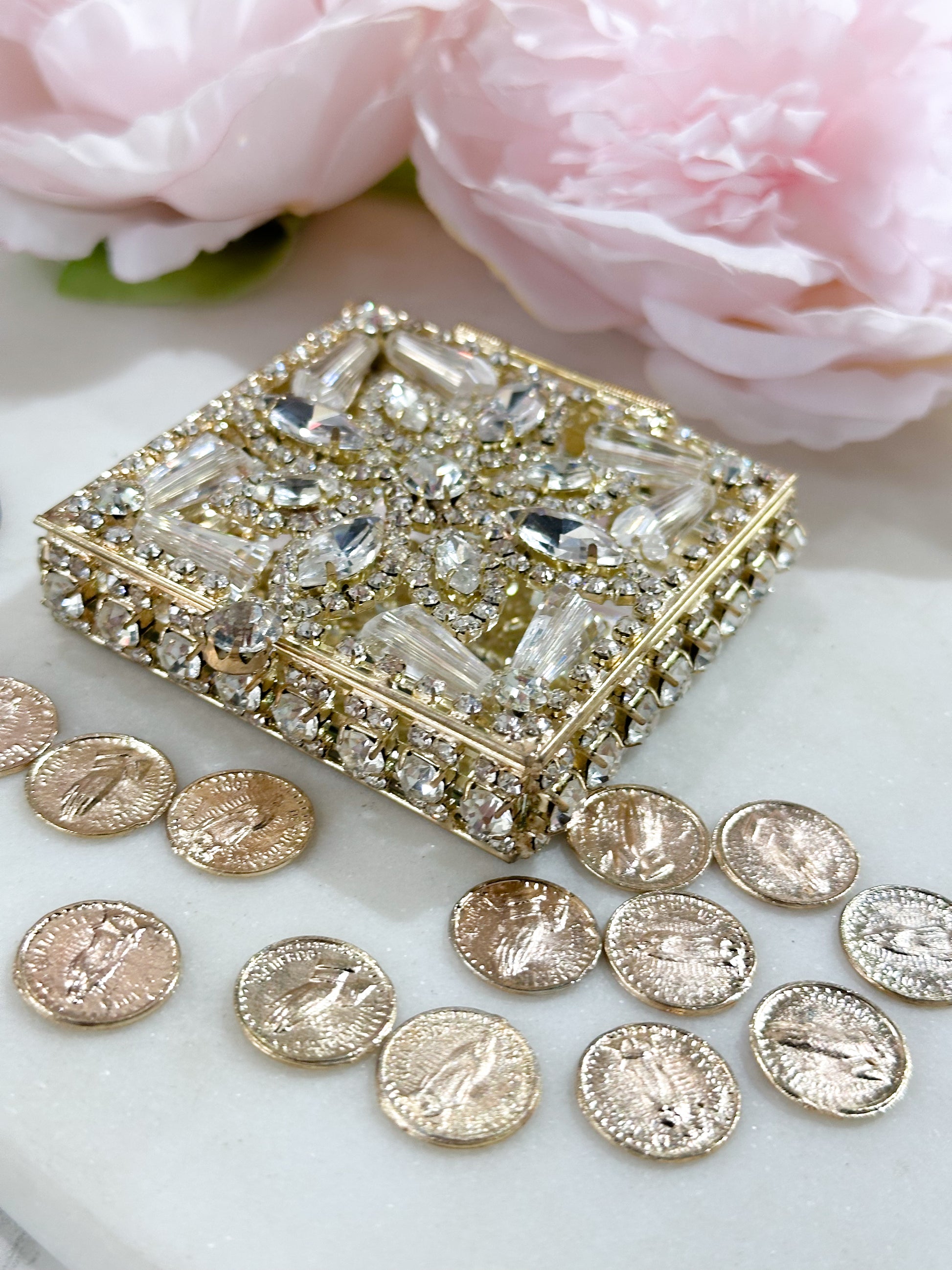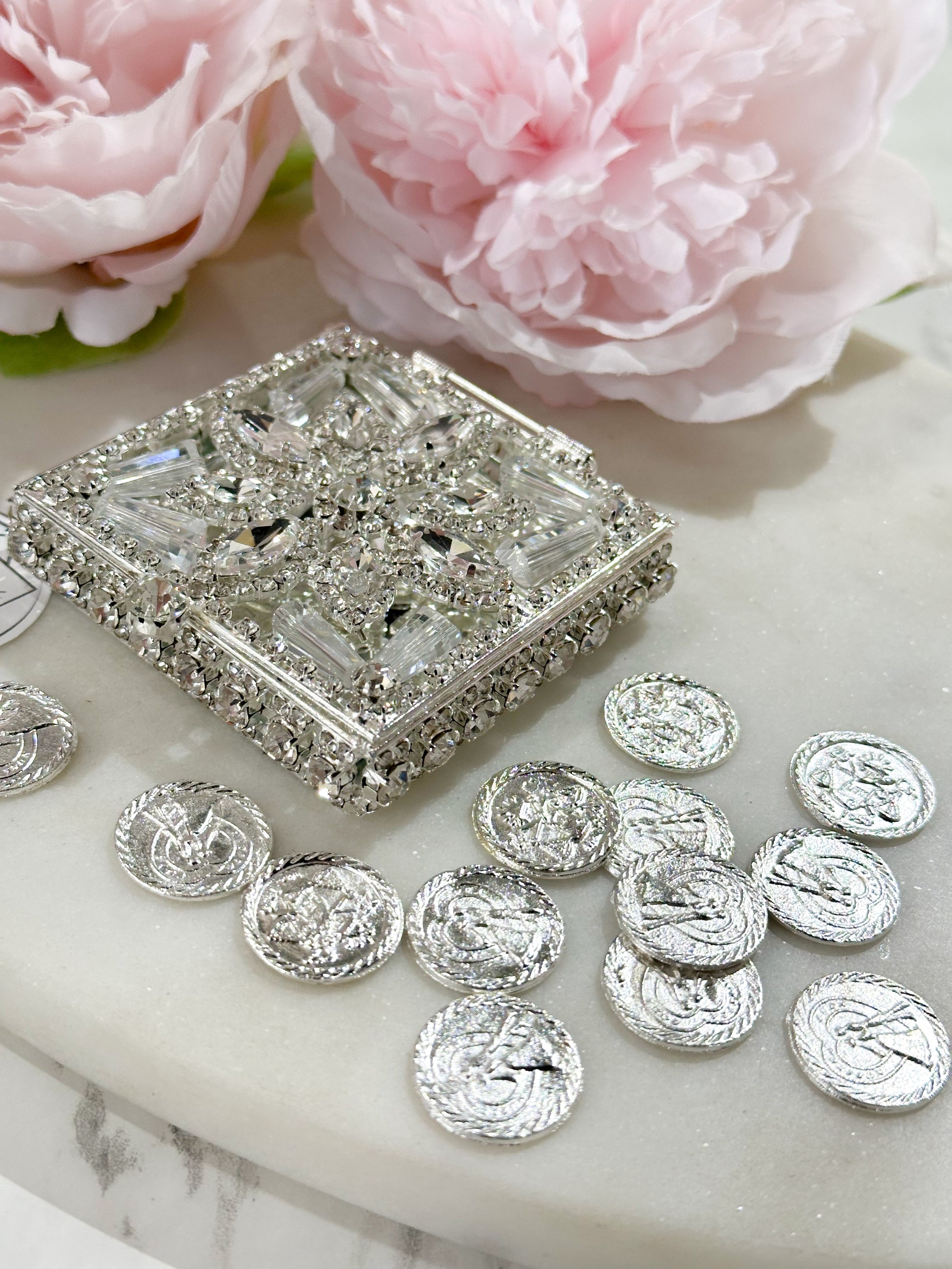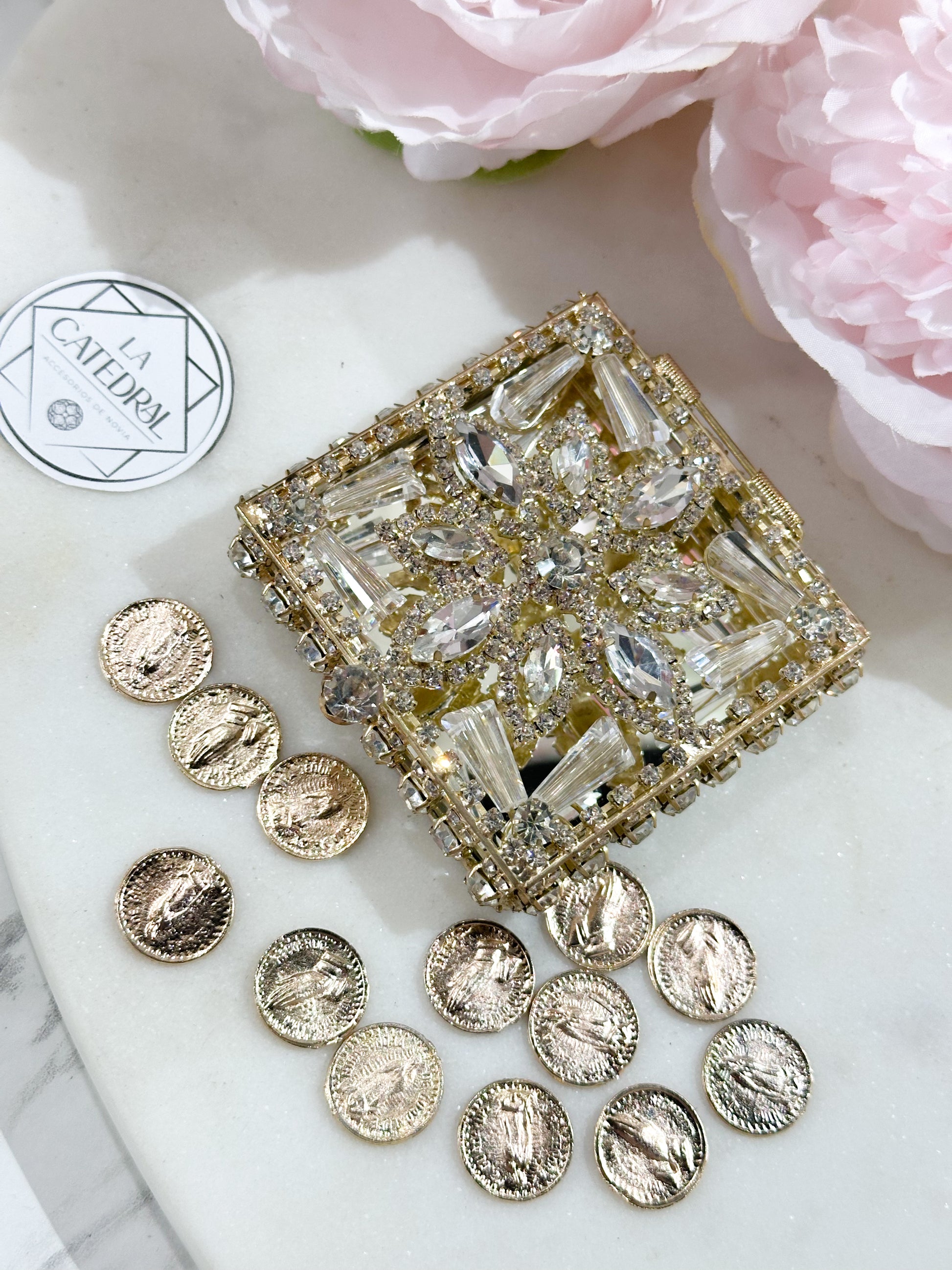 Material: Monedas en aleación de acero inoxidable en baño de rodio con su cofre de cristales austriacos y cristales rusos con forma de flor en aleación de metal con acero inoxidable de forma cuadrada