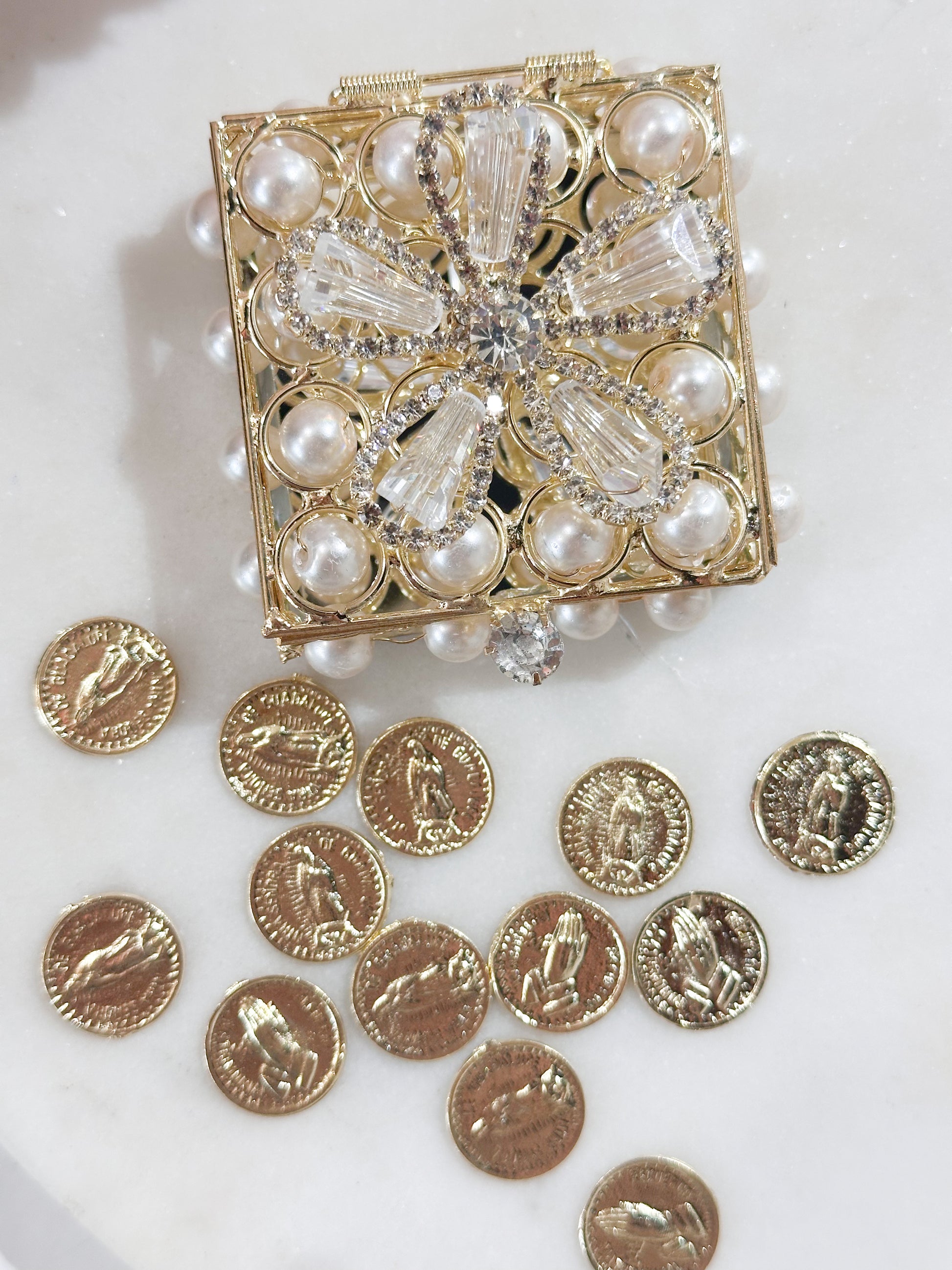 Material: Monedas en aleación de acero inoxidable en baño de rodio con su cofre de cristales austriacos y perlas sintéticas en aleación de metal con acero inoxidable de forma cuadrada