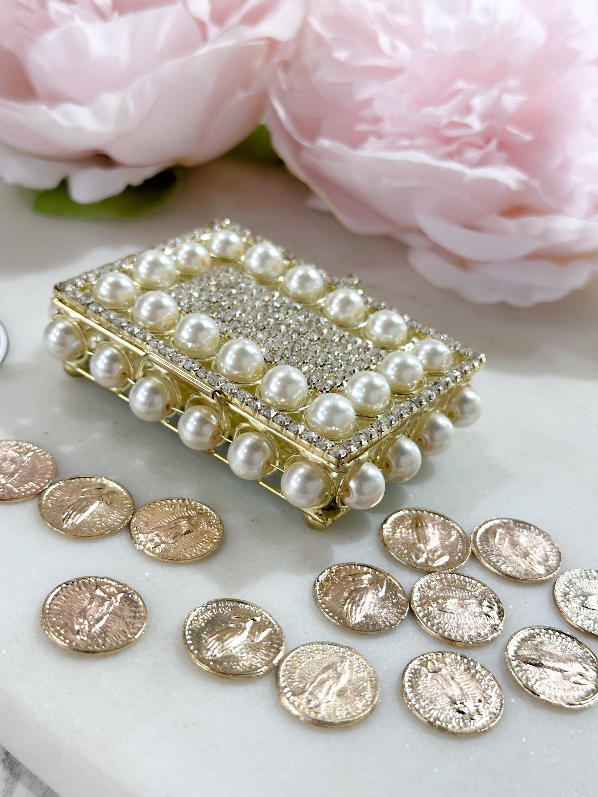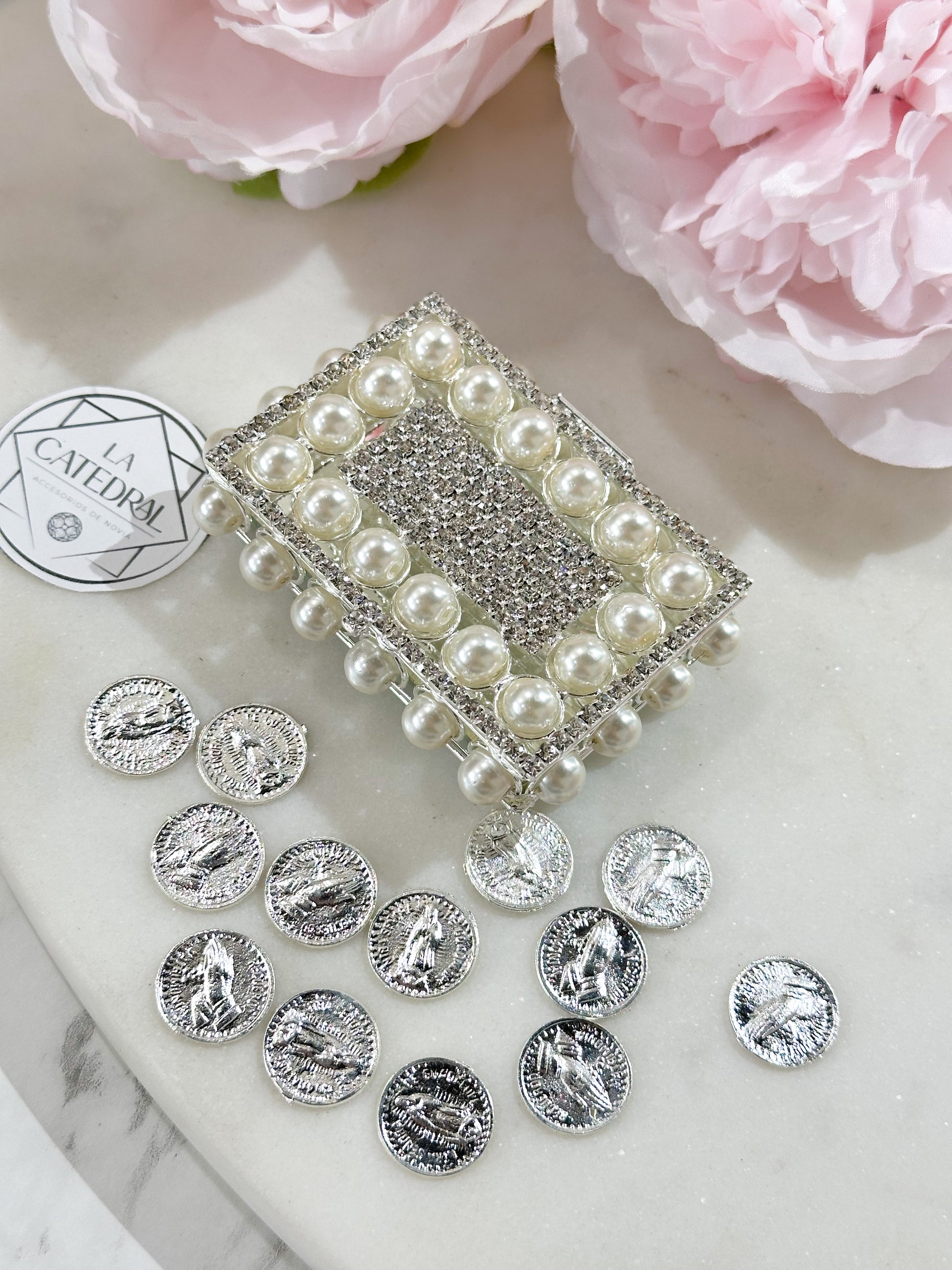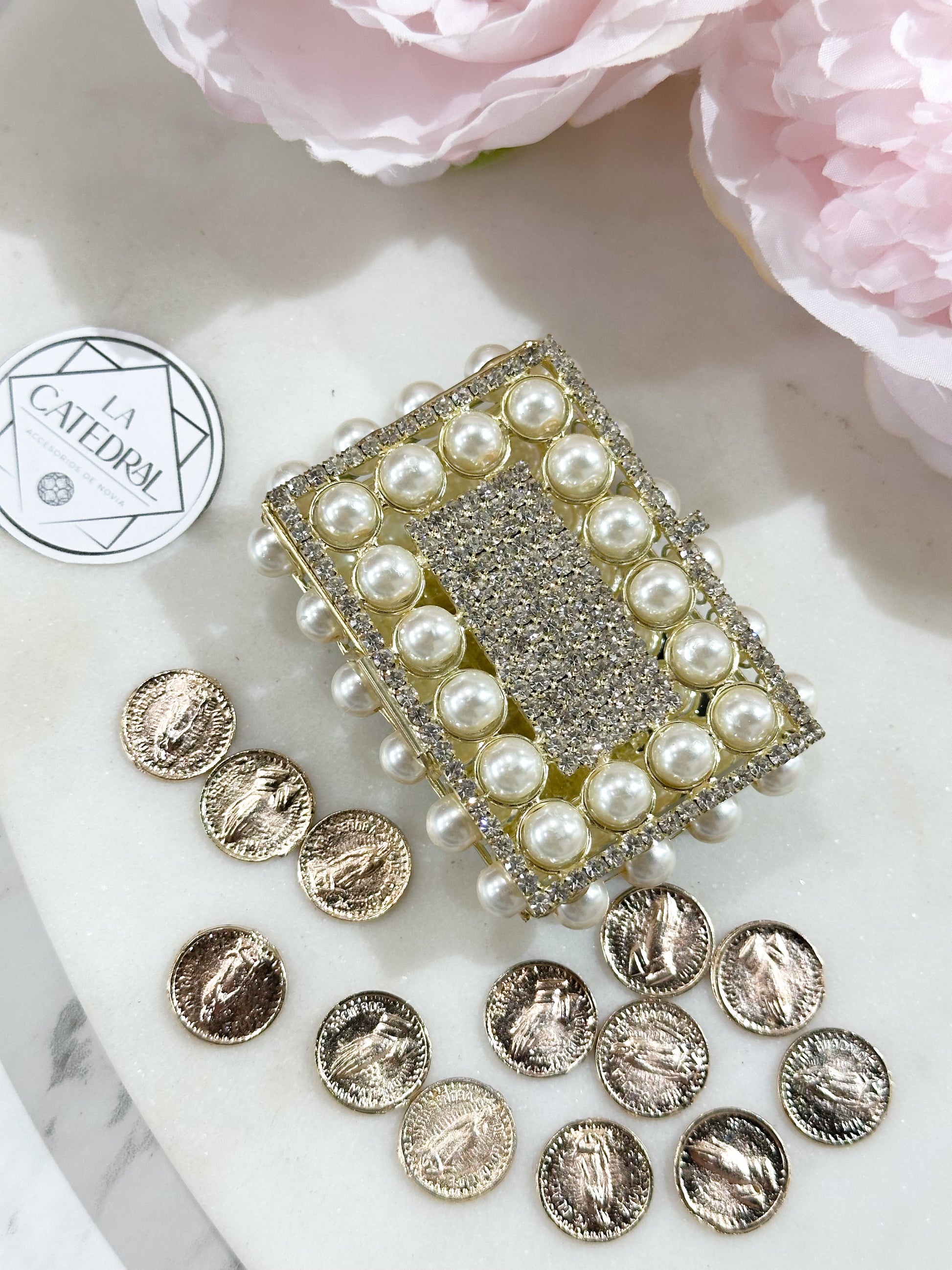 Material: Monedas en aleación de acero inoxidable en baño de rodio con su cofre de cristales austriacos y perlas sintéticas en aleación de metal con acero inoxidable de forma rectangular