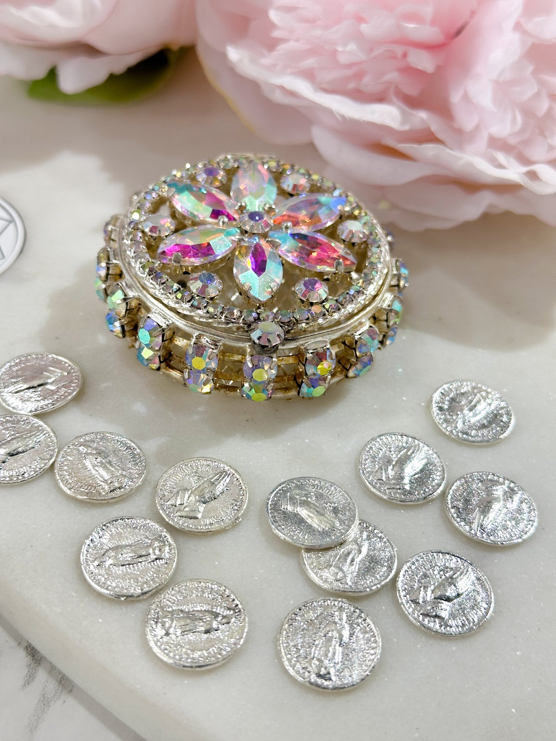 Material: Monedas en aleación de acero inoxidable en baño de rodio con su cofre de cristales austriacos color tornasol en aleación de metal con acero inoxidable de forma circular