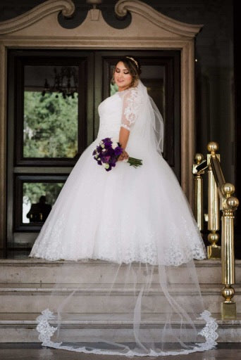 Velo catedral doble capa con peineta en tulle de seda montado con encaje grande bordado con lentejuela ideal para quien busca ese brillo extra en su look nupcial.