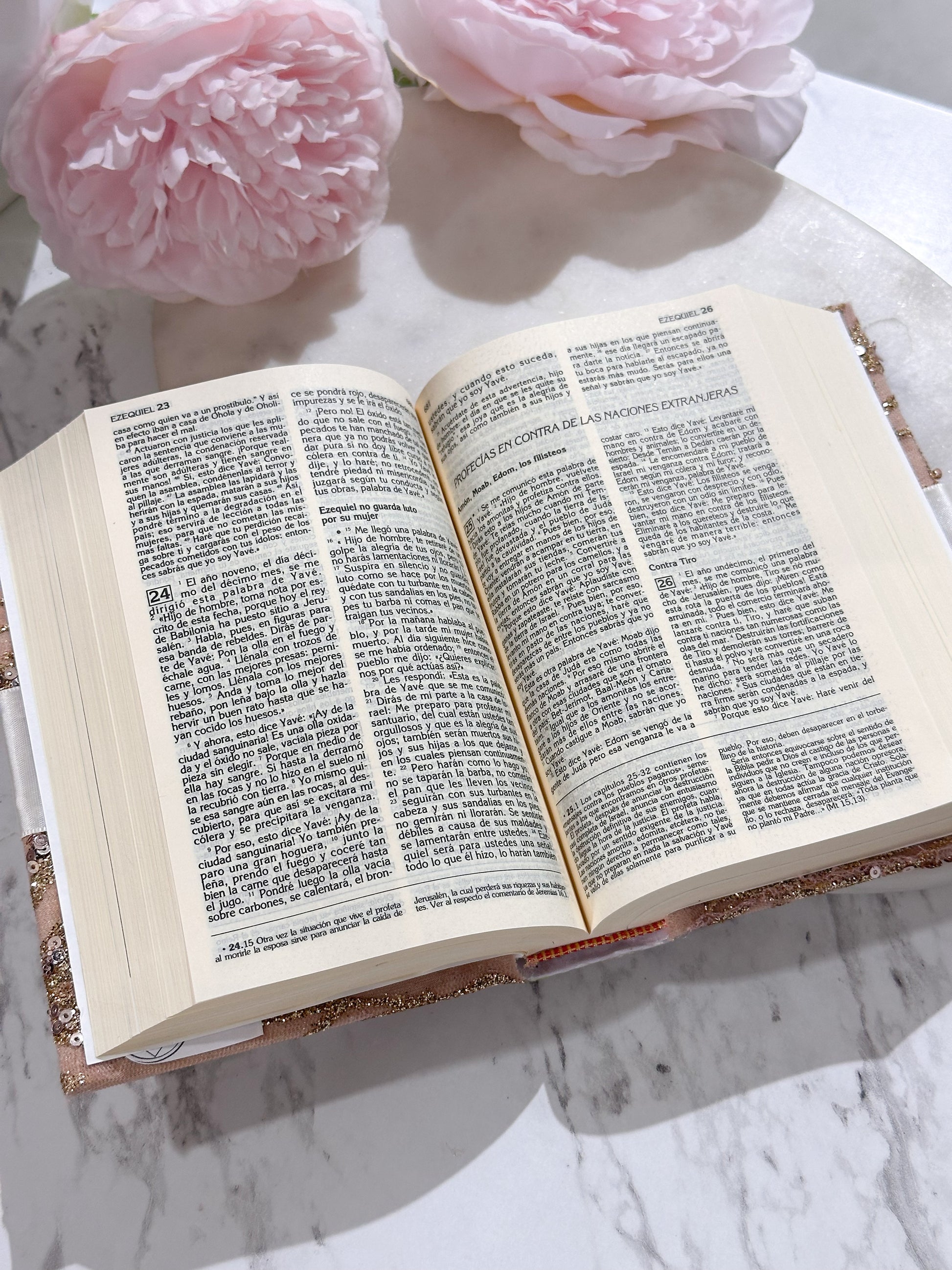 Material: biblia católica forrada en tulle rosegold con destellos en dorado.