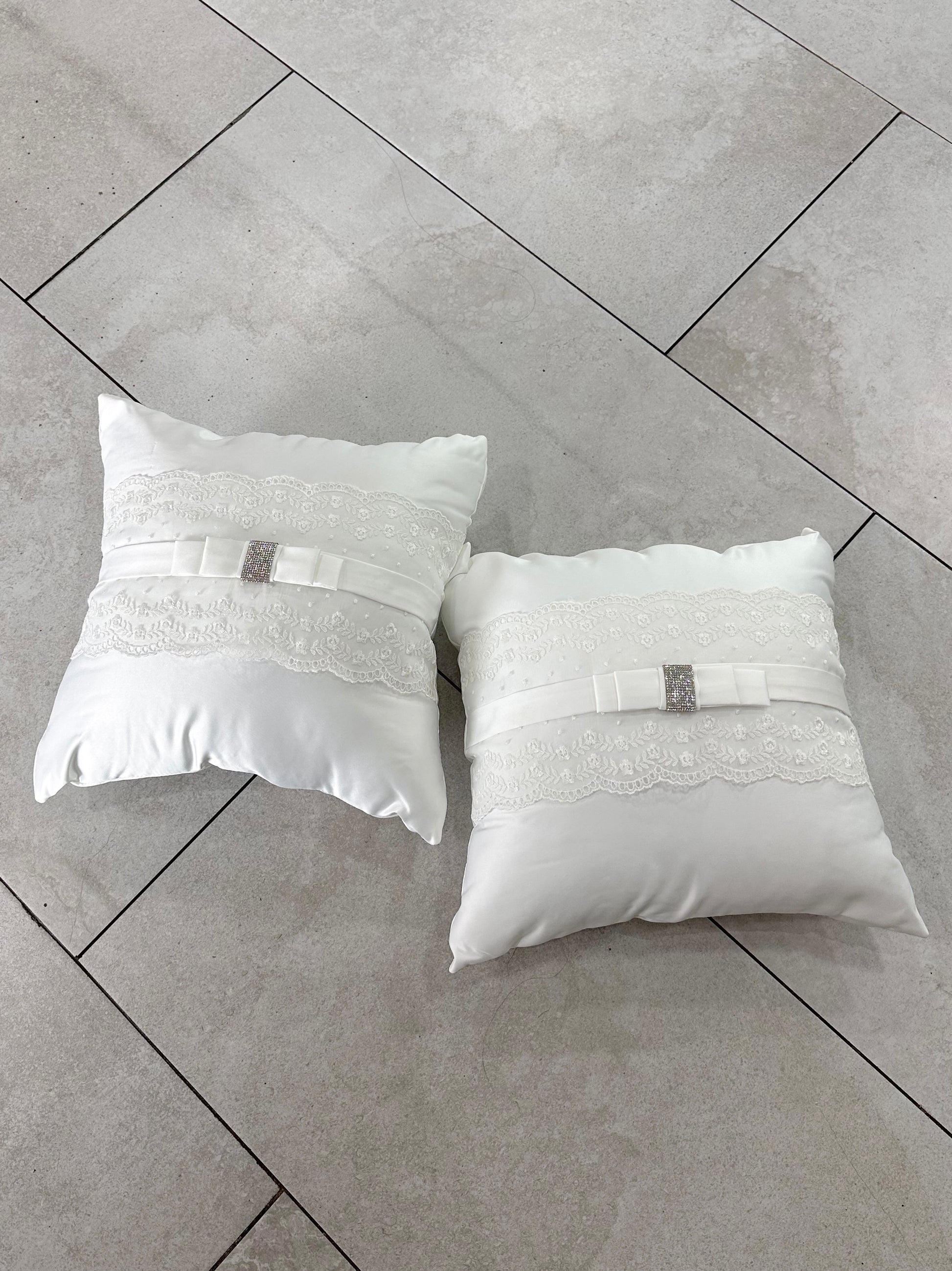Material: Par de cojines para ceremonia con moño de satinado con cristales y encaje sutil.