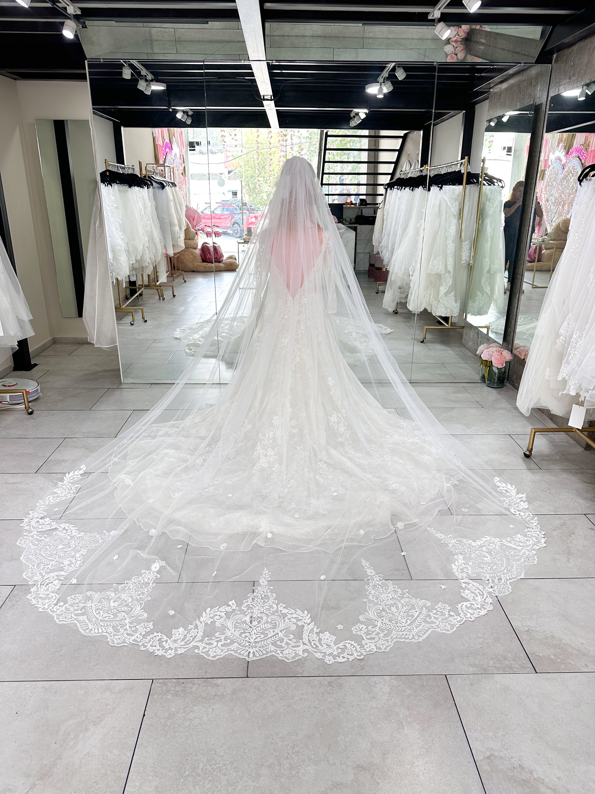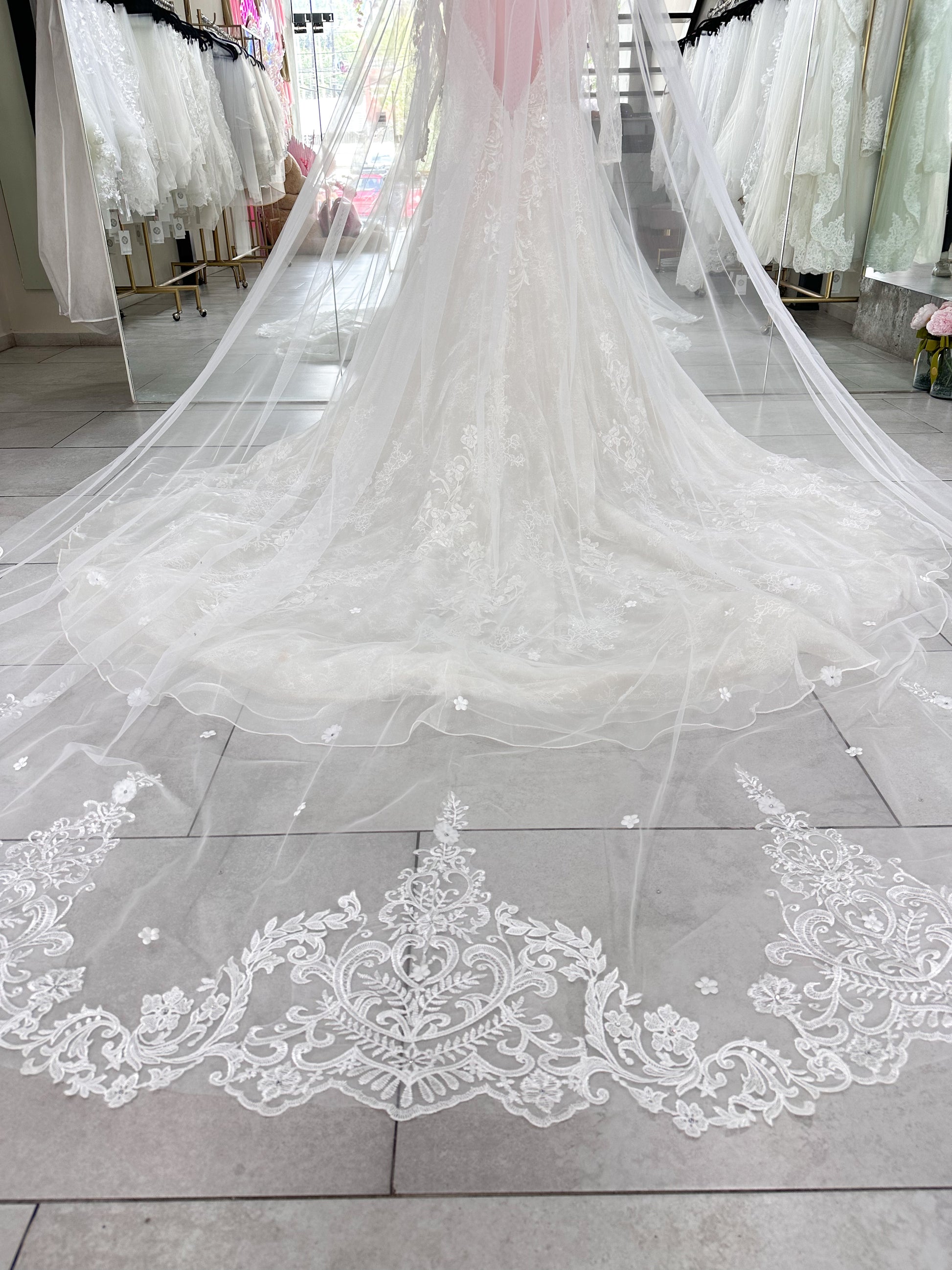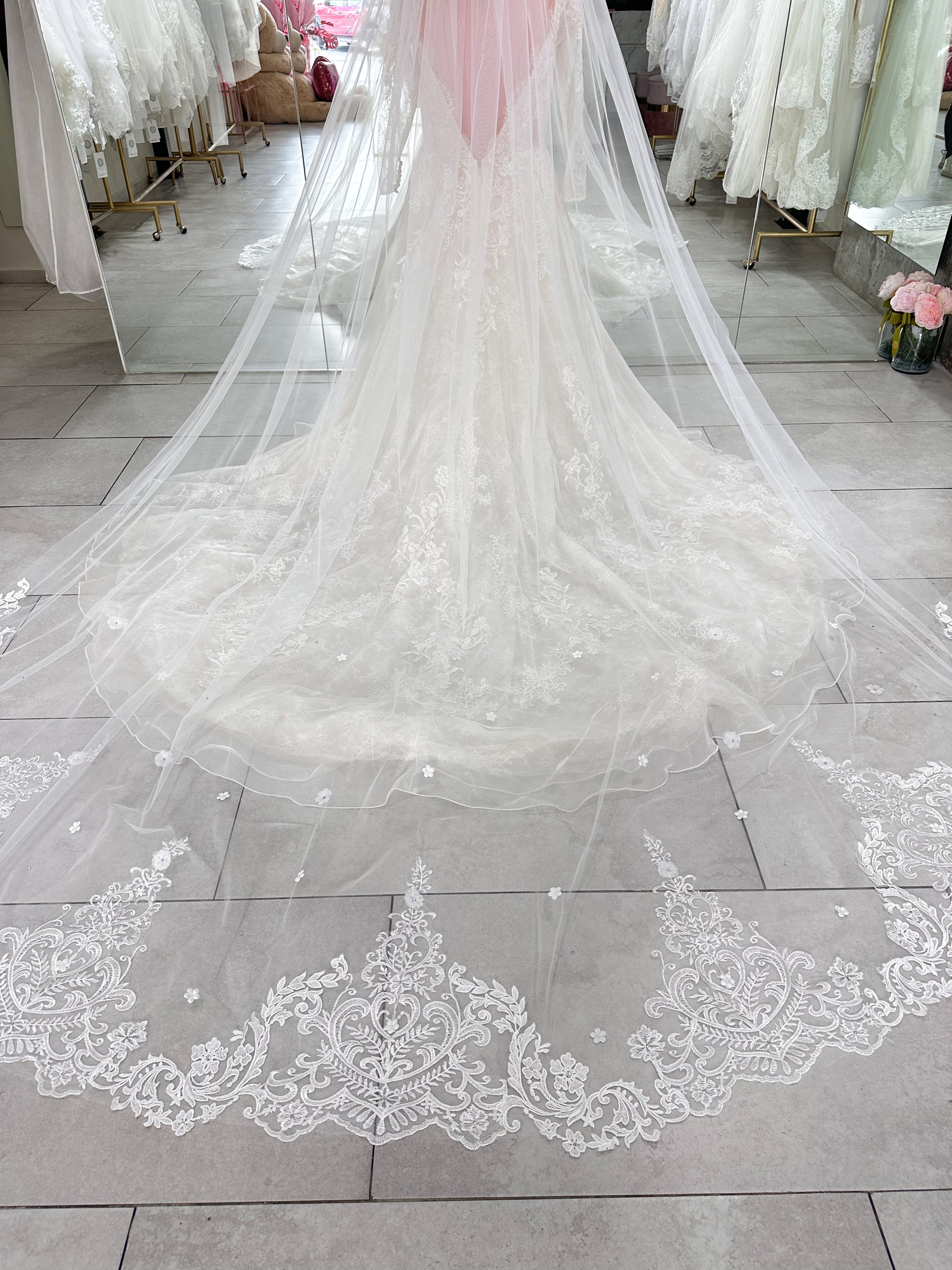 Velo de una capa en tulle de seda italiano con un encaje extra grande al final para enmarcar y detalles de flores de seda 3D con cristales austriacos esporádicos para crear un look altamente elegante y romántico con un toque moderno y fresco.