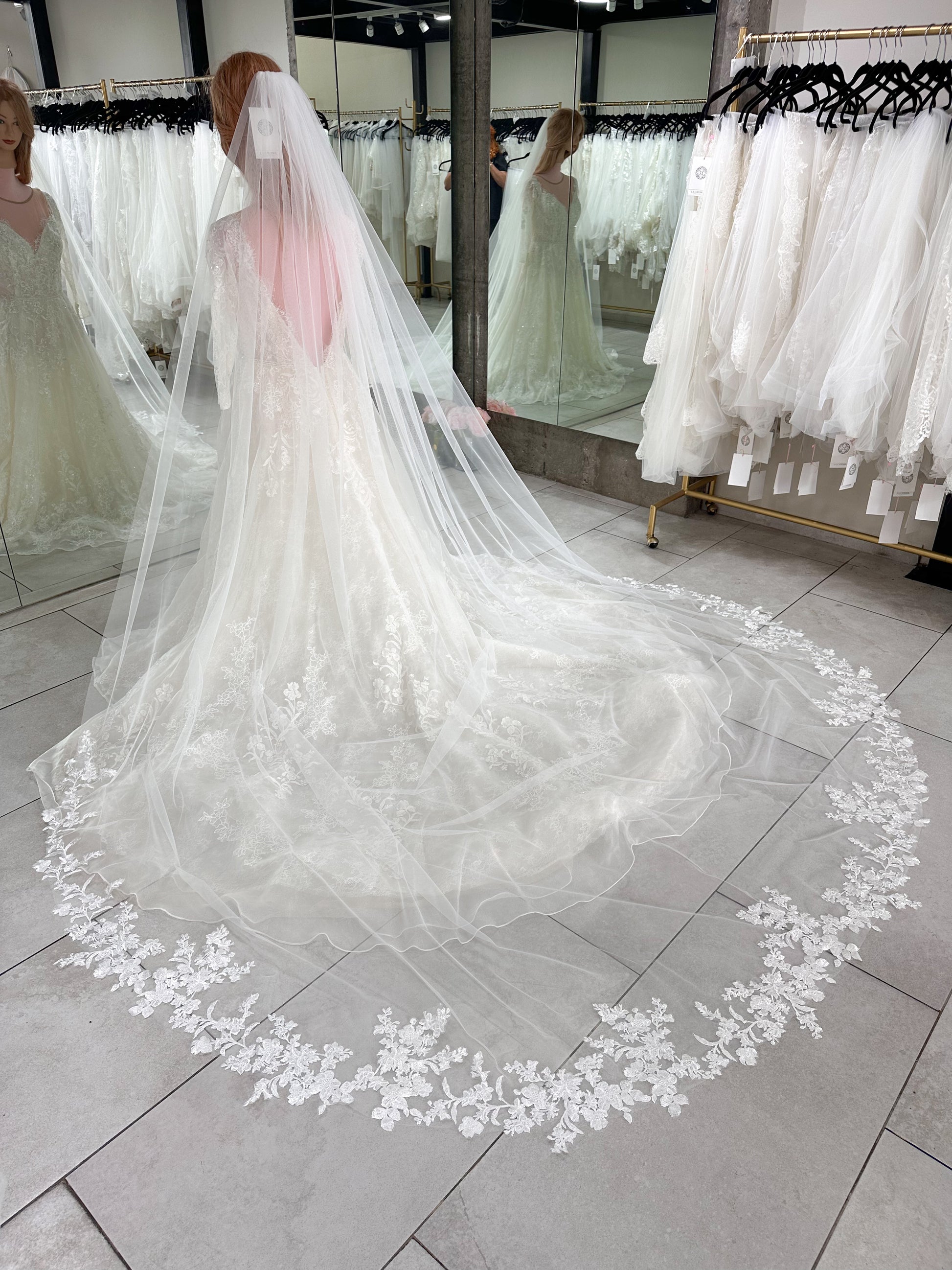 Velo de una capa en tulle de seda con delicadas aplicaciones de flores y hojas montadas al final del velo para enmarcar la belleza de tu vestido.