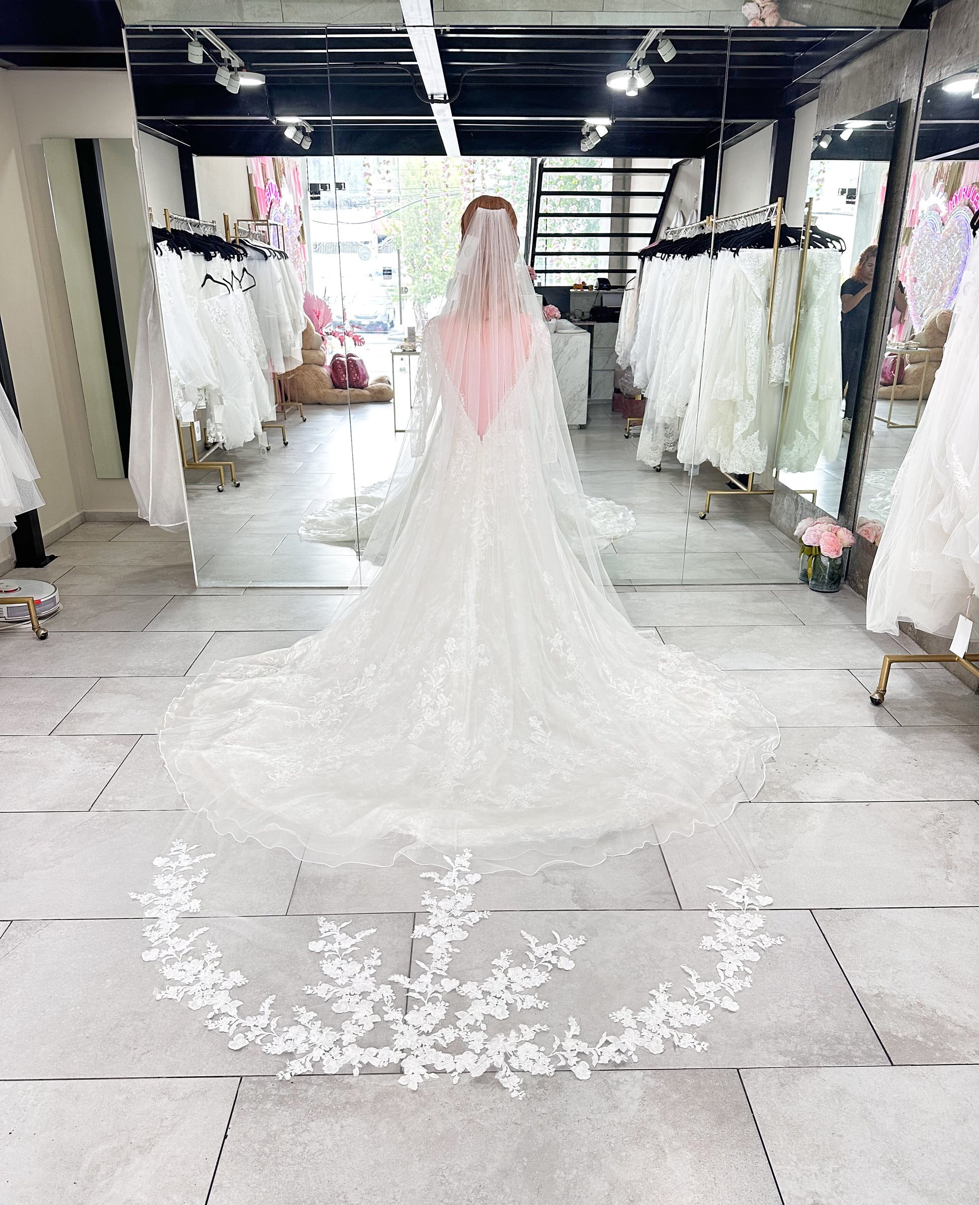 Velo catedral una capa con peineta, montada en tulle de seda cristal con aplicaciones exquisitas de flores y hojas al final cargando el diseño para que realce la cauda de tu vestido.