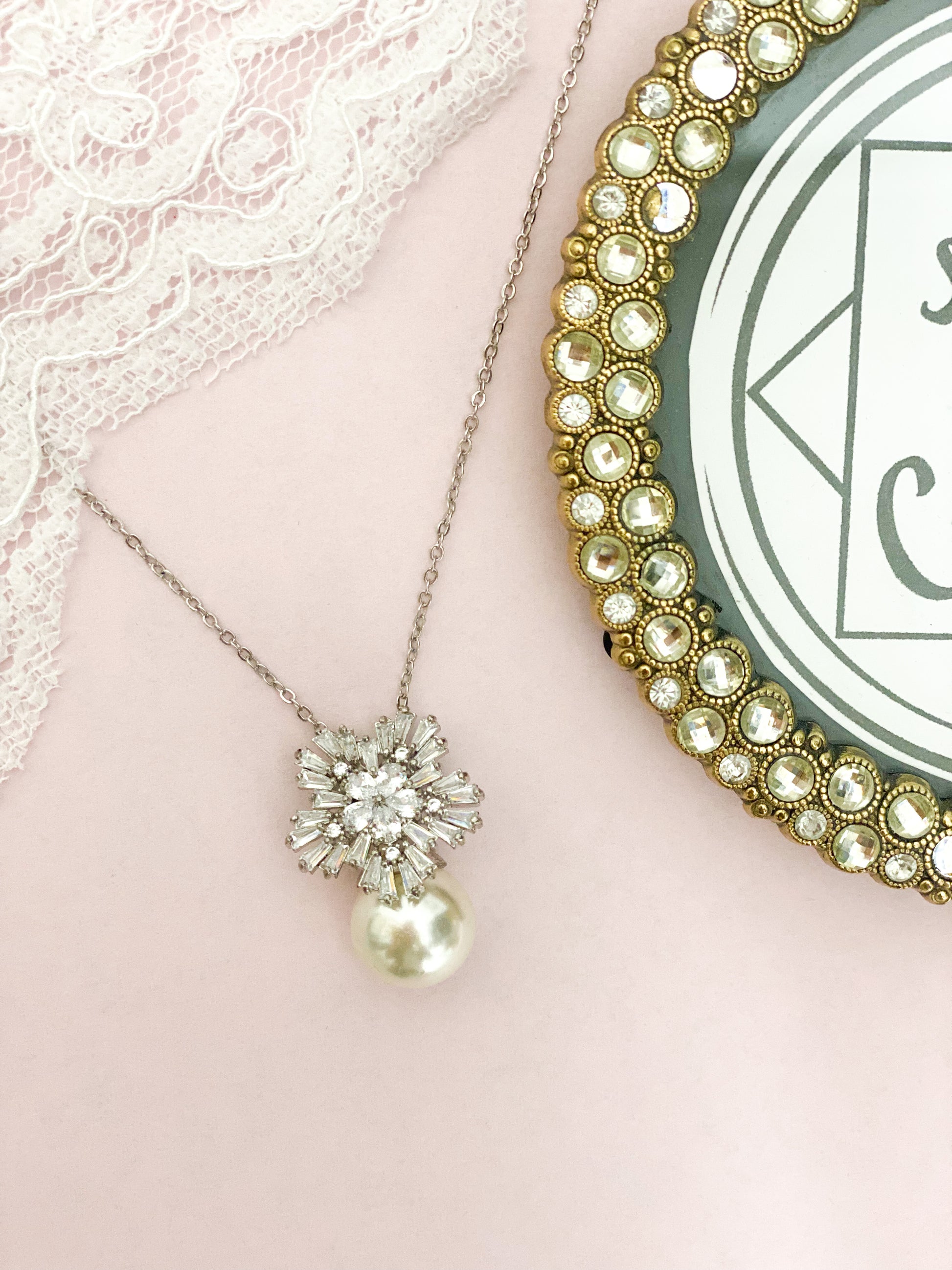 Material: Zirconia en baño de rodio y perla sintetica grande con cadena de aleación de acero inoxidable en baño de rodio