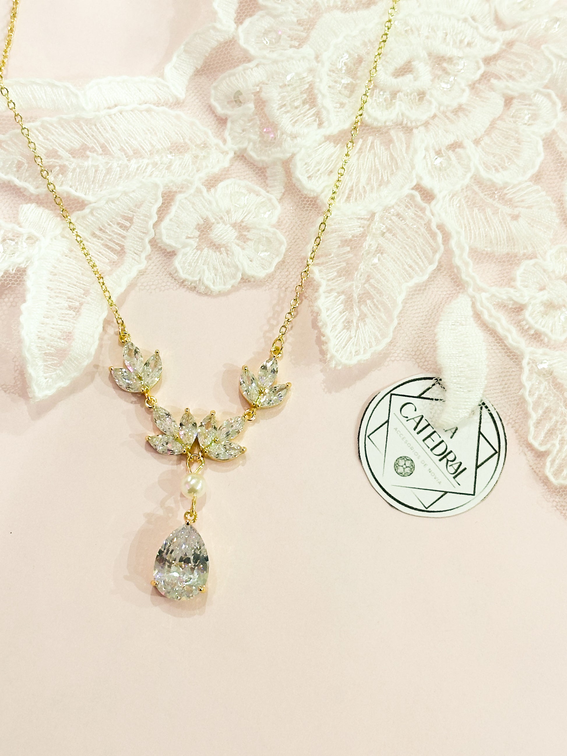 Material: Zirconia de gotas y hojas con cadena en aleación de acero inoxidable en baño de rodio y perla de rio sintética