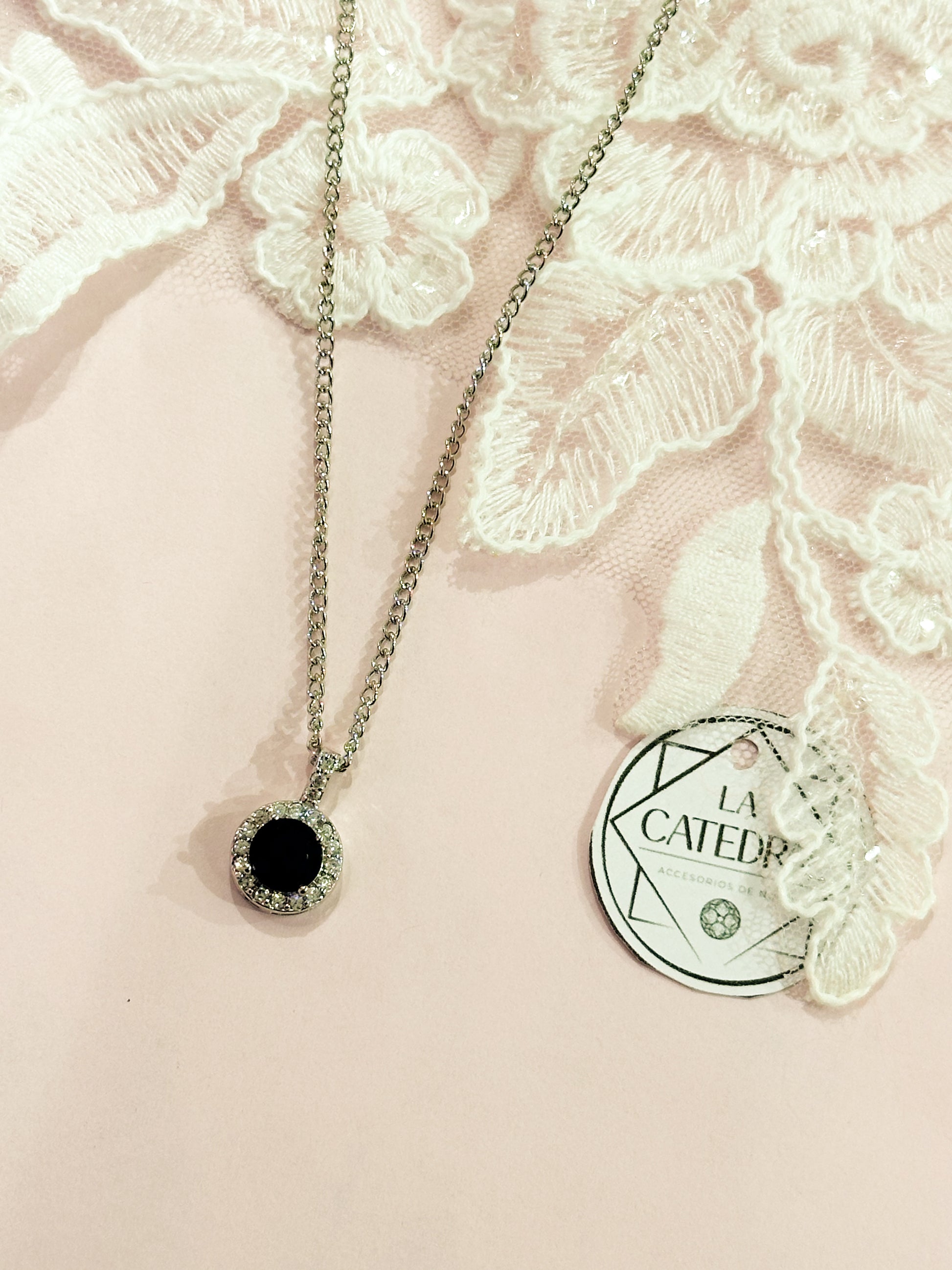 Material: Zirconia circular con halo en cadena con aleación de acero inoxidable en baño de rodio y perla de rio