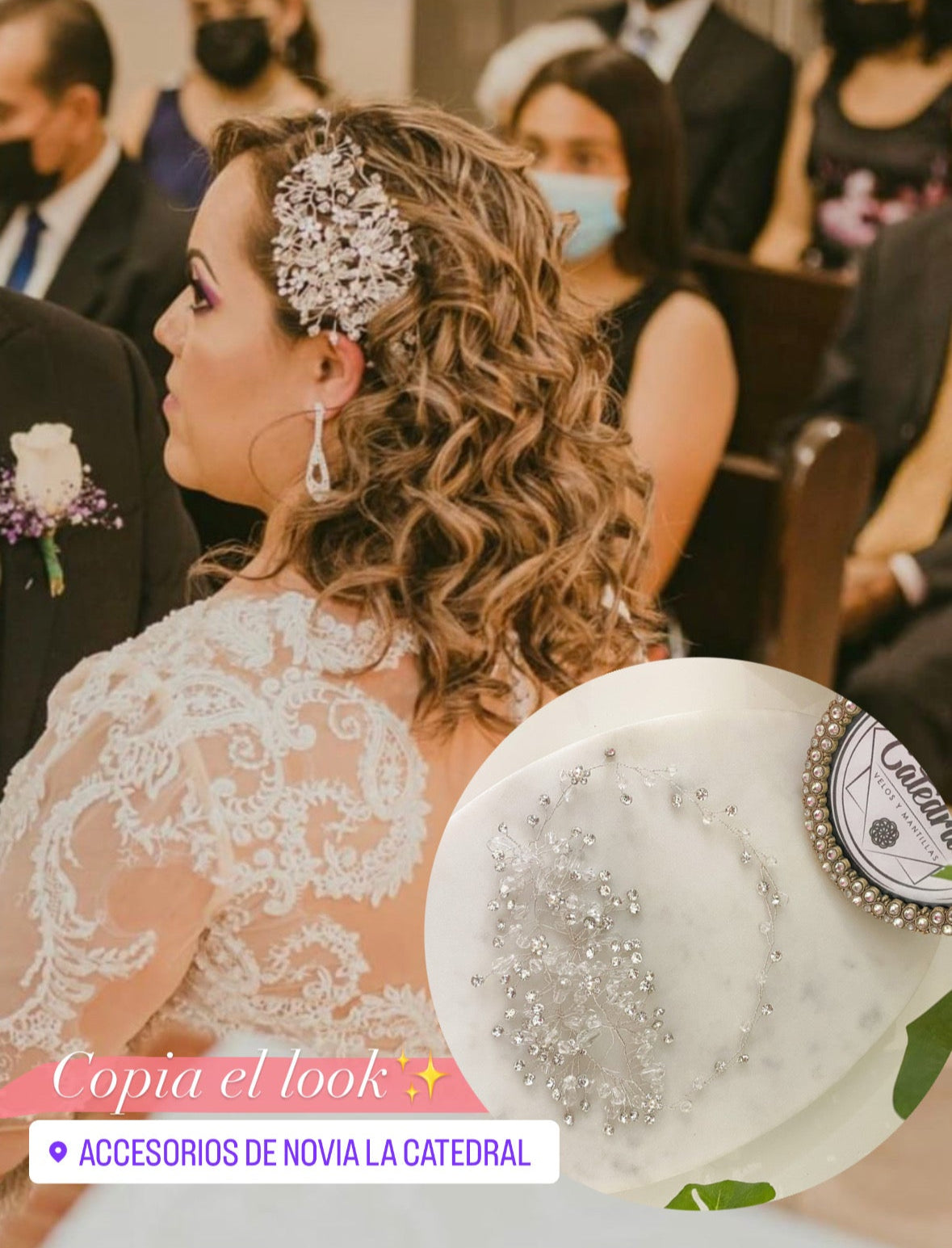 Guía Flexible estilo tocado para usarse de lado o por detrás de tu peinado con cristales que reflejan la luz.