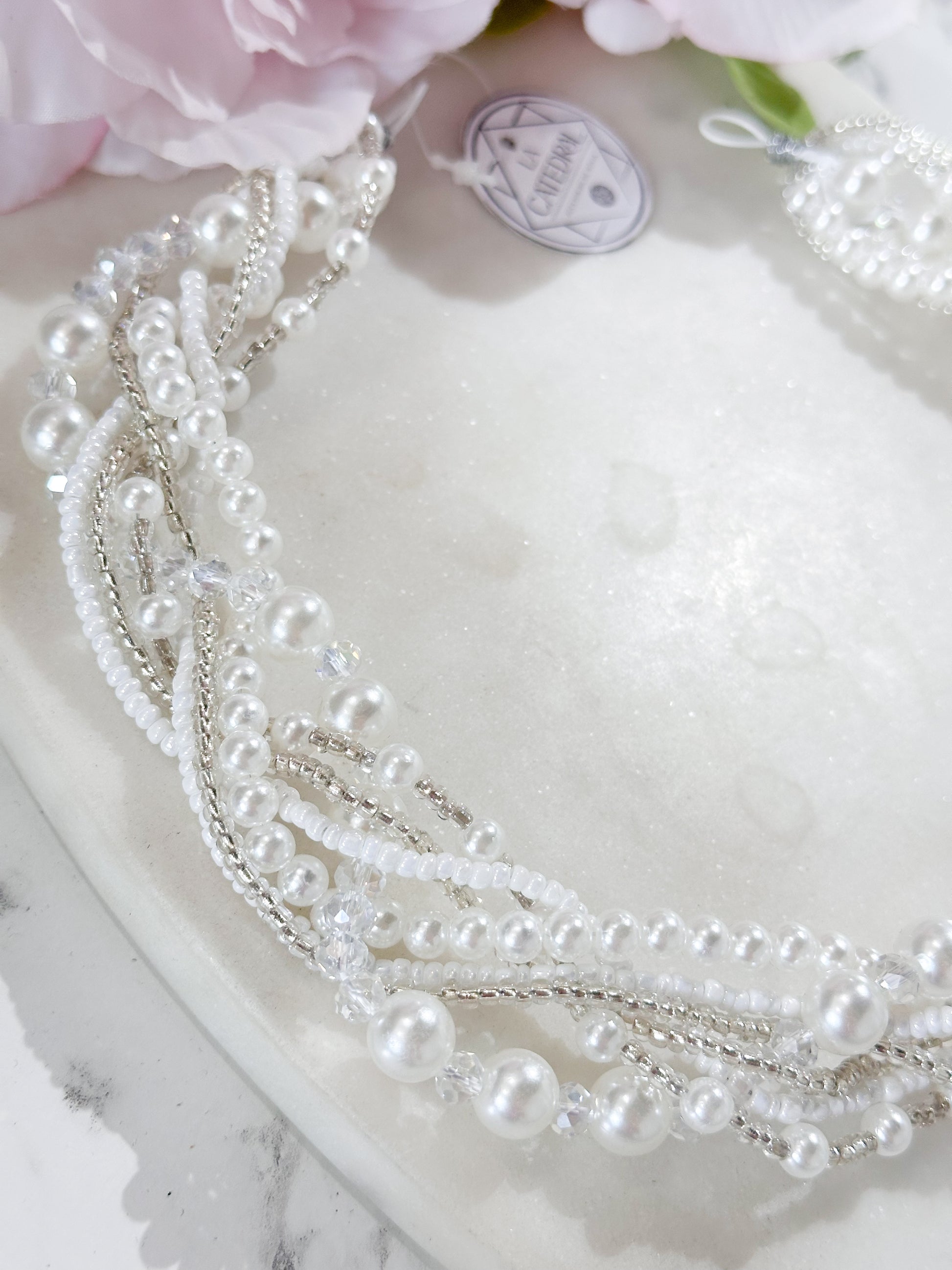 Material: Cristal ruso, chaquiras, chaquirones y perlas sintéticas entrelazadas
