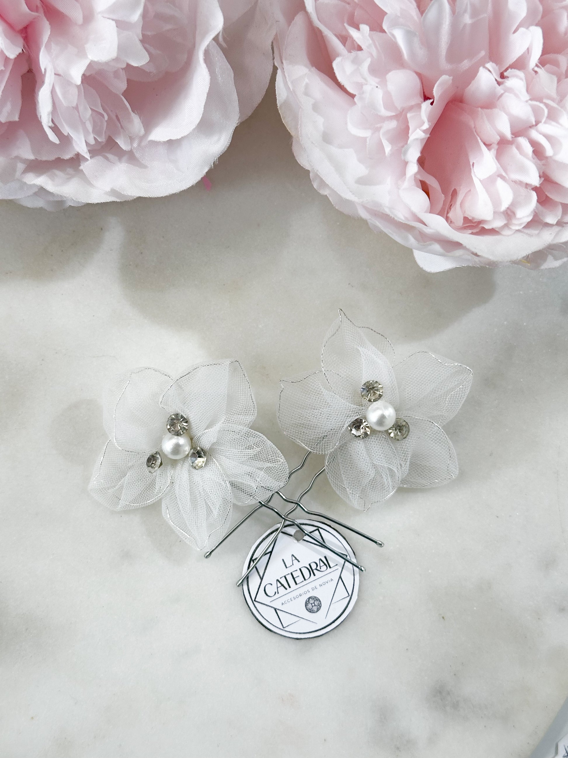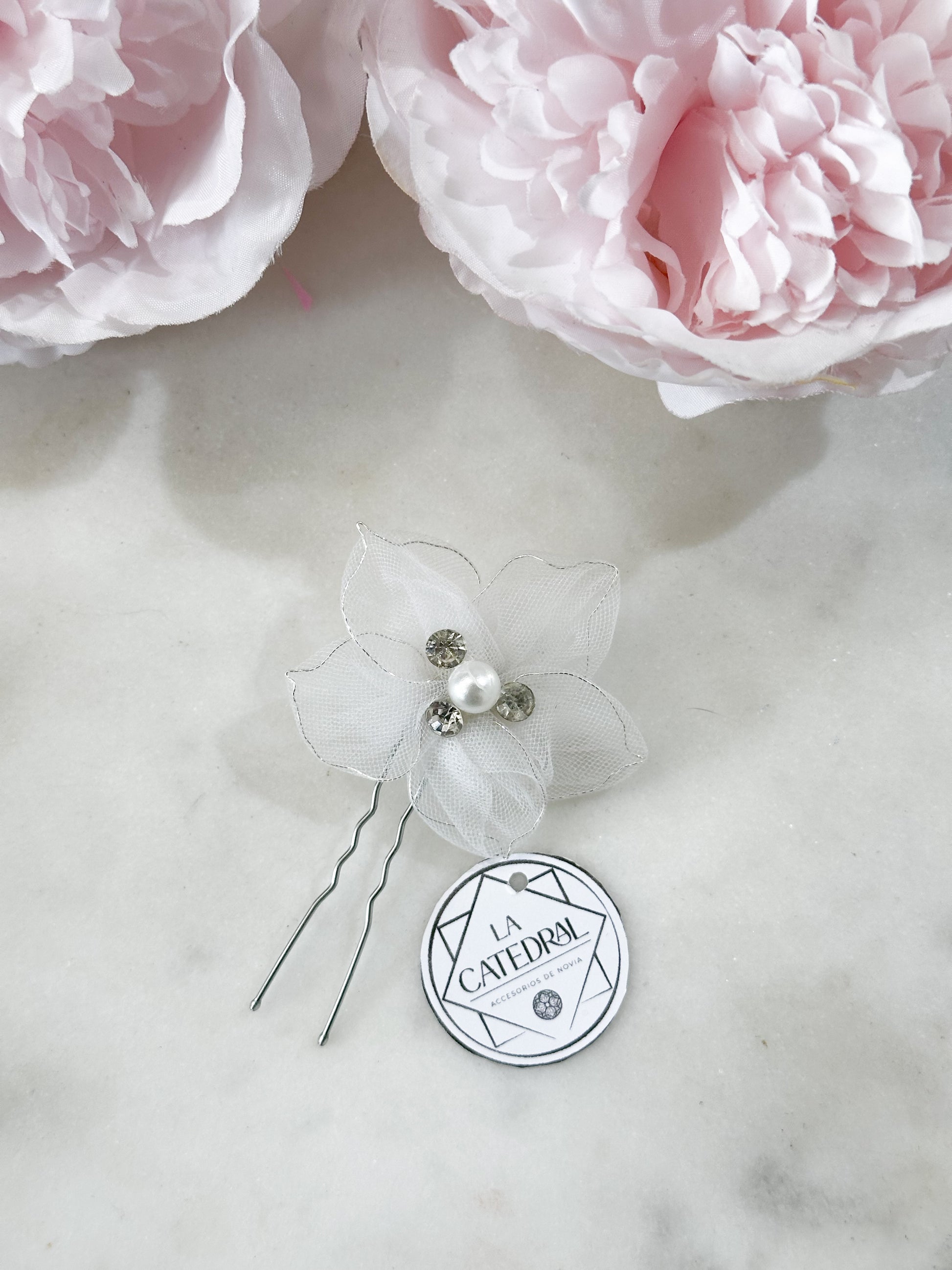 Material: Flor de tulle con perlas sintéticas y cristales austriacos