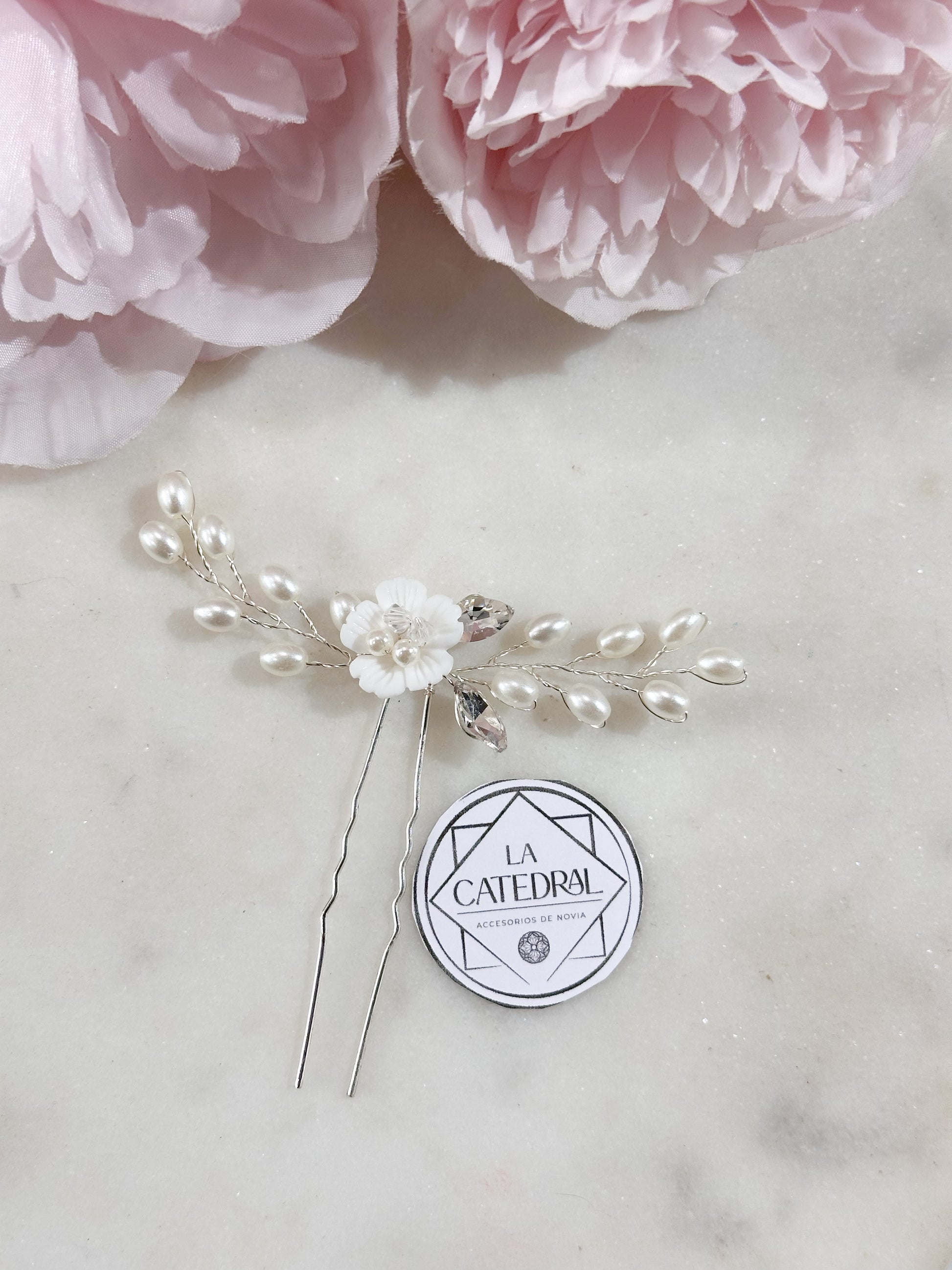 Material: Perlas sintéticas con cristales austriacos y flor de porcelana