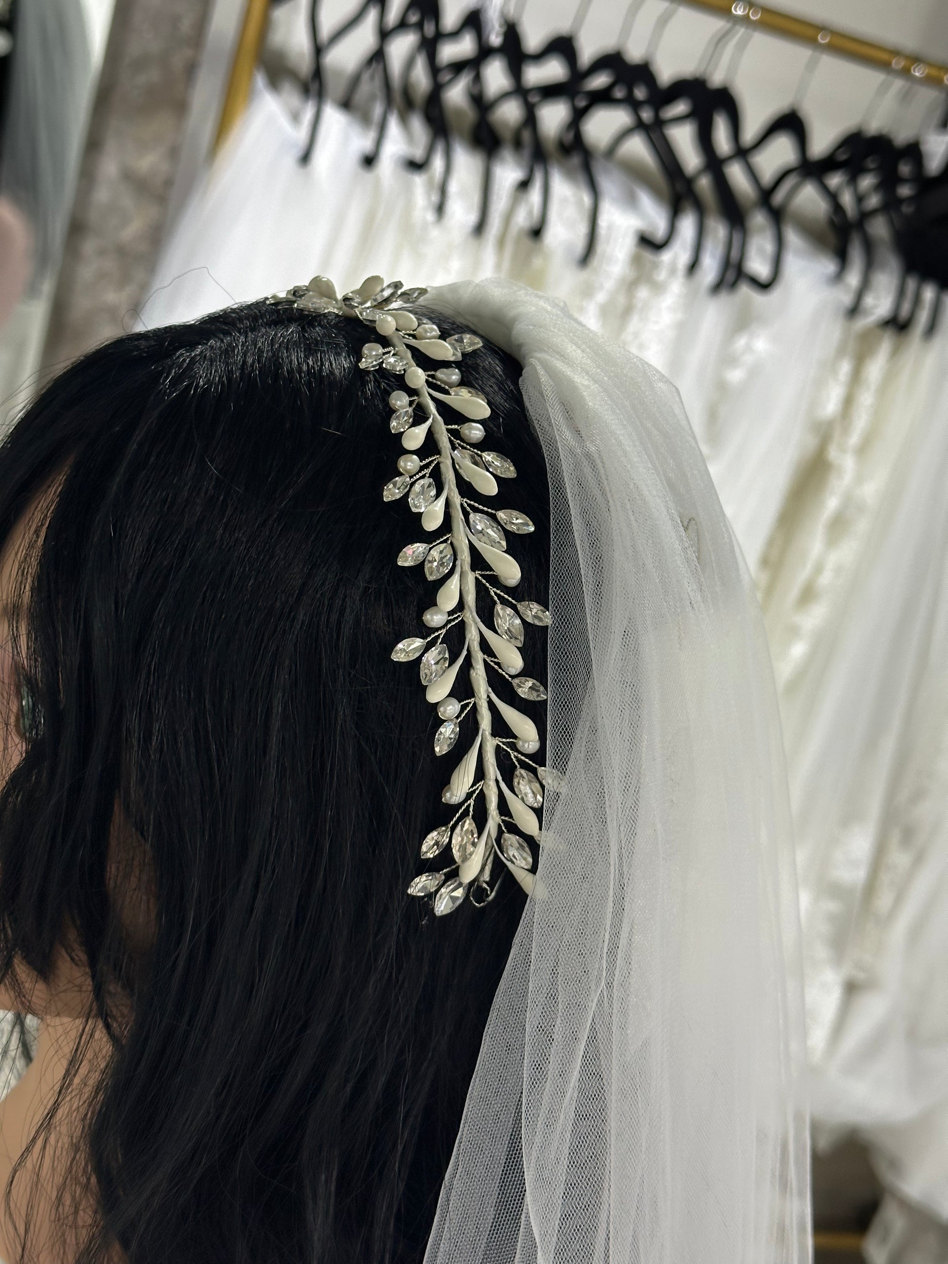 Material: Perlas sintéticas chicas, cristales austriacos y azahares naturales de cera