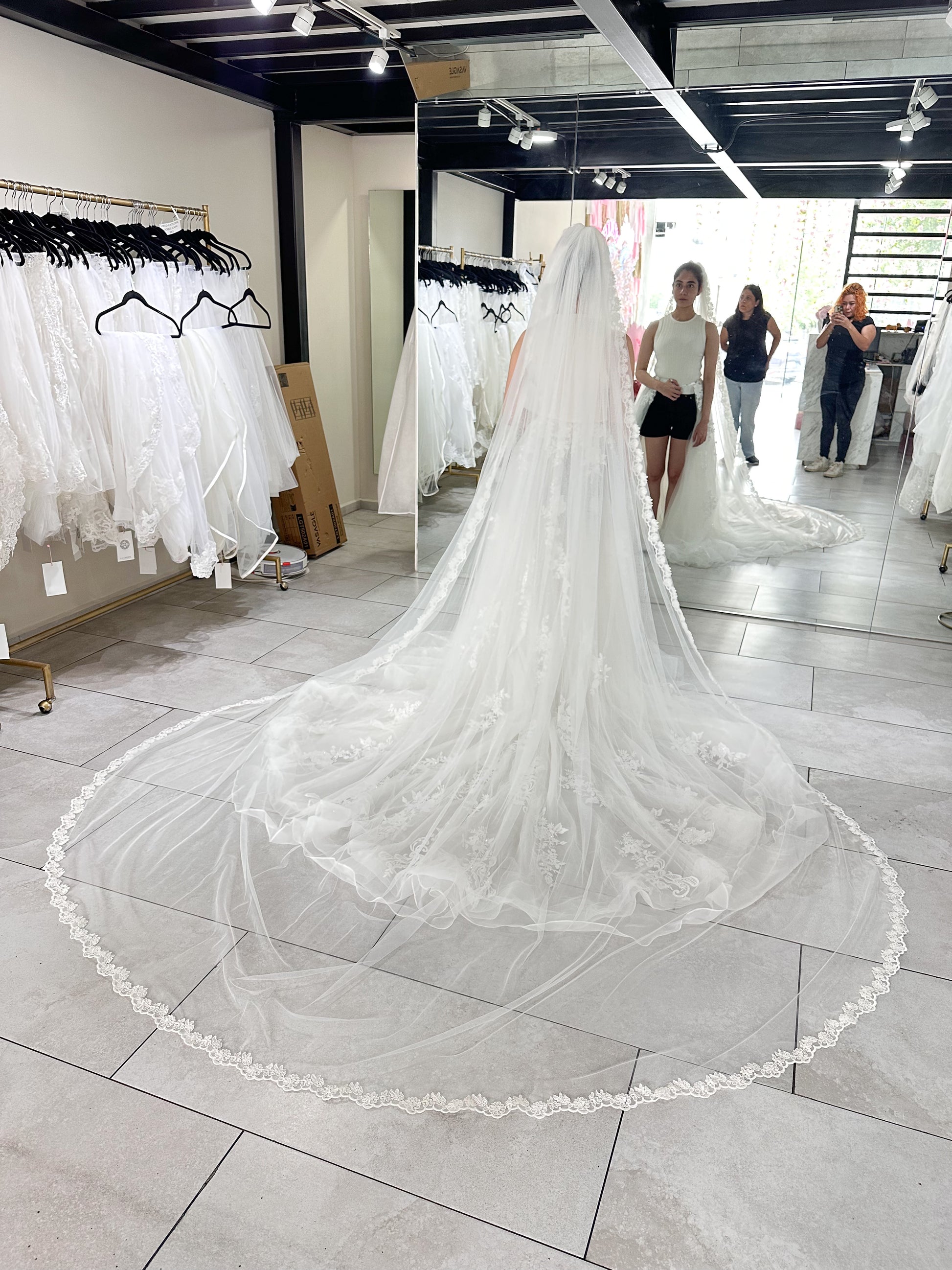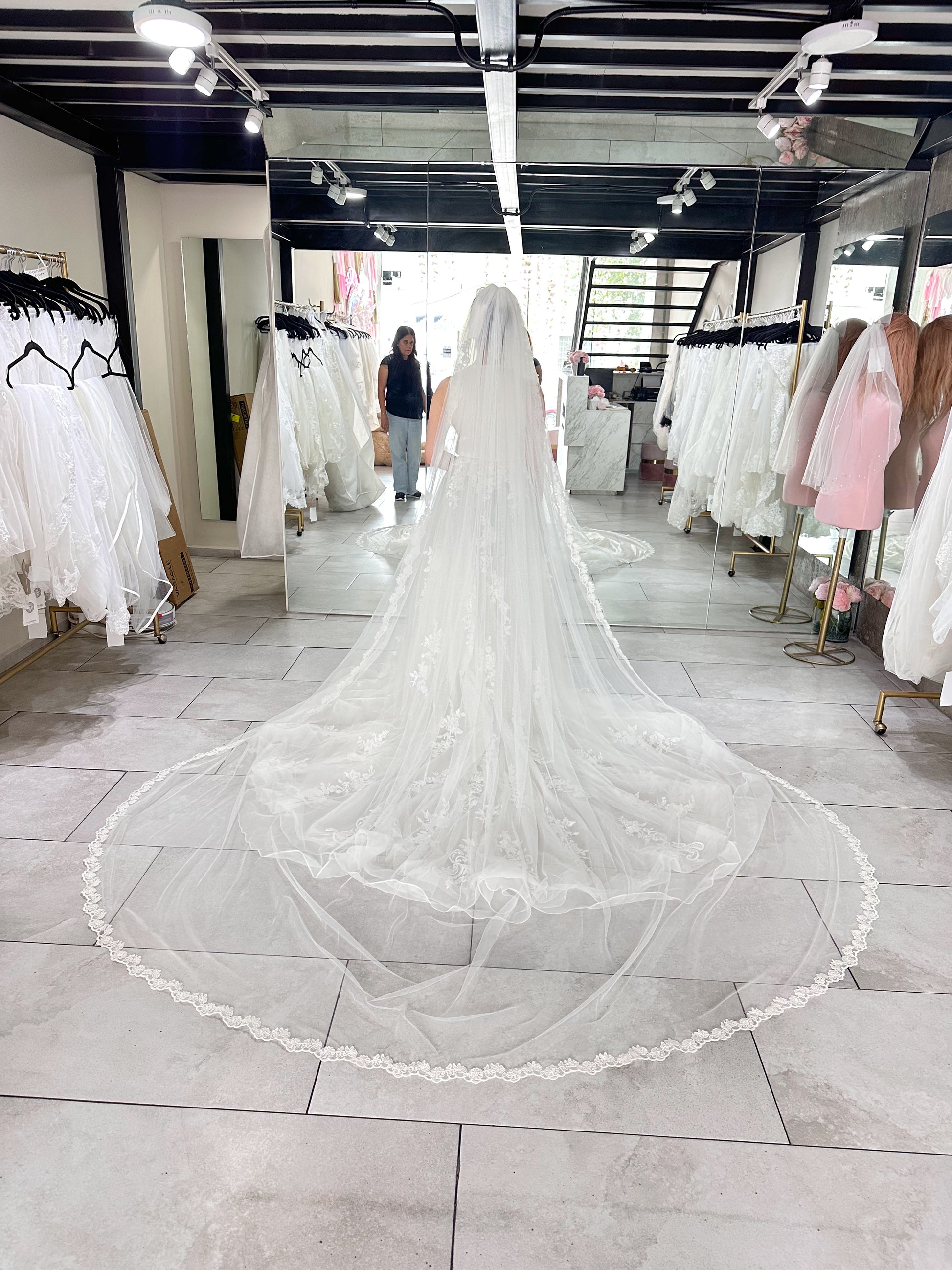 Velo catedral una capa con peineta, montada en tulle de seda puro con encaje de algodón exquisito de flores y hojas para un look muy fresco y elegante.