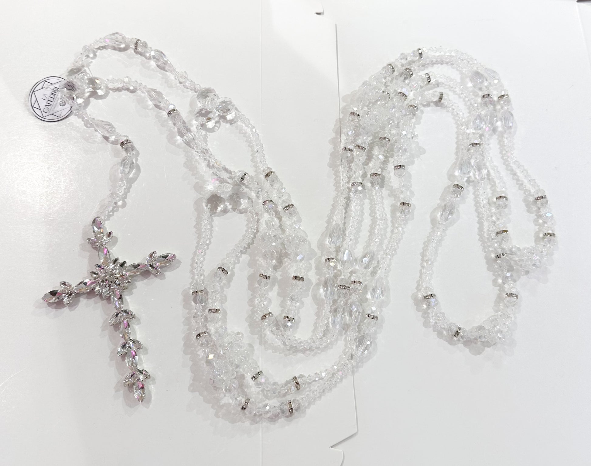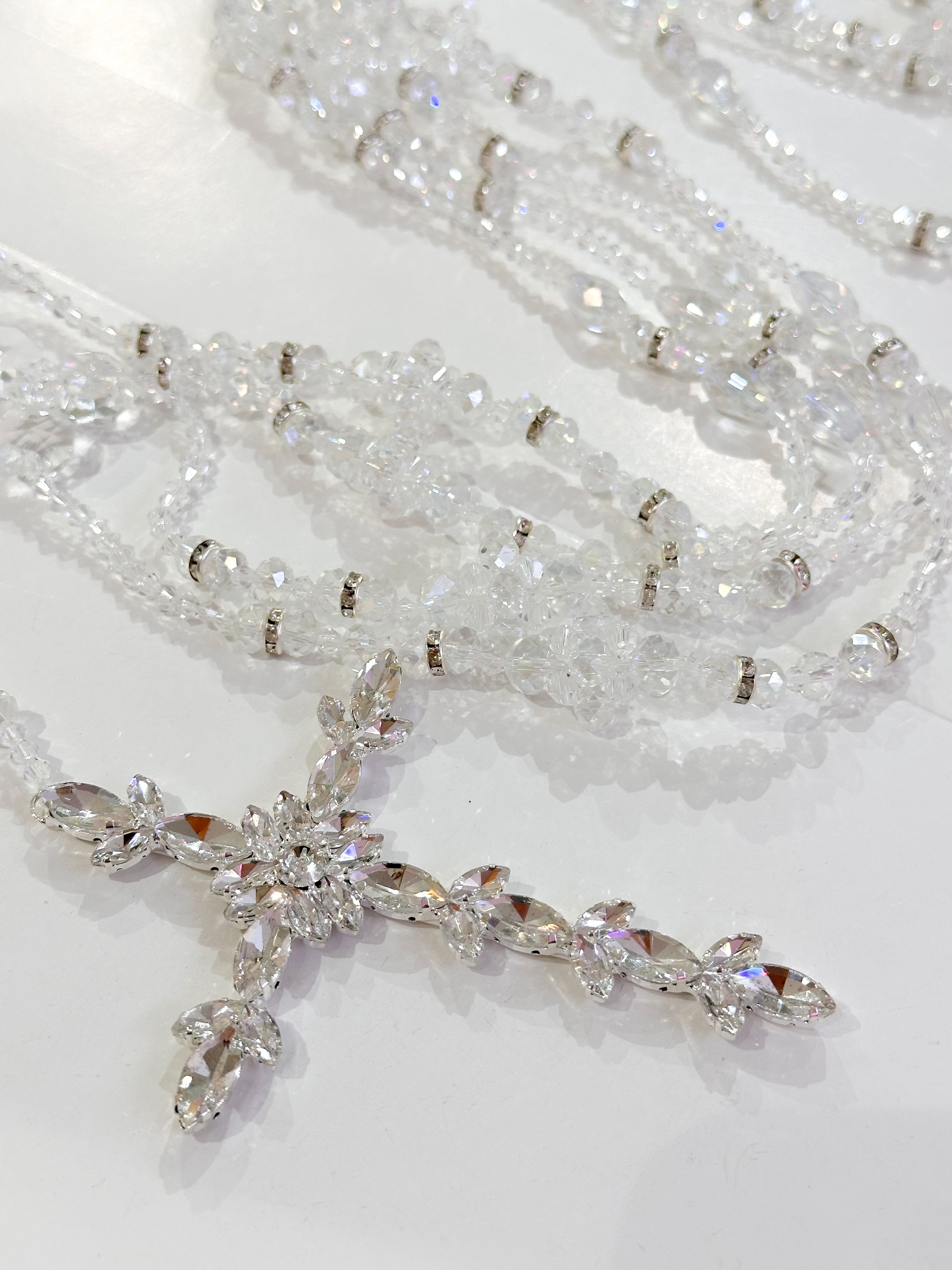 Material: Cristal checo con esferas platinadas, cristal de roca y argollas con cristales, cruz exquisita sin Cristo en baño de plata con cristales austriacos
