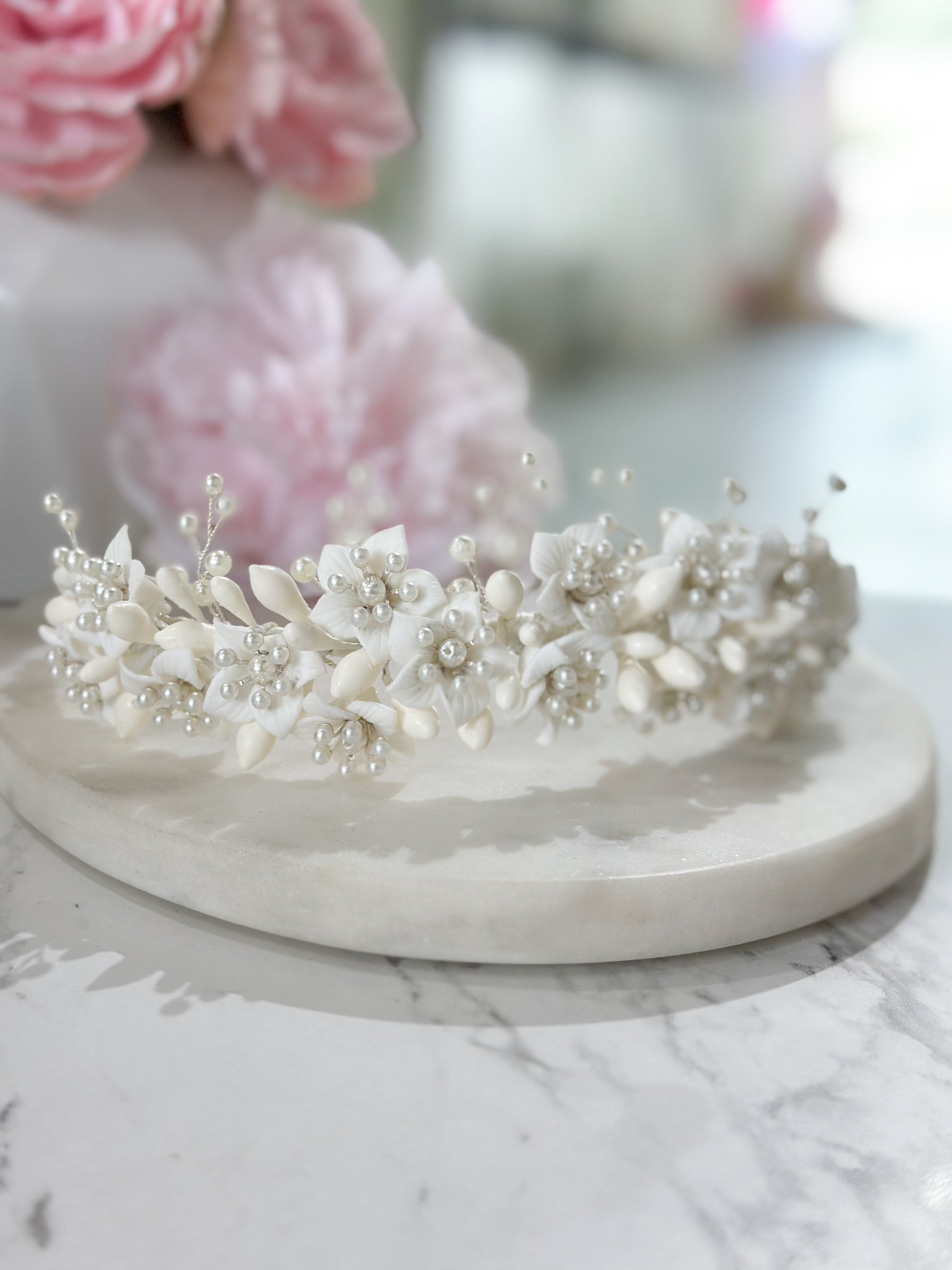 Material: Perlas sintéticas medianas, flores de porcelana y azahares de cera natural