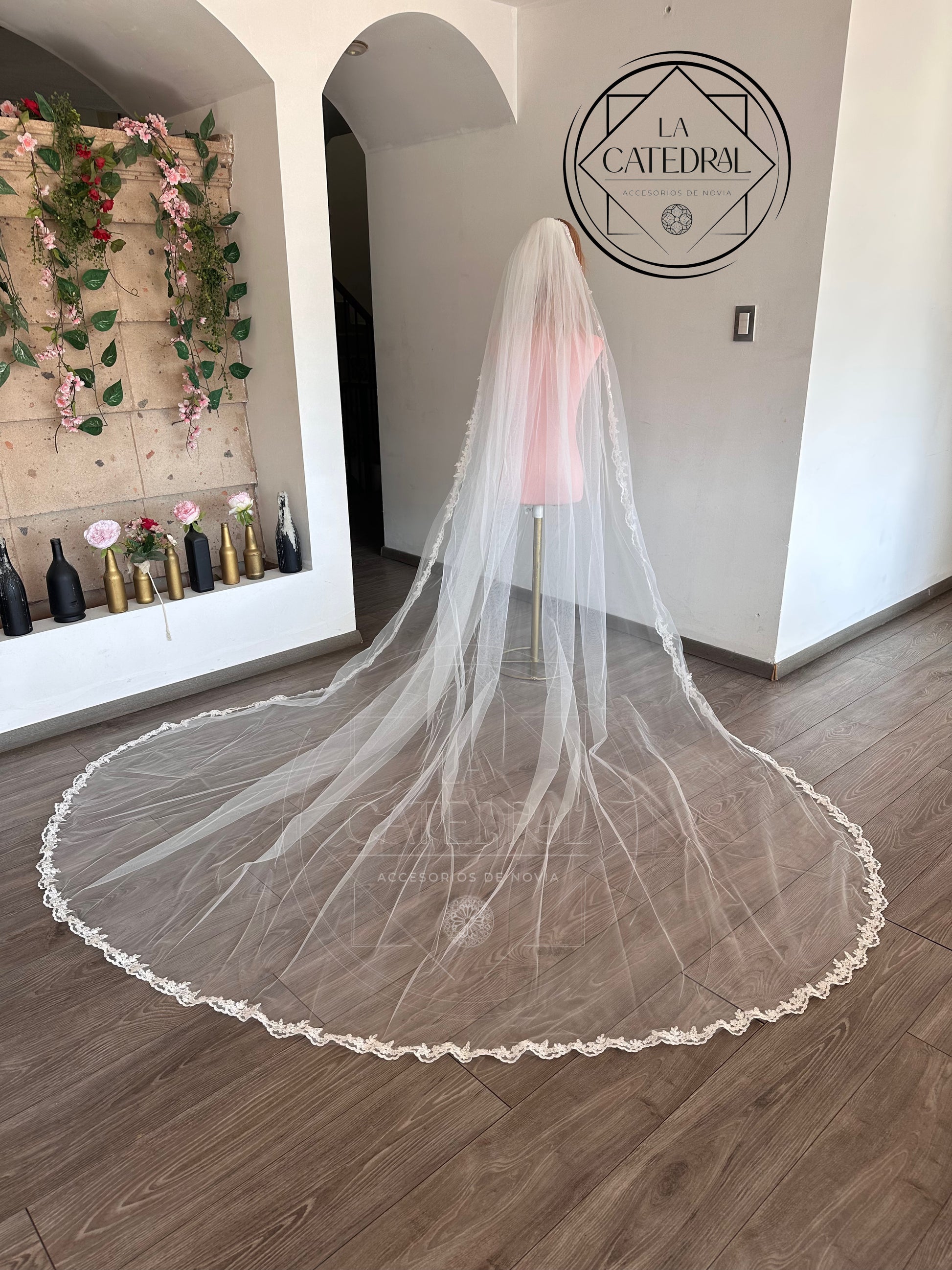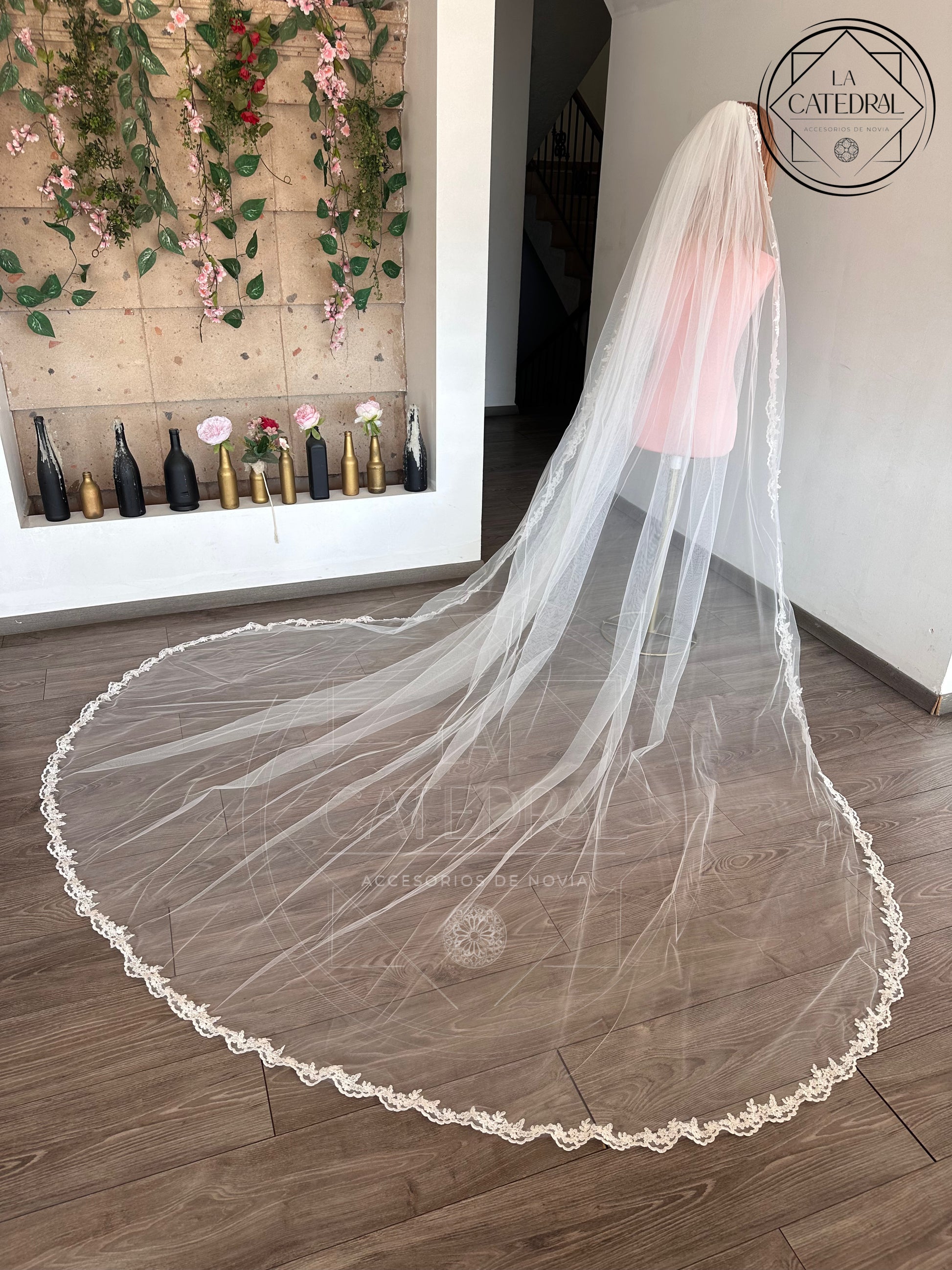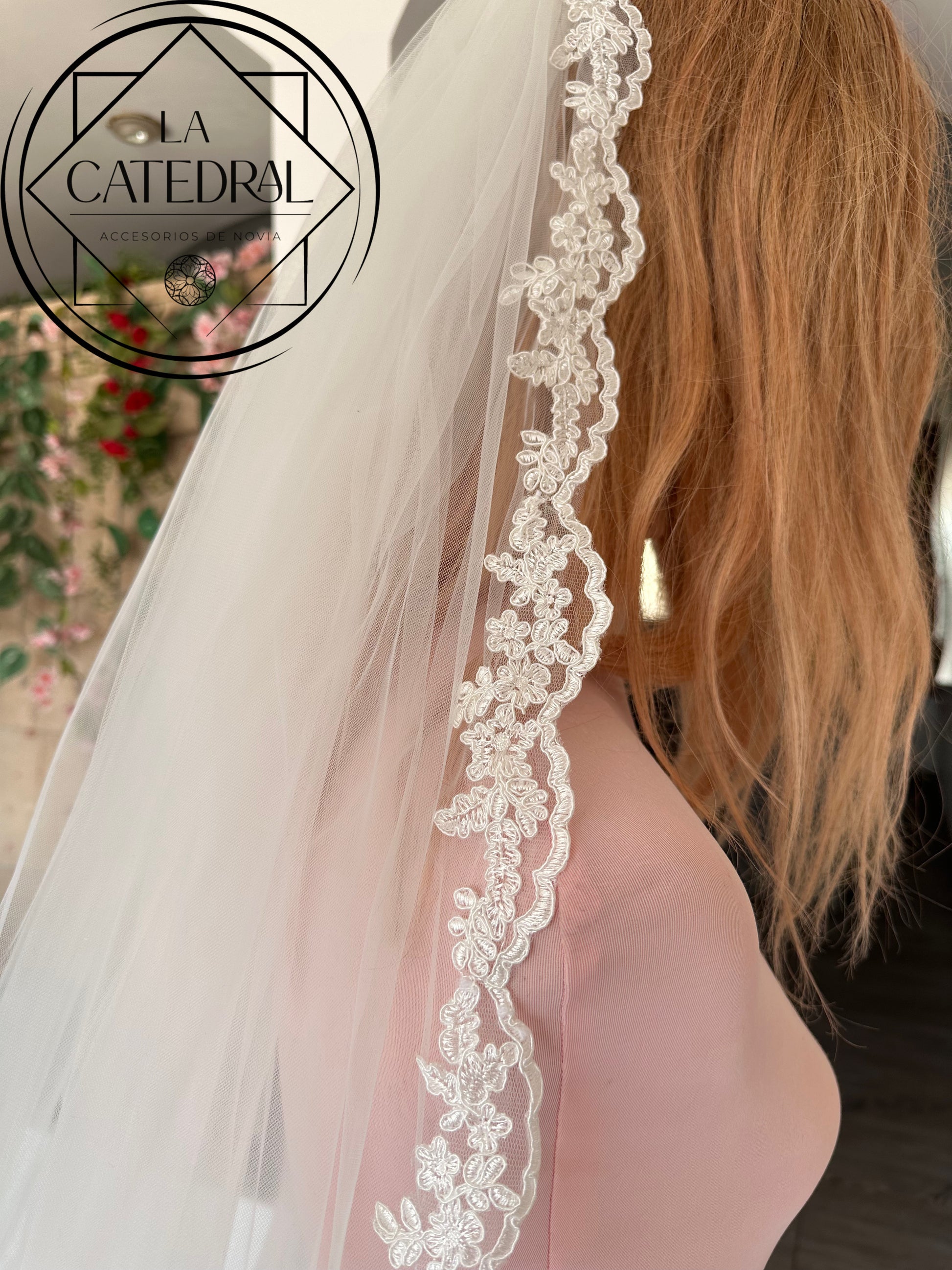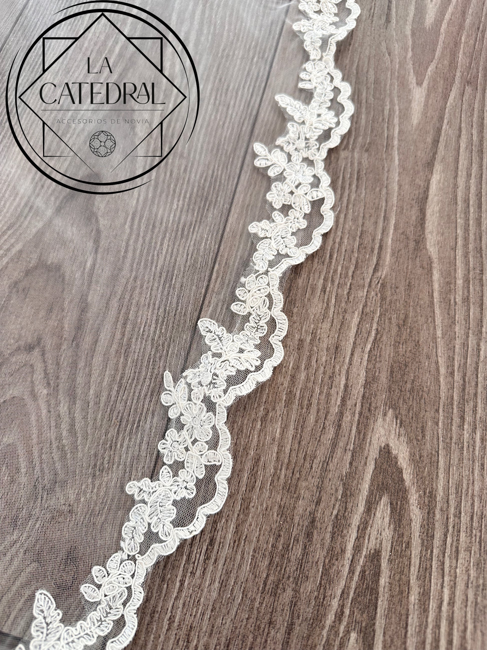 Velo Catedral una capa con peineta en tulle de seda italiano y encaje delicado de flores y hojas en todo el borde para darte un toque elegante y fresco.