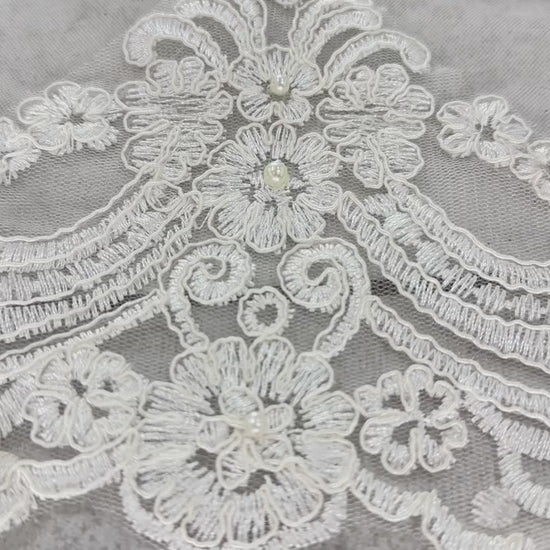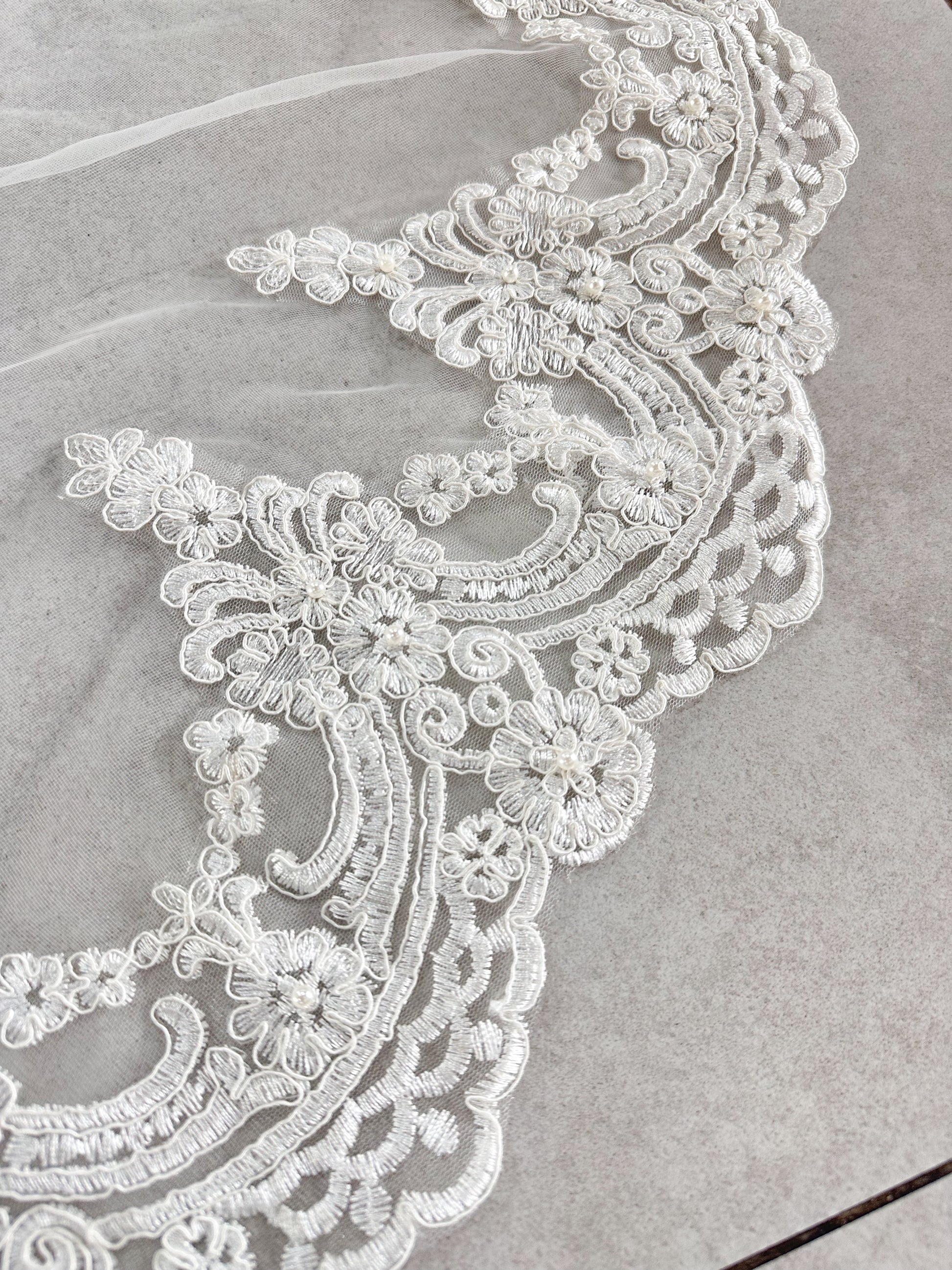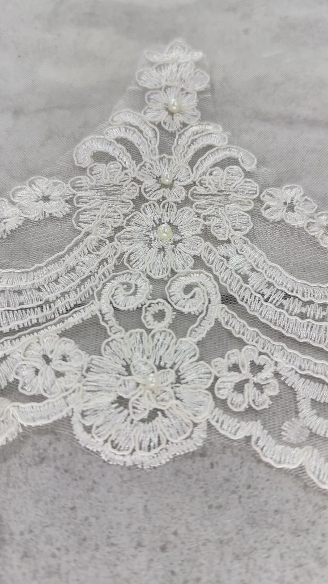 Tipo: Una capa sin peineta montada en tulle de seda puro con encaje grande en toda la orilla bordada con perlas sintéticas para darle ese toque romántico.
