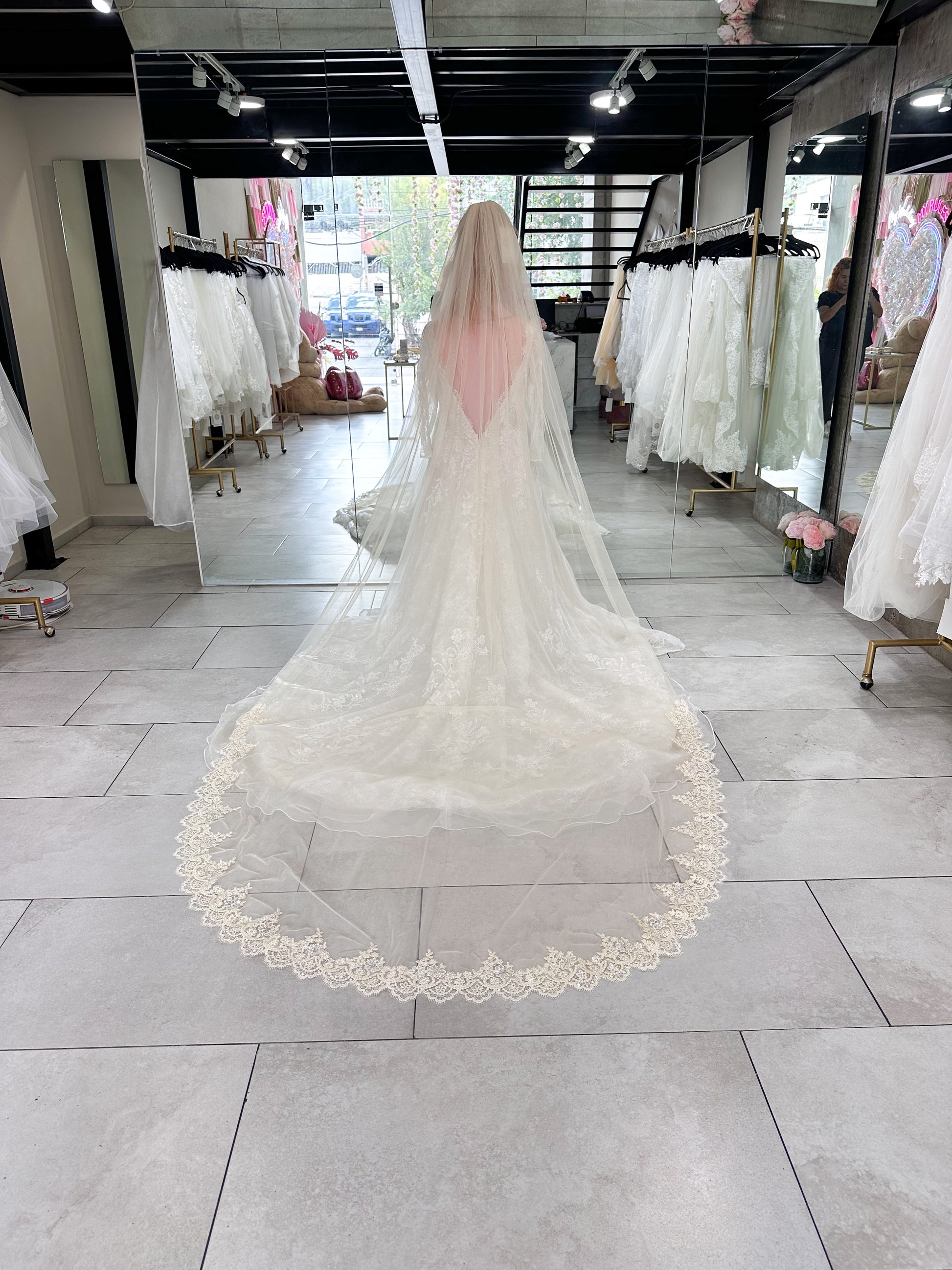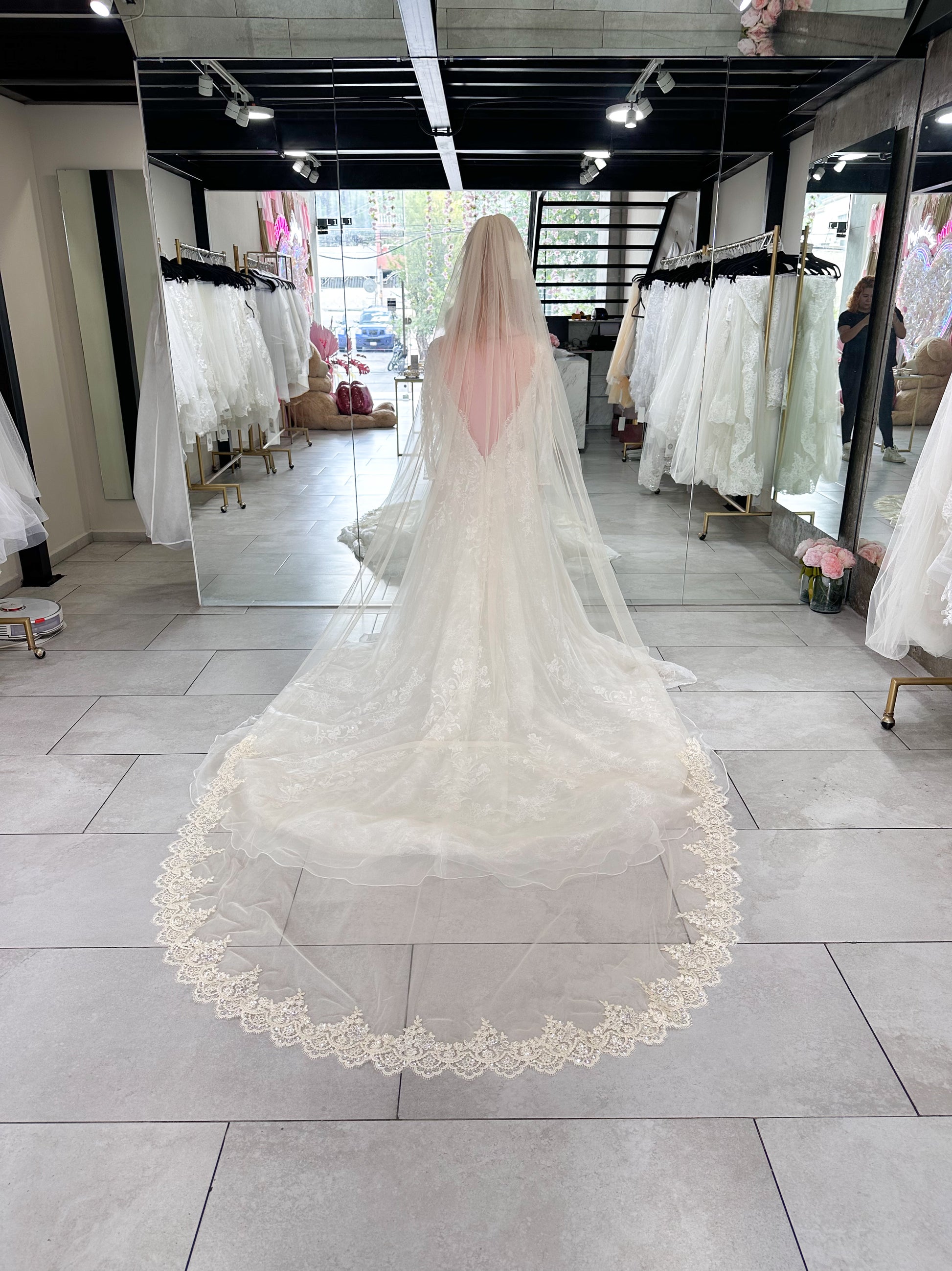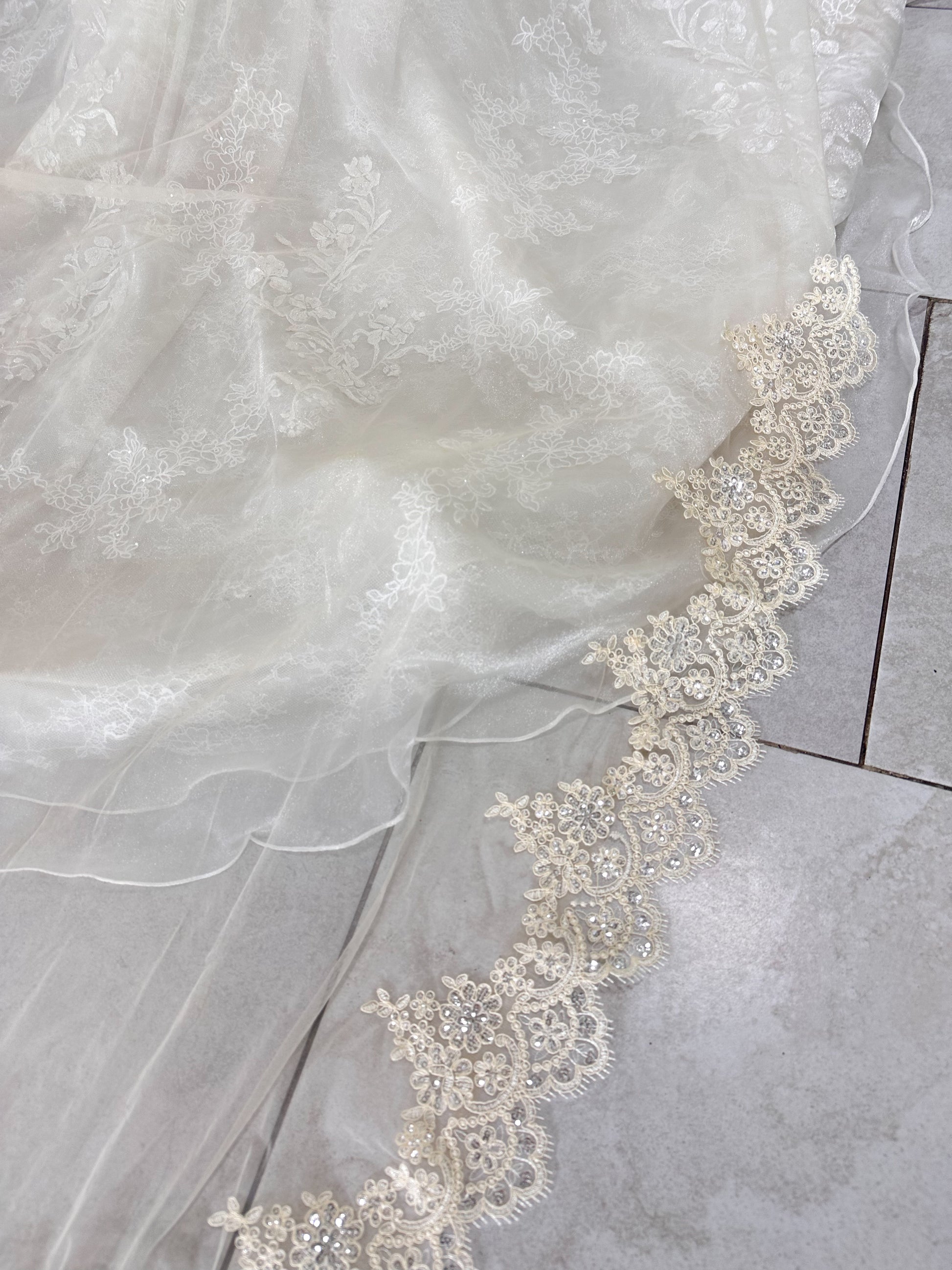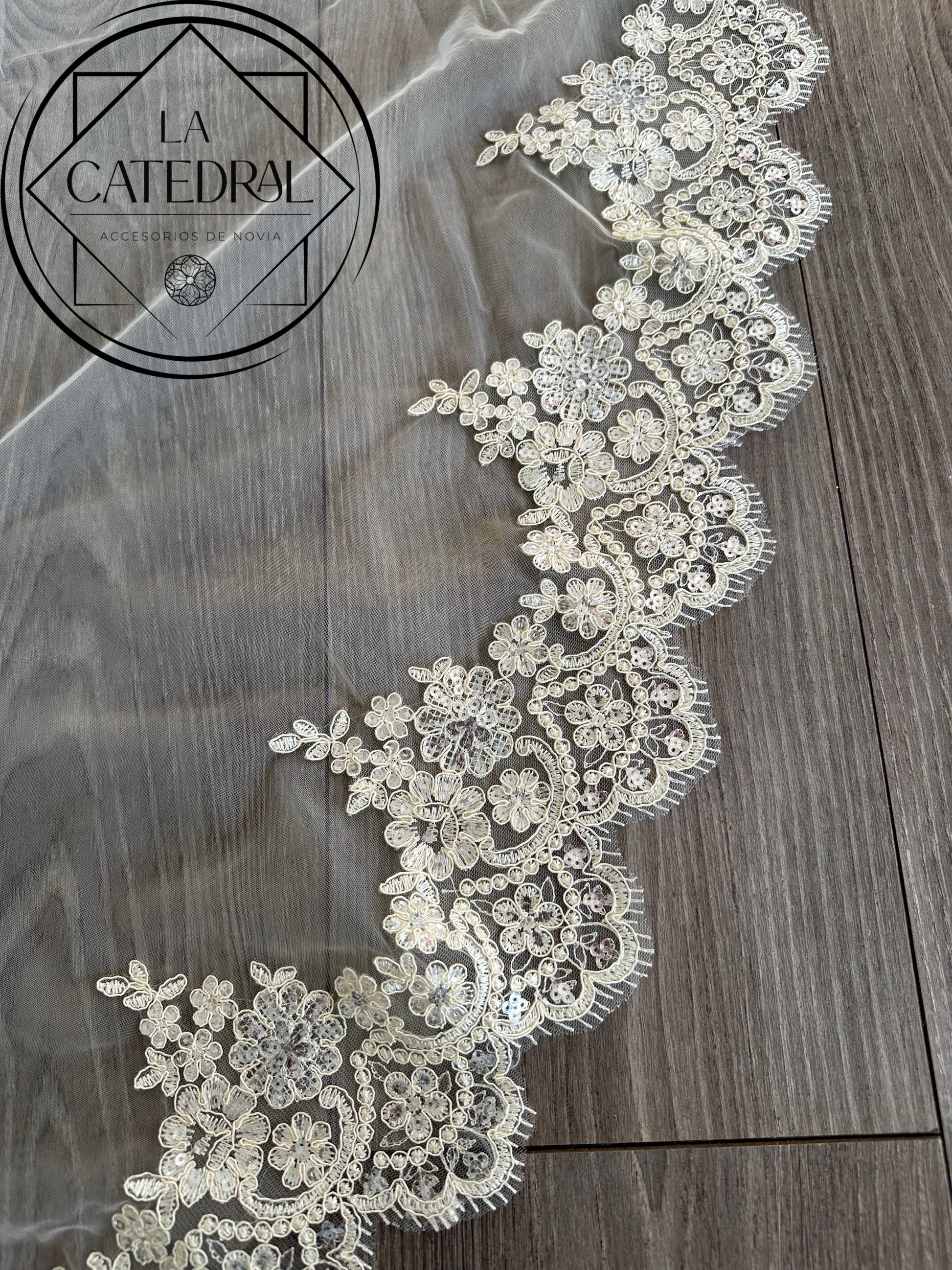 Tipo: Velo catedral una capa con peineta, encaje grande y lentejuela semi transparente bordada.