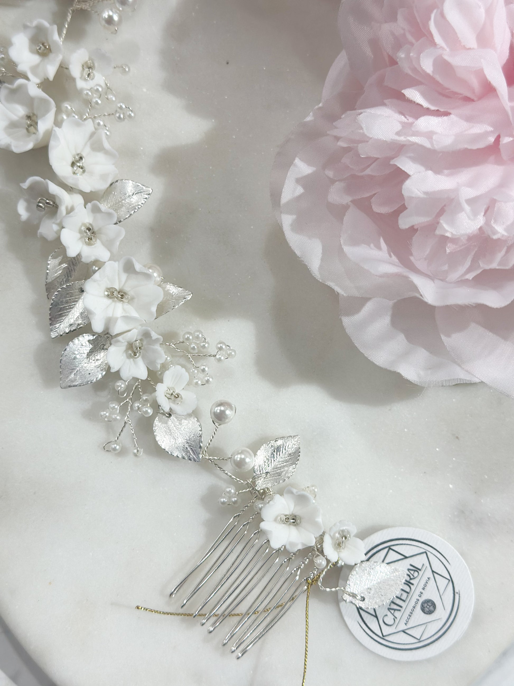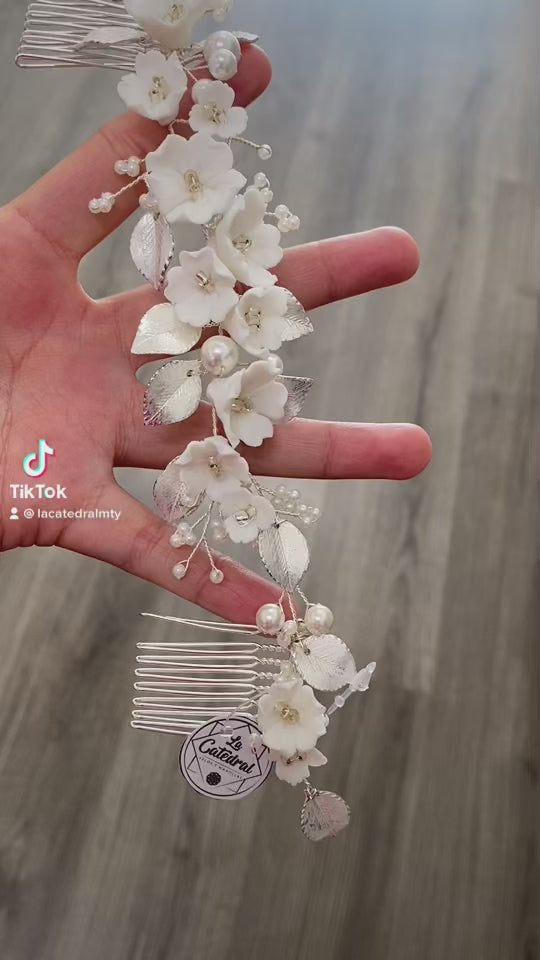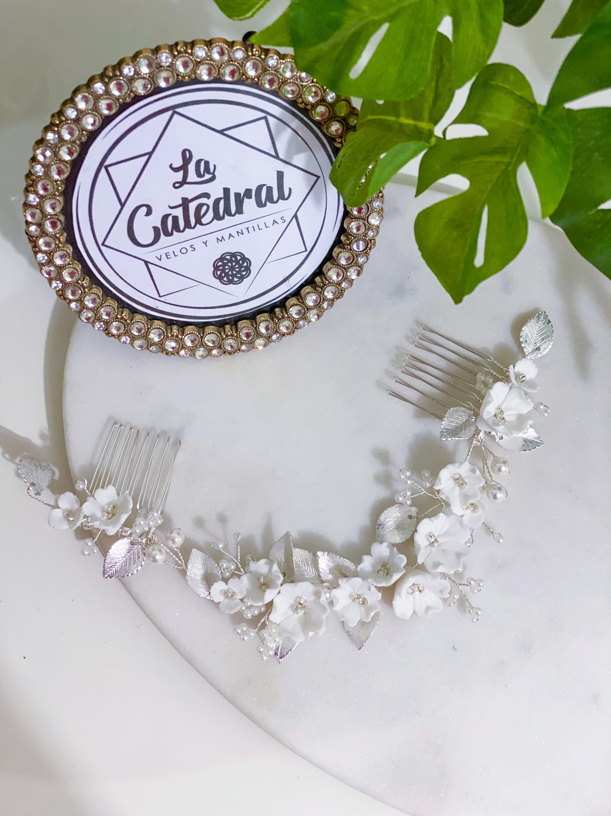 Peineta flexible con flores de porcelana que se ajusta muy bien a cualquier estilo de peinado por su versatilidad de acomodo con doble peineta chica.