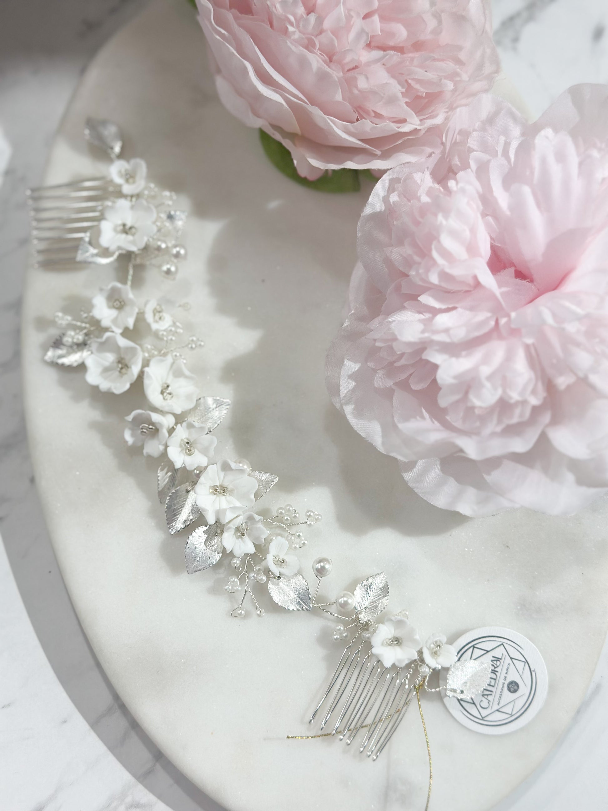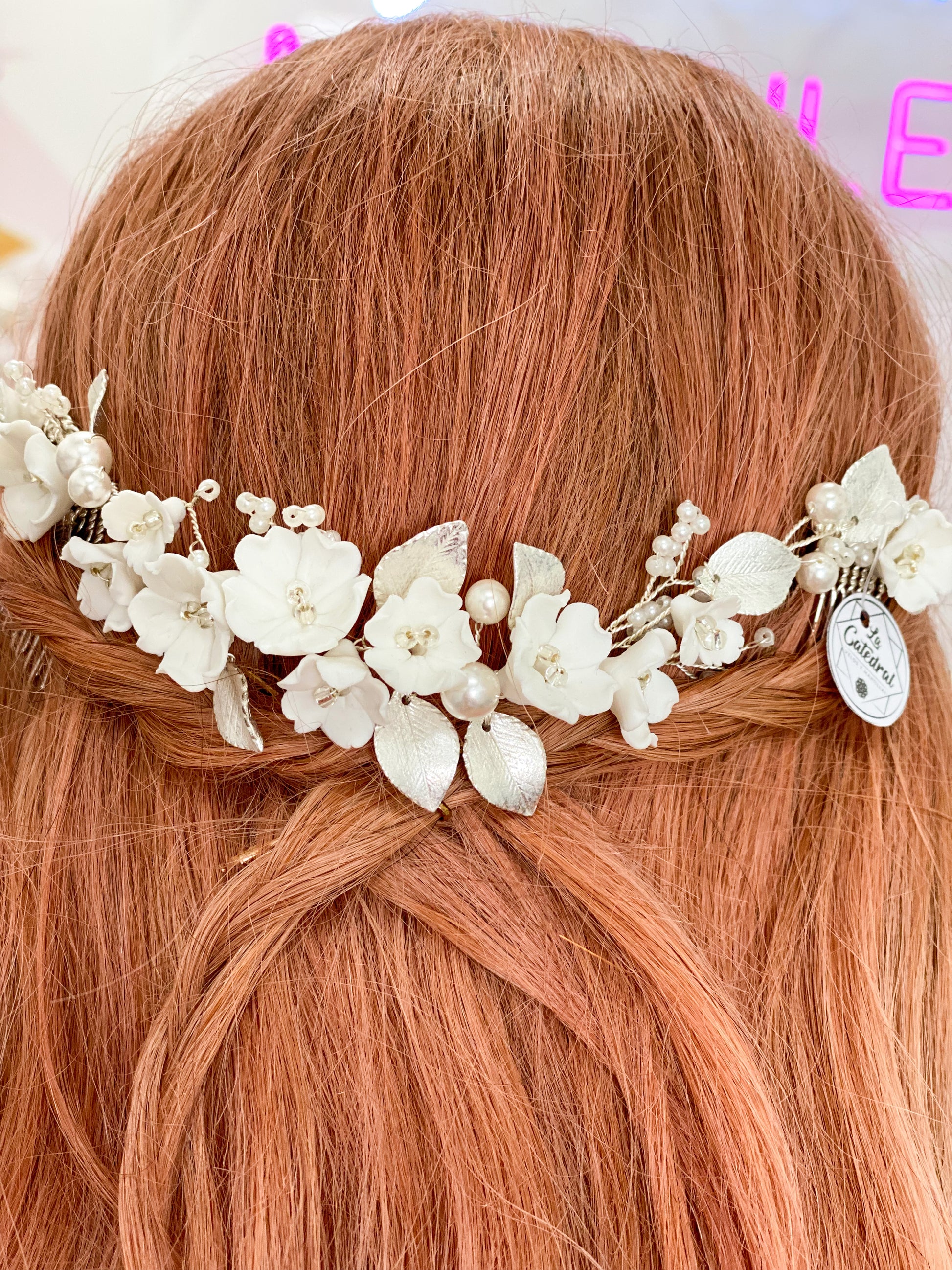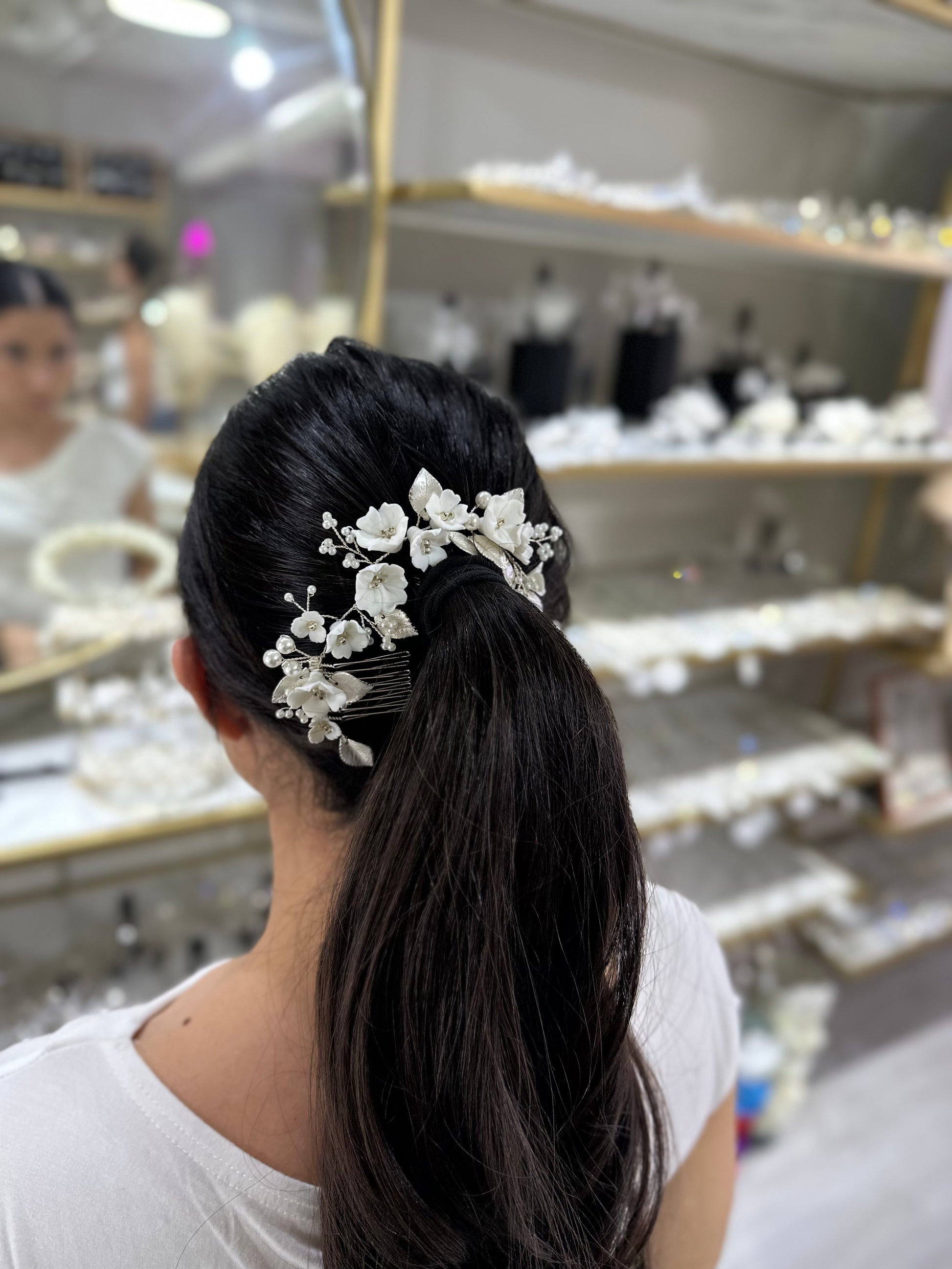 Peineta flexible con flores de porcelana que se ajusta muy bien a cualquier estilo de peinado por su versatilidad de acomodo con doble peineta chica.