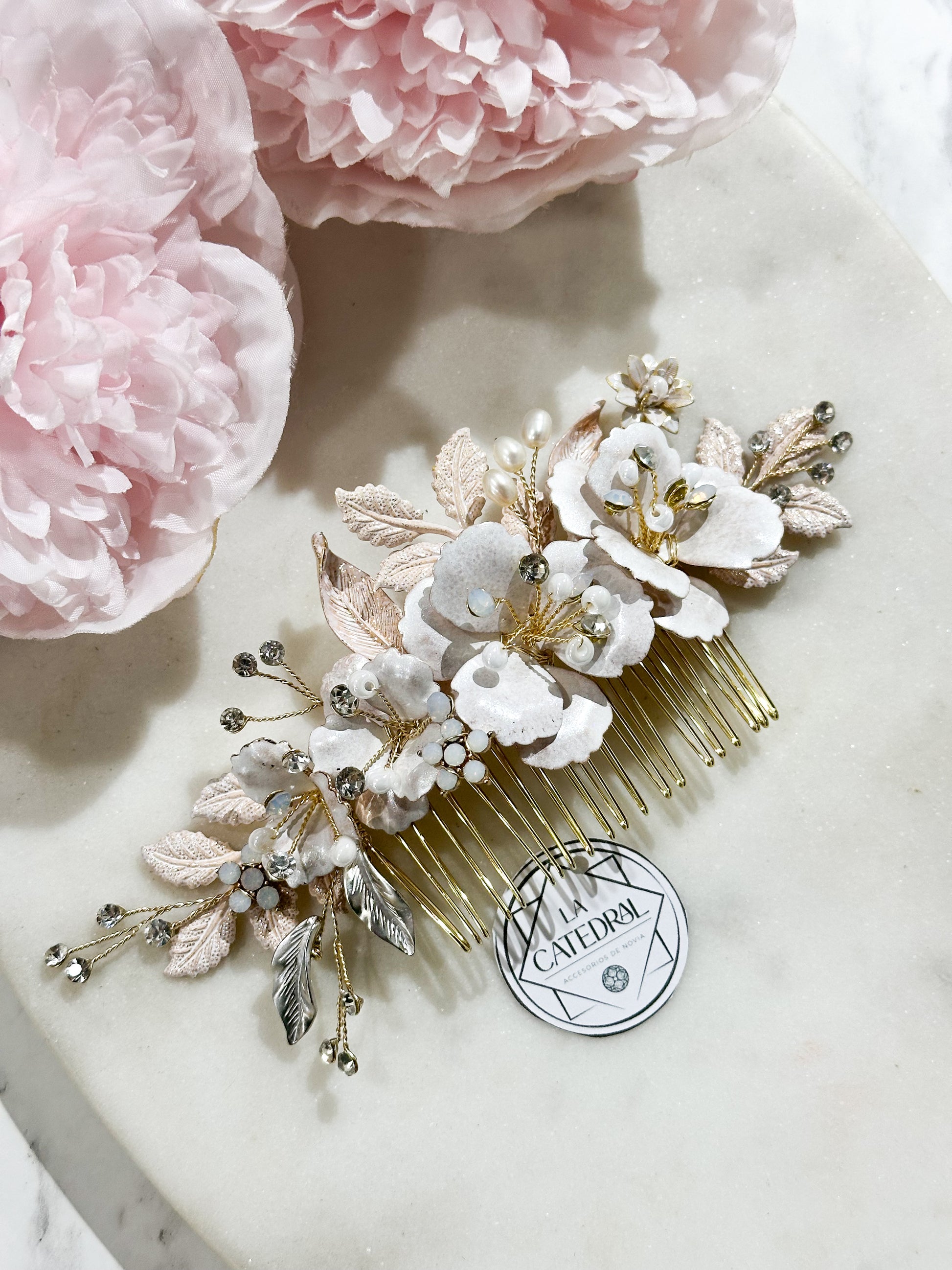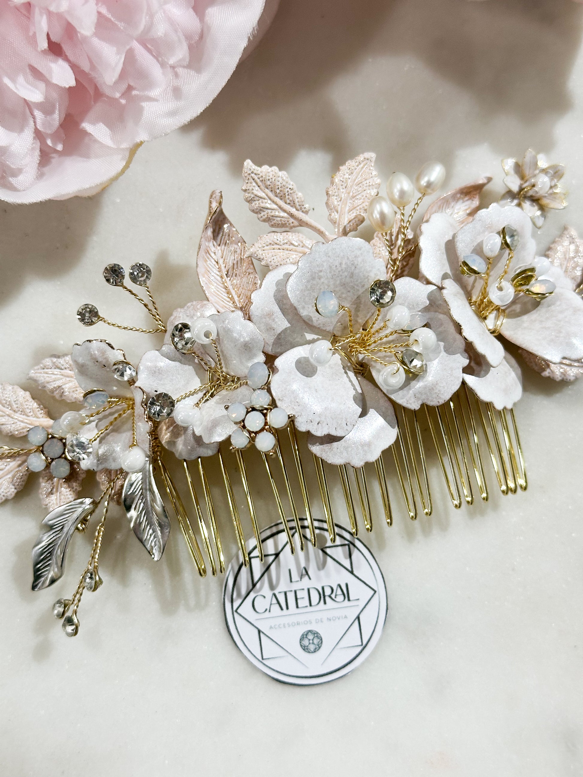 Material: Cristal austriaco, perlas sintéticas, cristal opal con flores y hojas esmaltadas