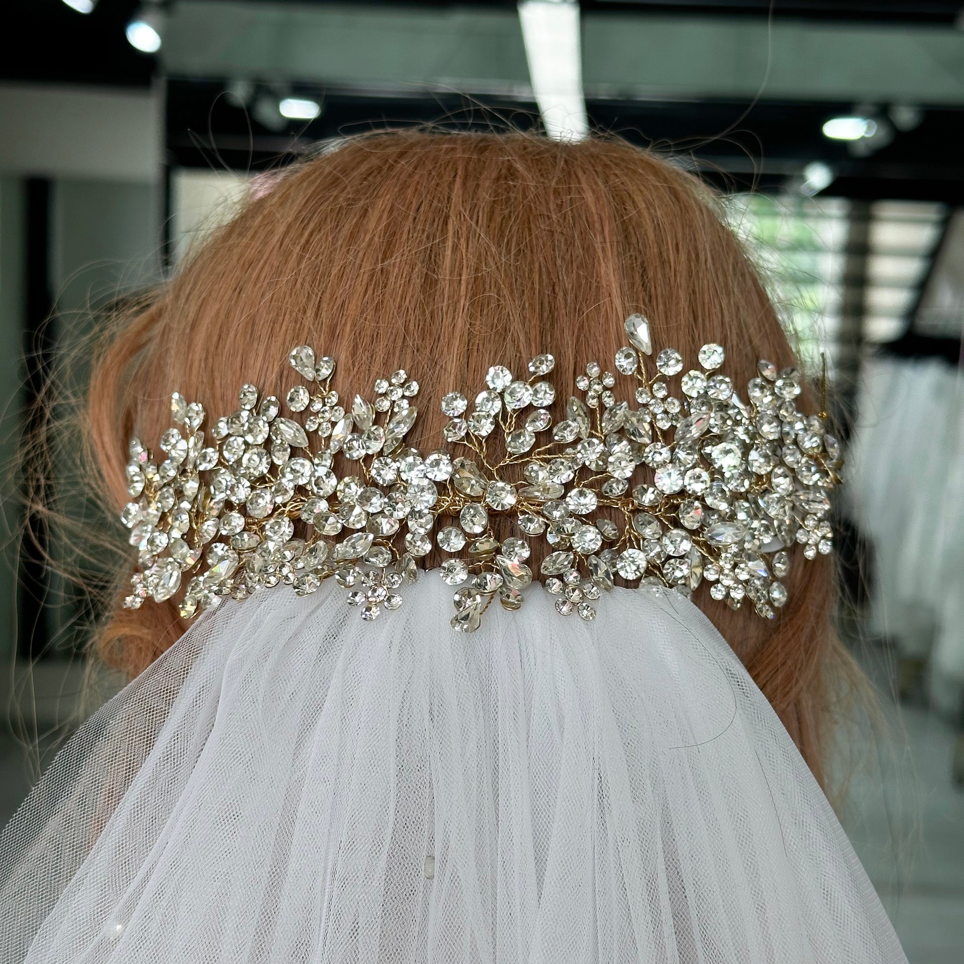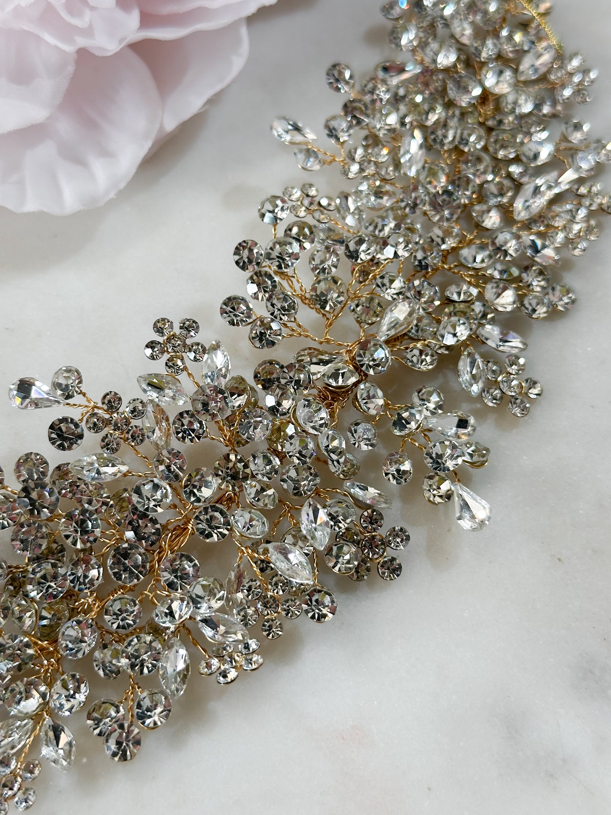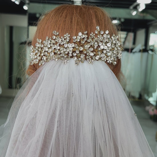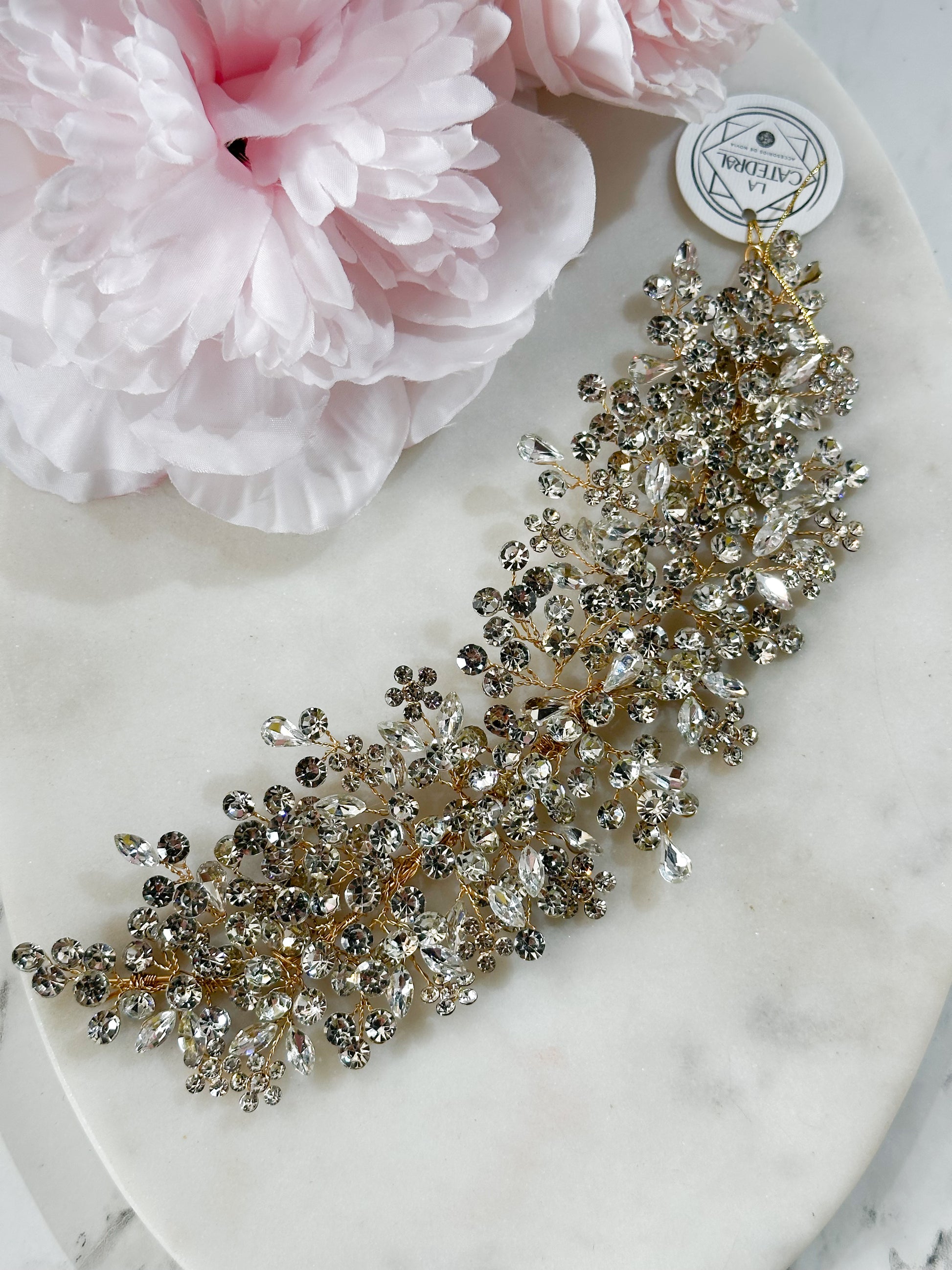 Tocado Flexible lleno de cristales austriacos en base dorada para quien busca un toque de color pero desea un brillo excepcional.