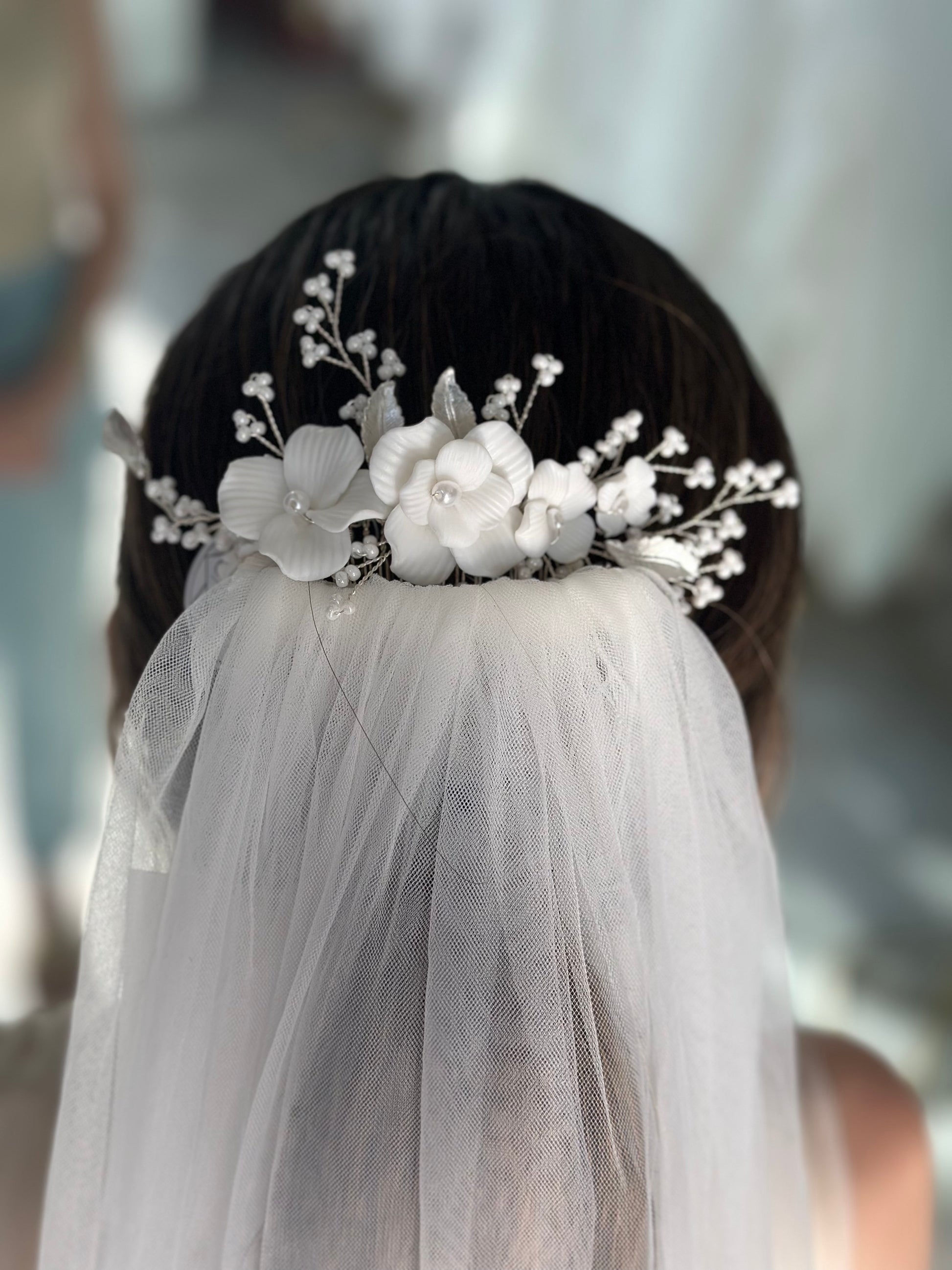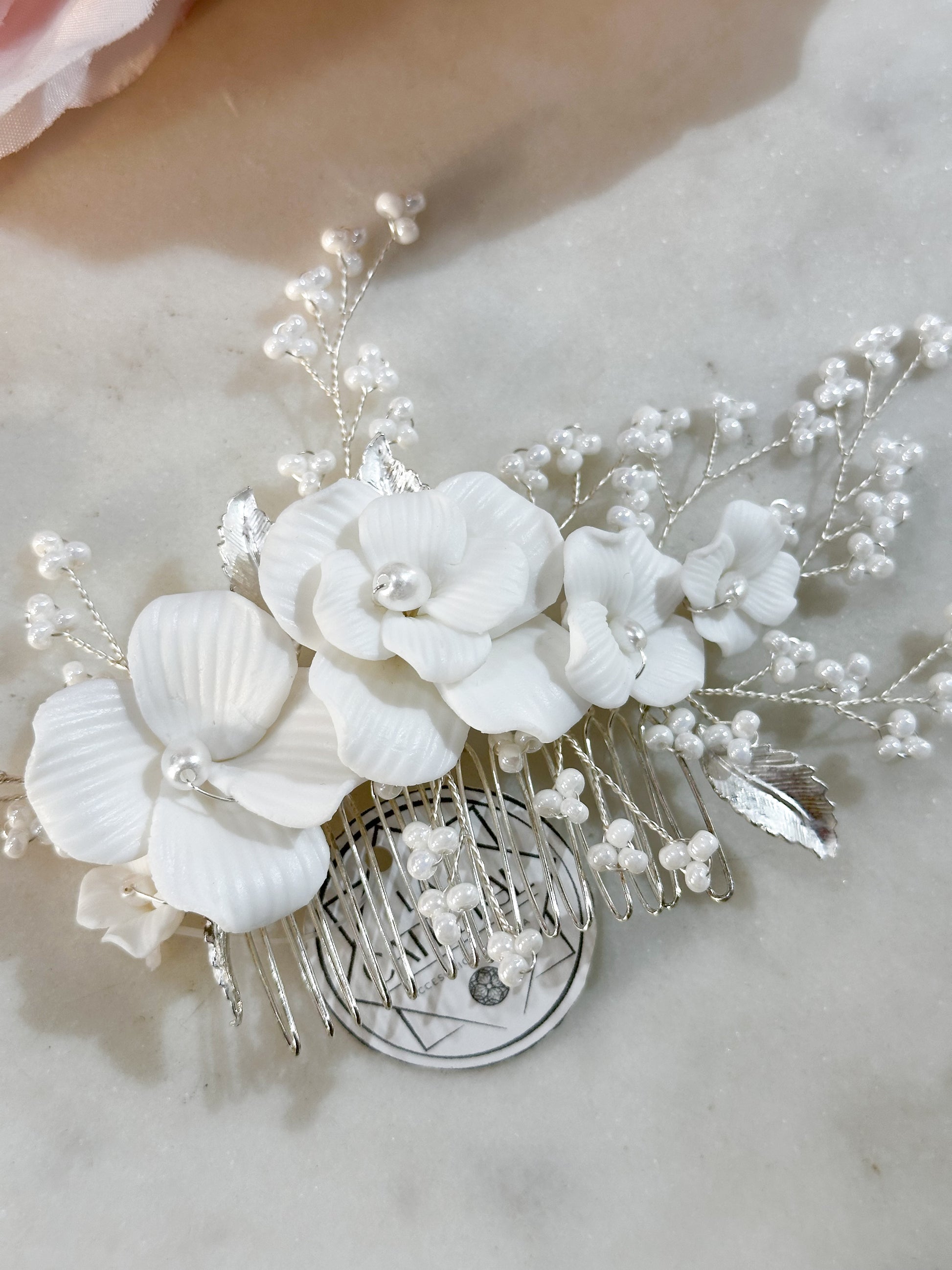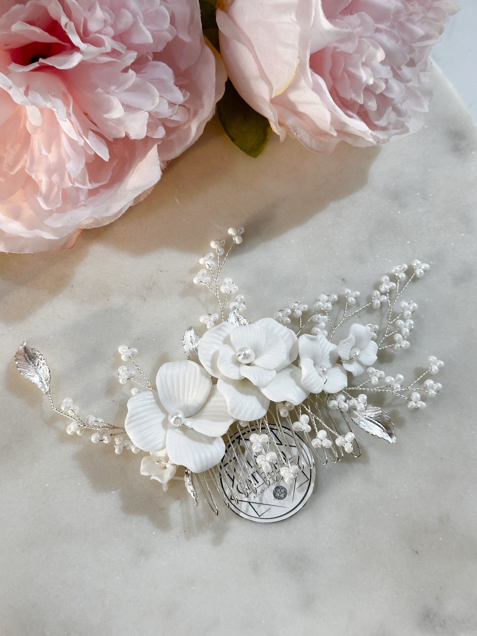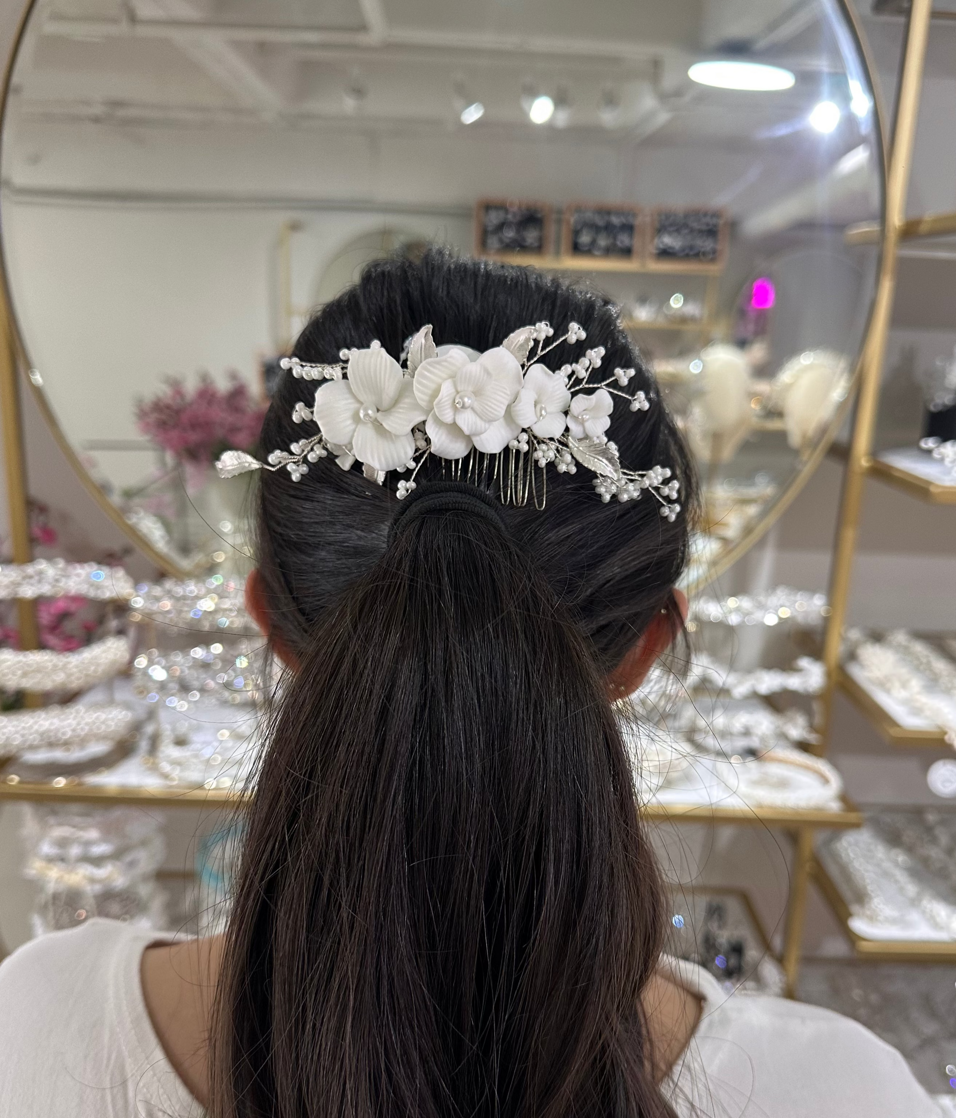Peineta con flores de porcelana grandes y detalles exquisitos para lograr un equilibrio perfecto para tu peinado.