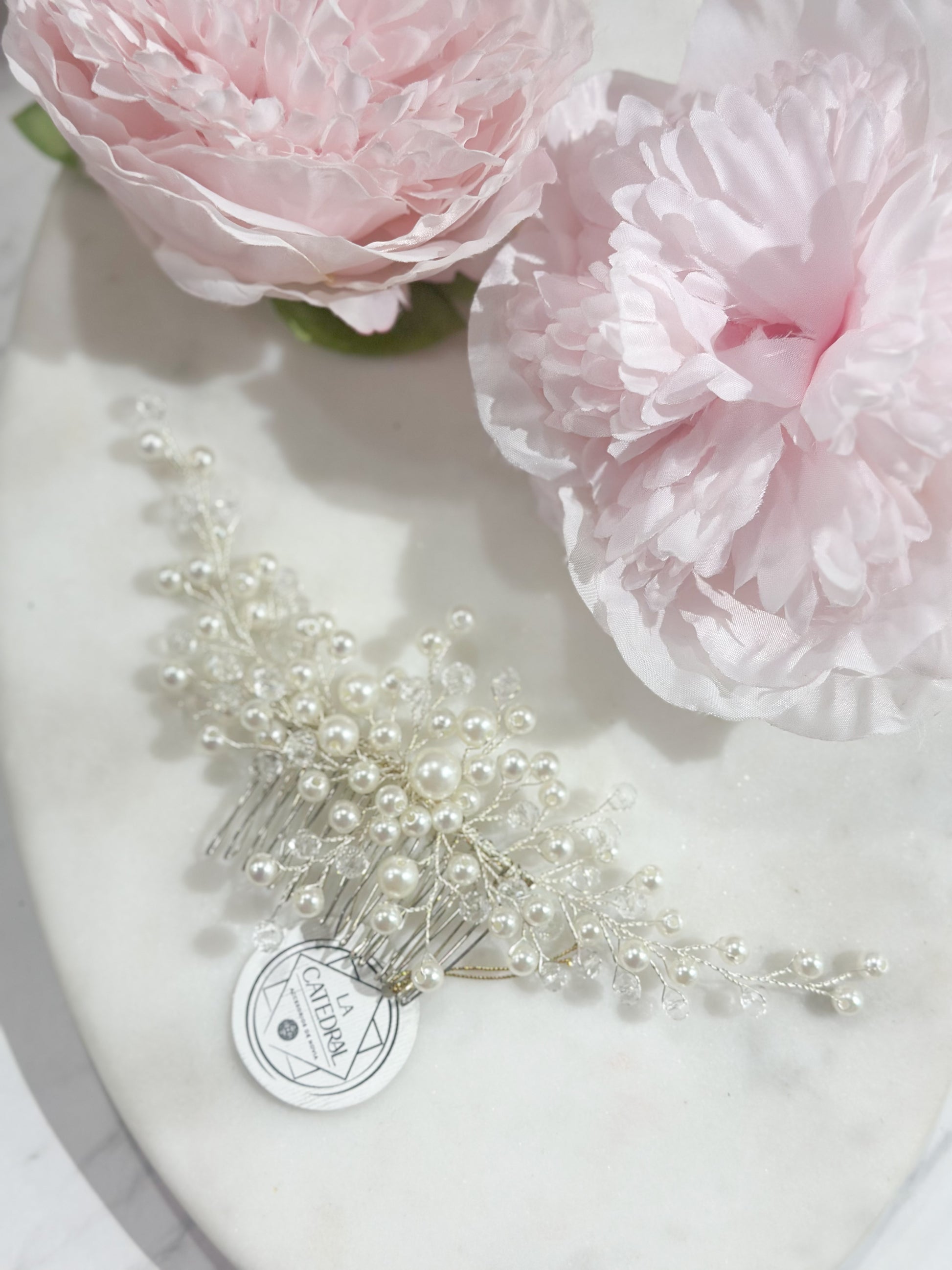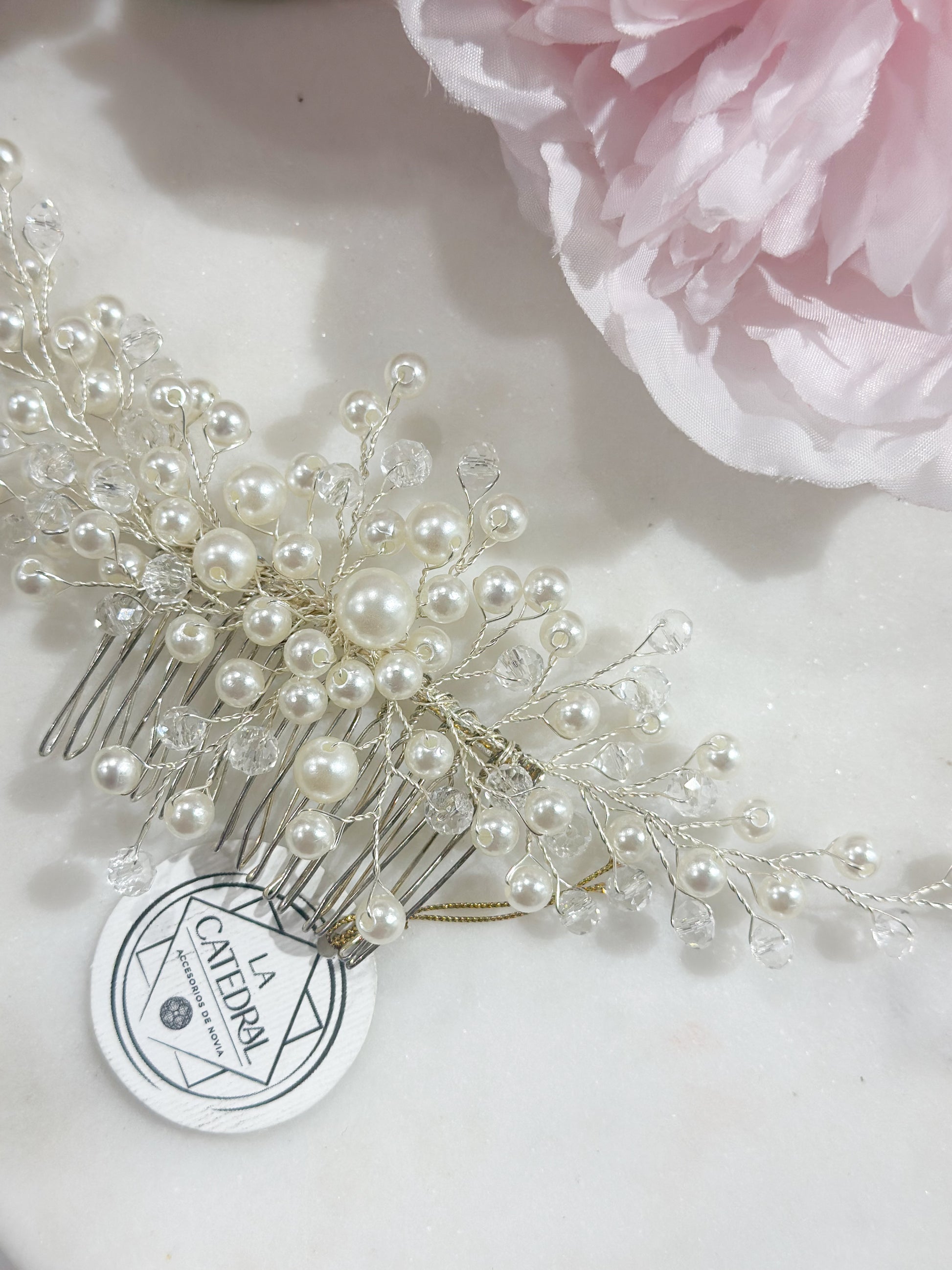 Peineta exquisitamente mediana de perlas sintéticas en combinación de cristal ruso para darle solo un toque sutil de brillo.