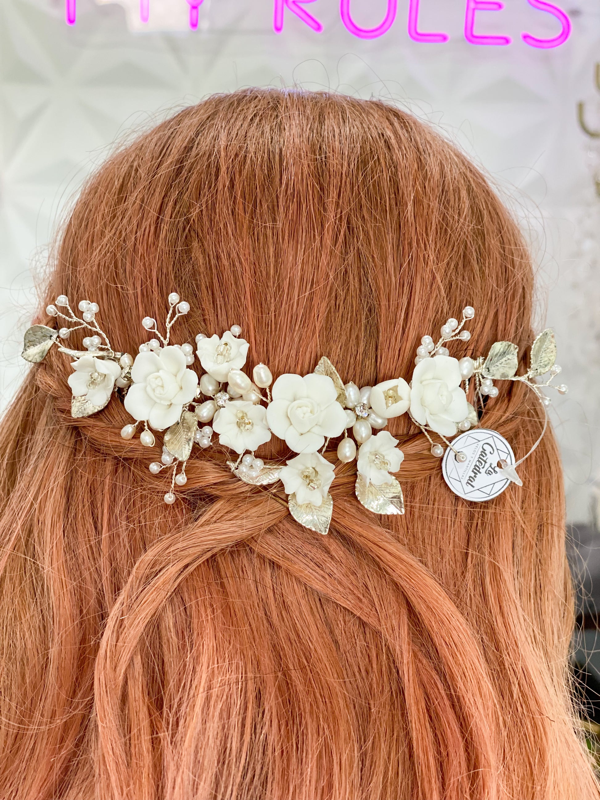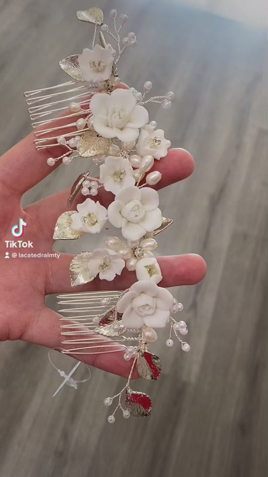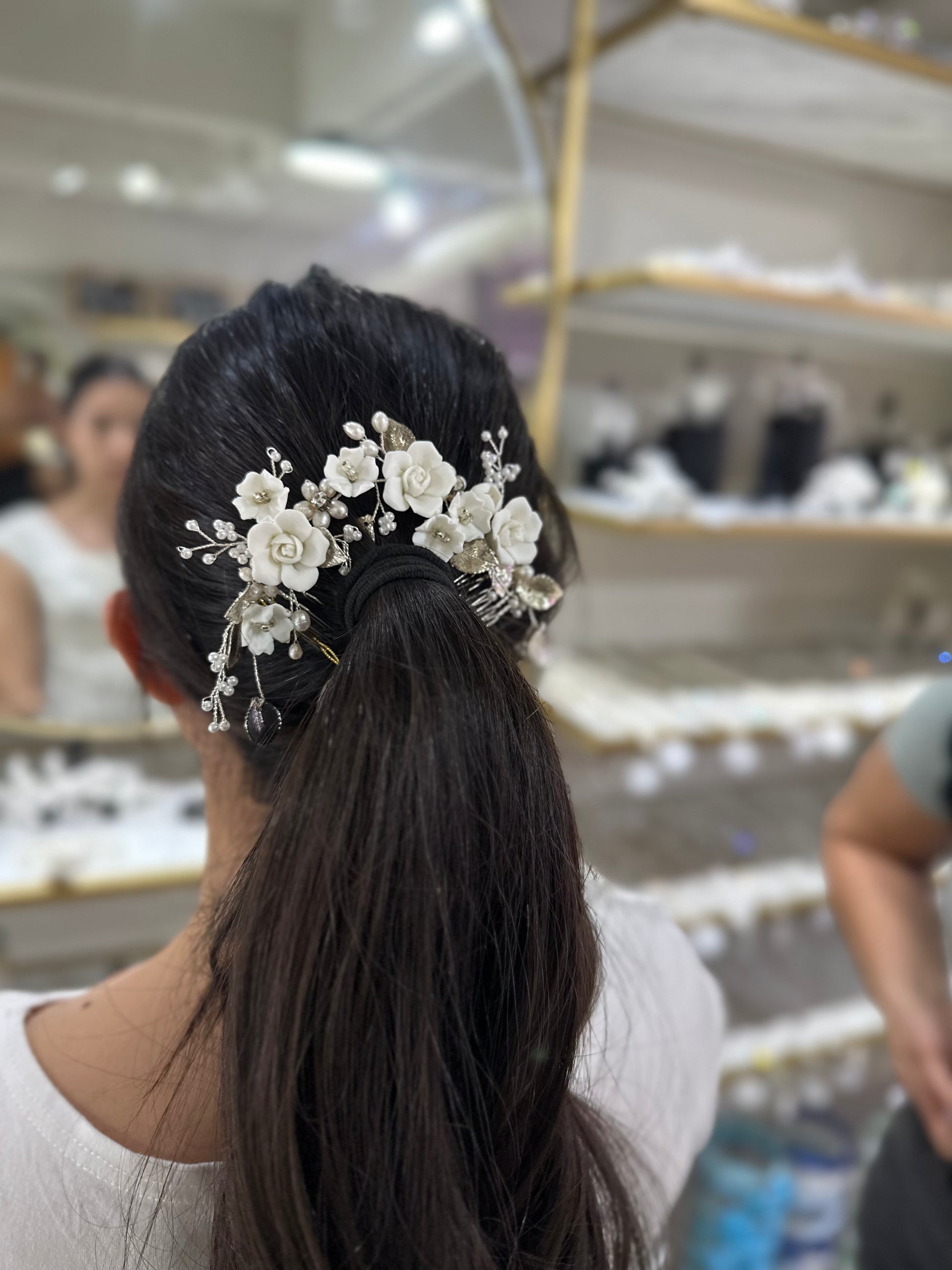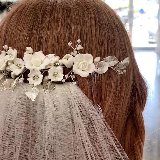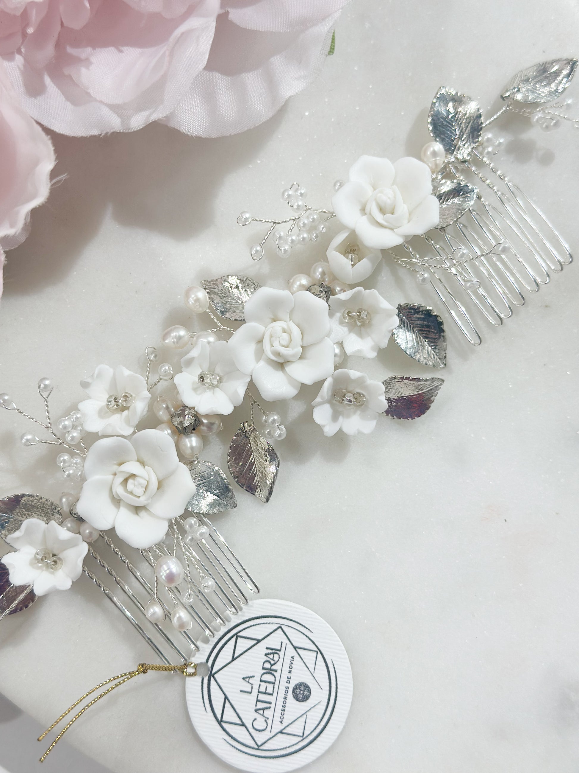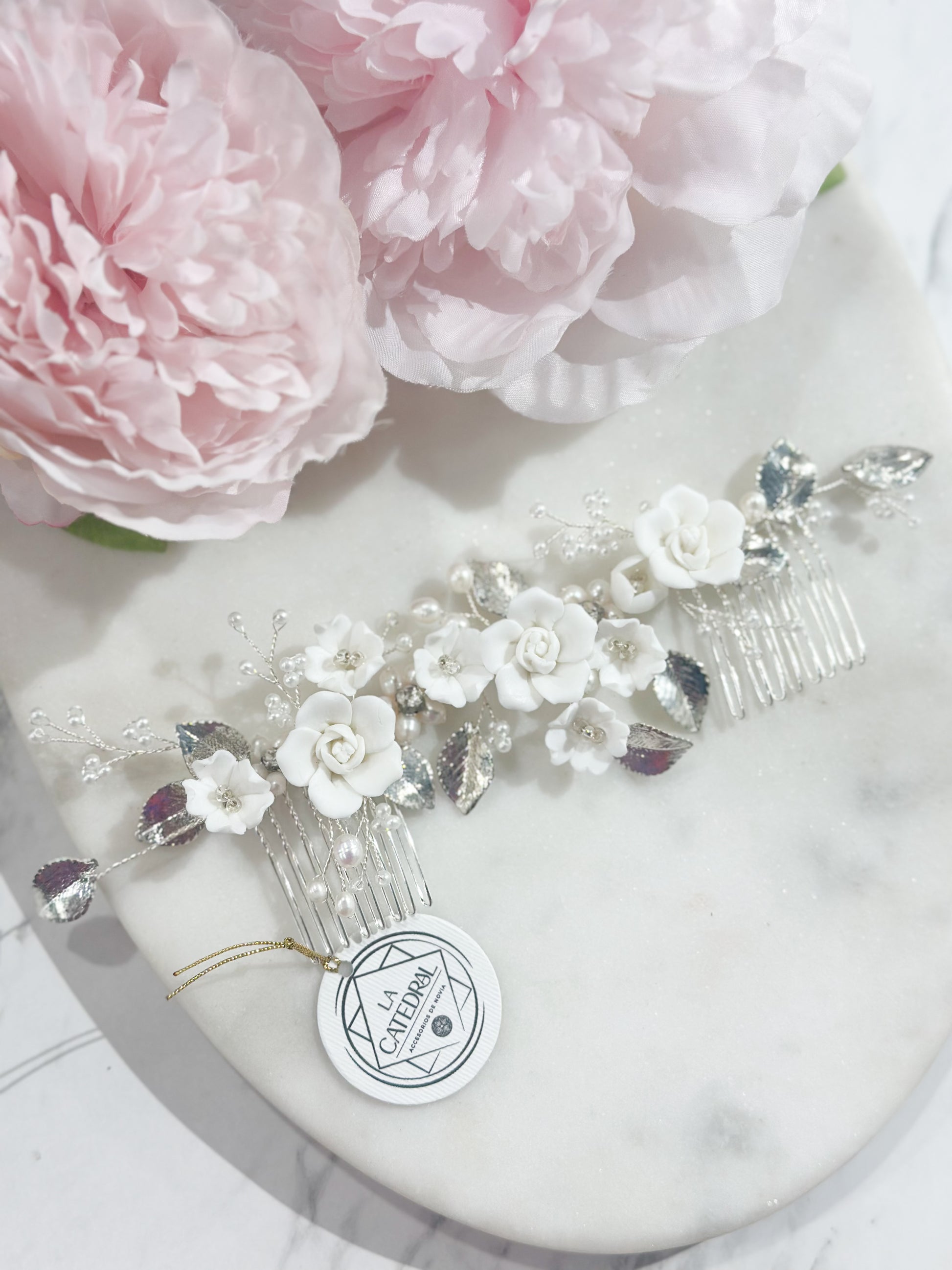 Peineta fresca y elegante gracias a sus flores de porcelana en combinación con el cristal austriaco que hará que destaque tu peinado.