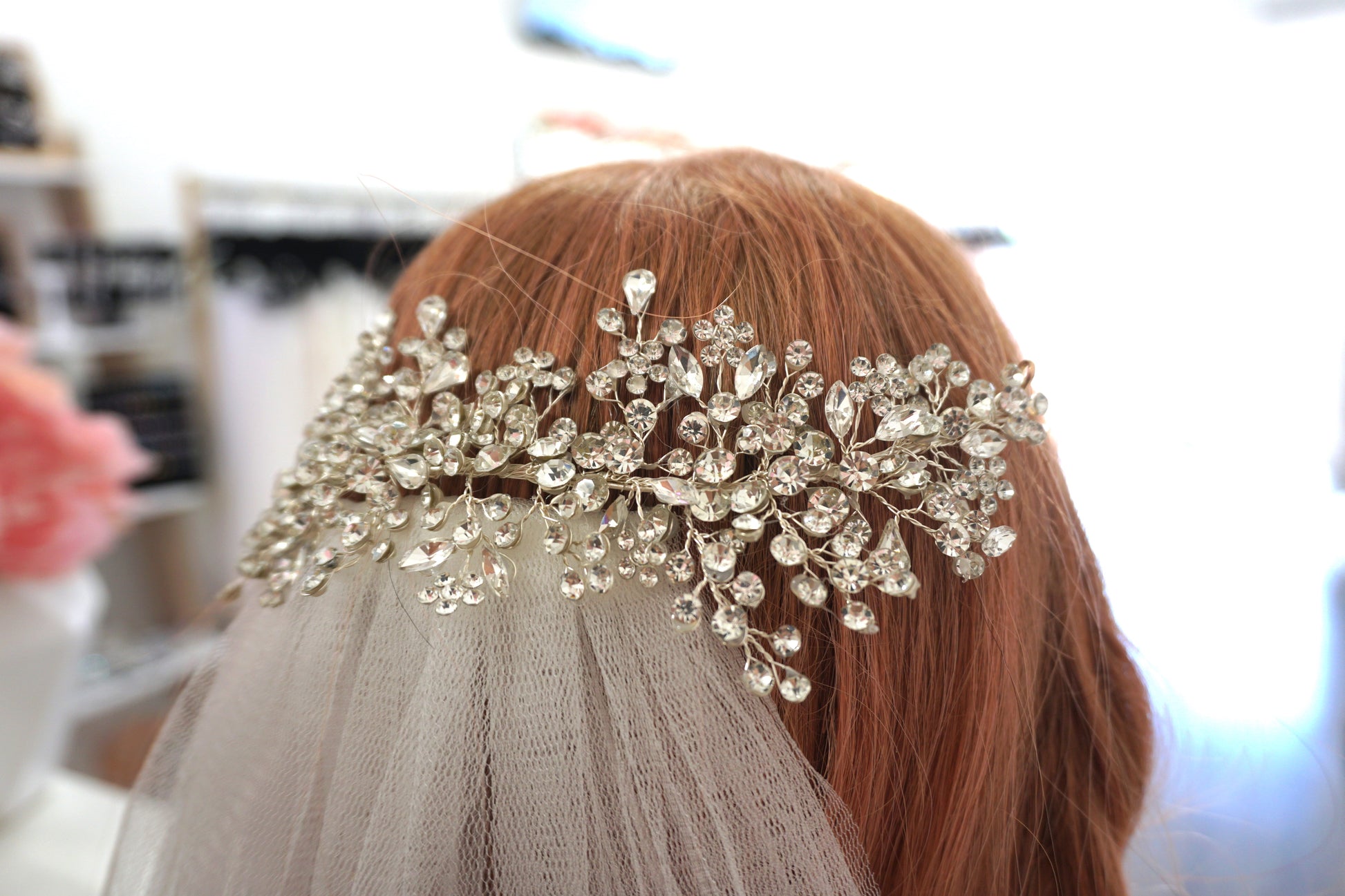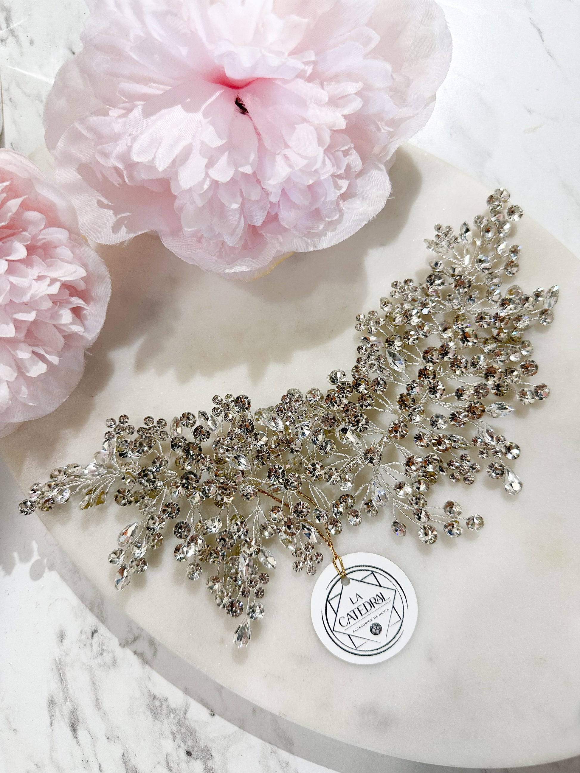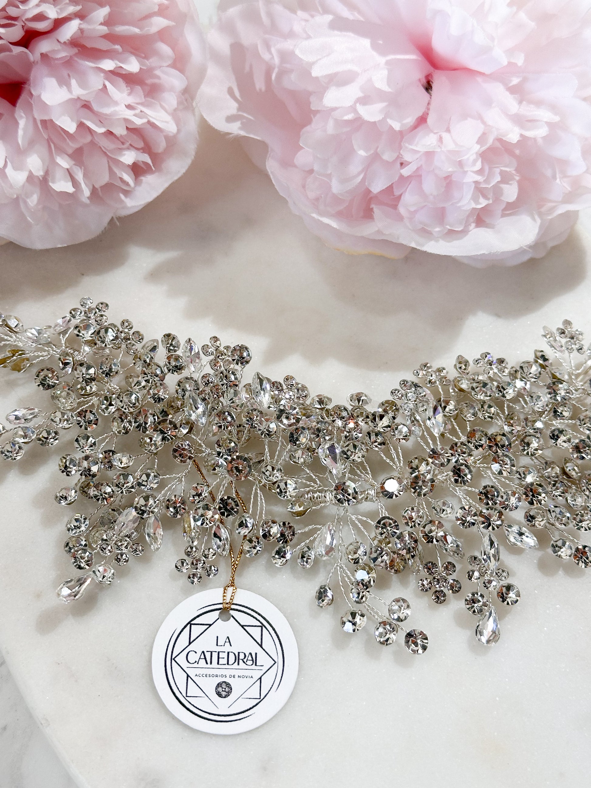Tocado Flexible lleno de cristales austriacos en base dorada para quien busca un brillo excepcional.