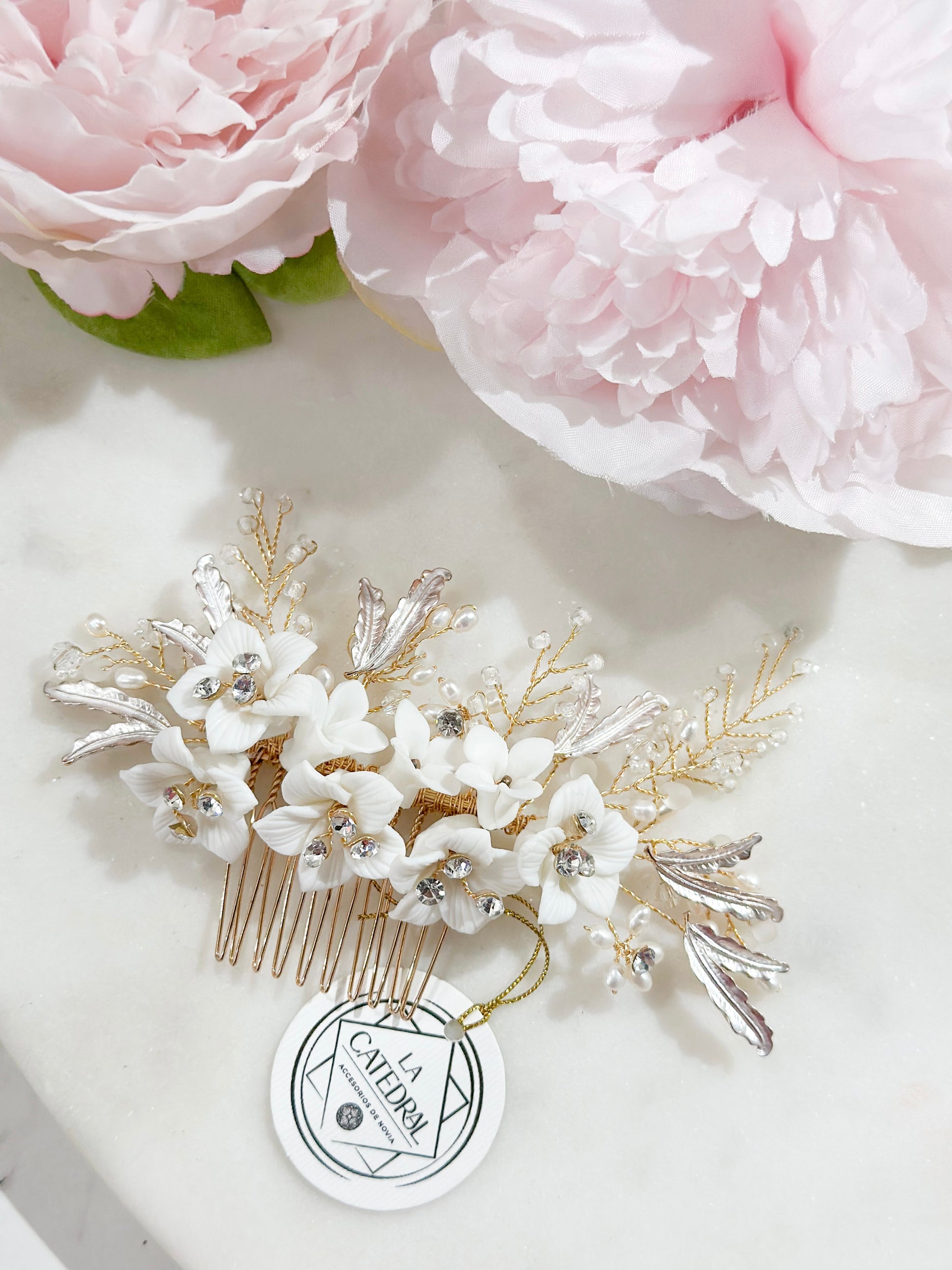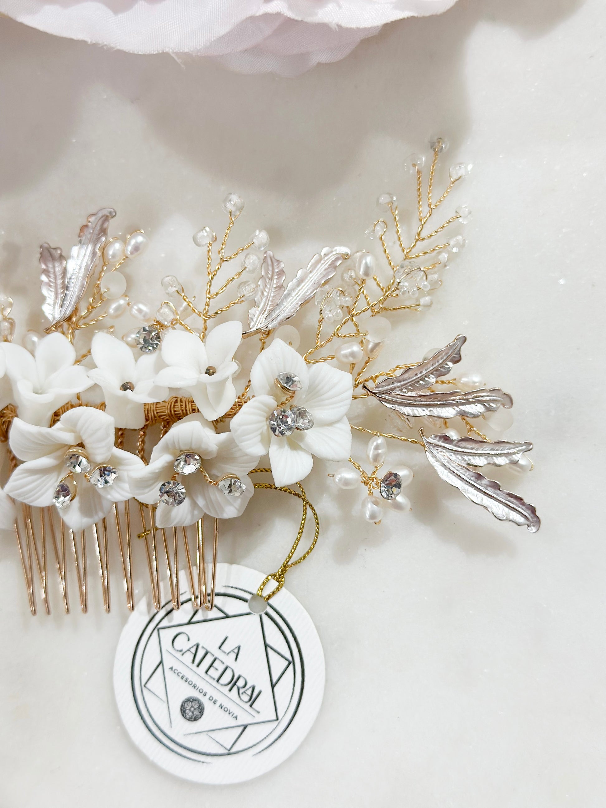 Peineta elegante y sofisticada gracias a sus flores de porcelana con hojas esmaltadas en tonos rosegold para dar ese toque sutil de color.