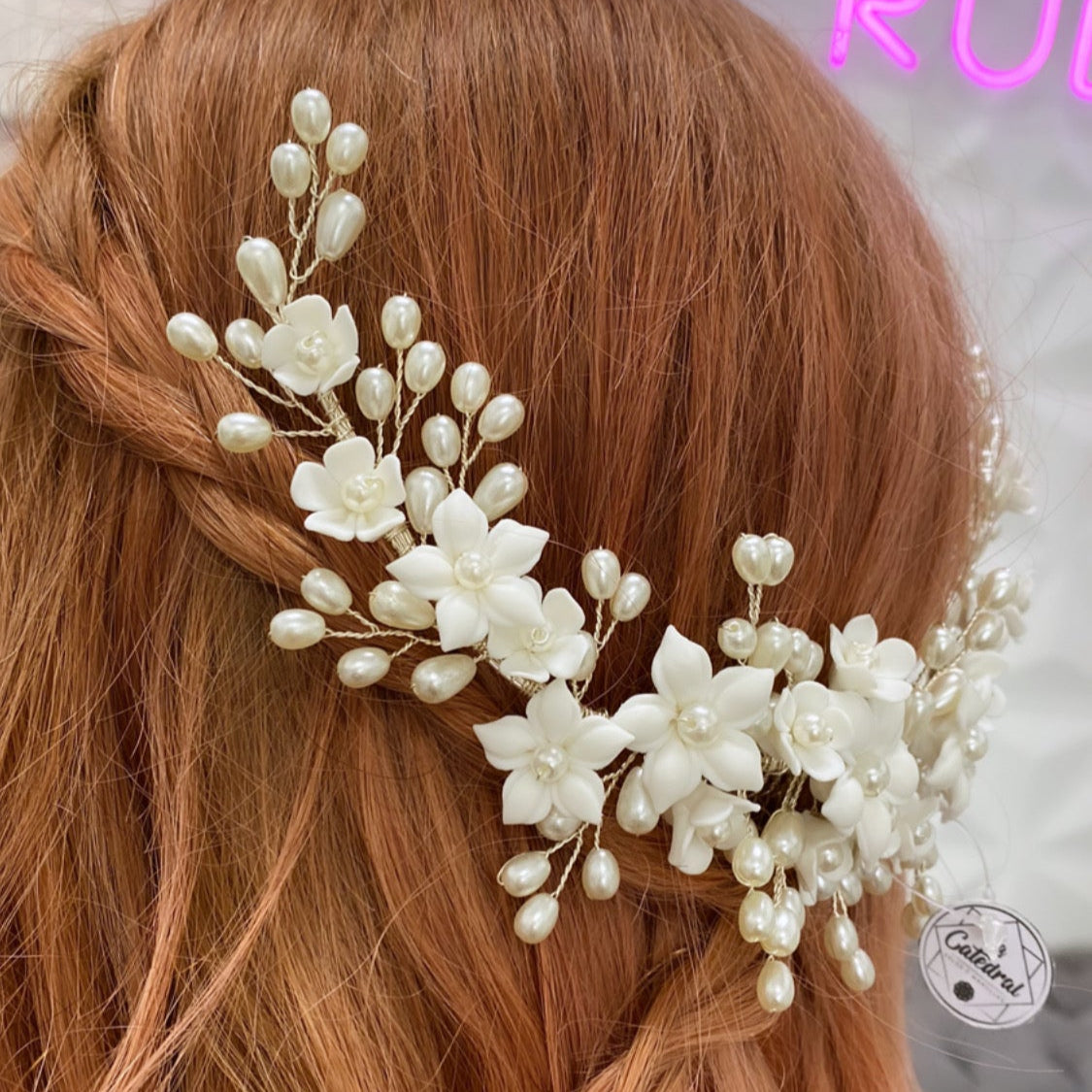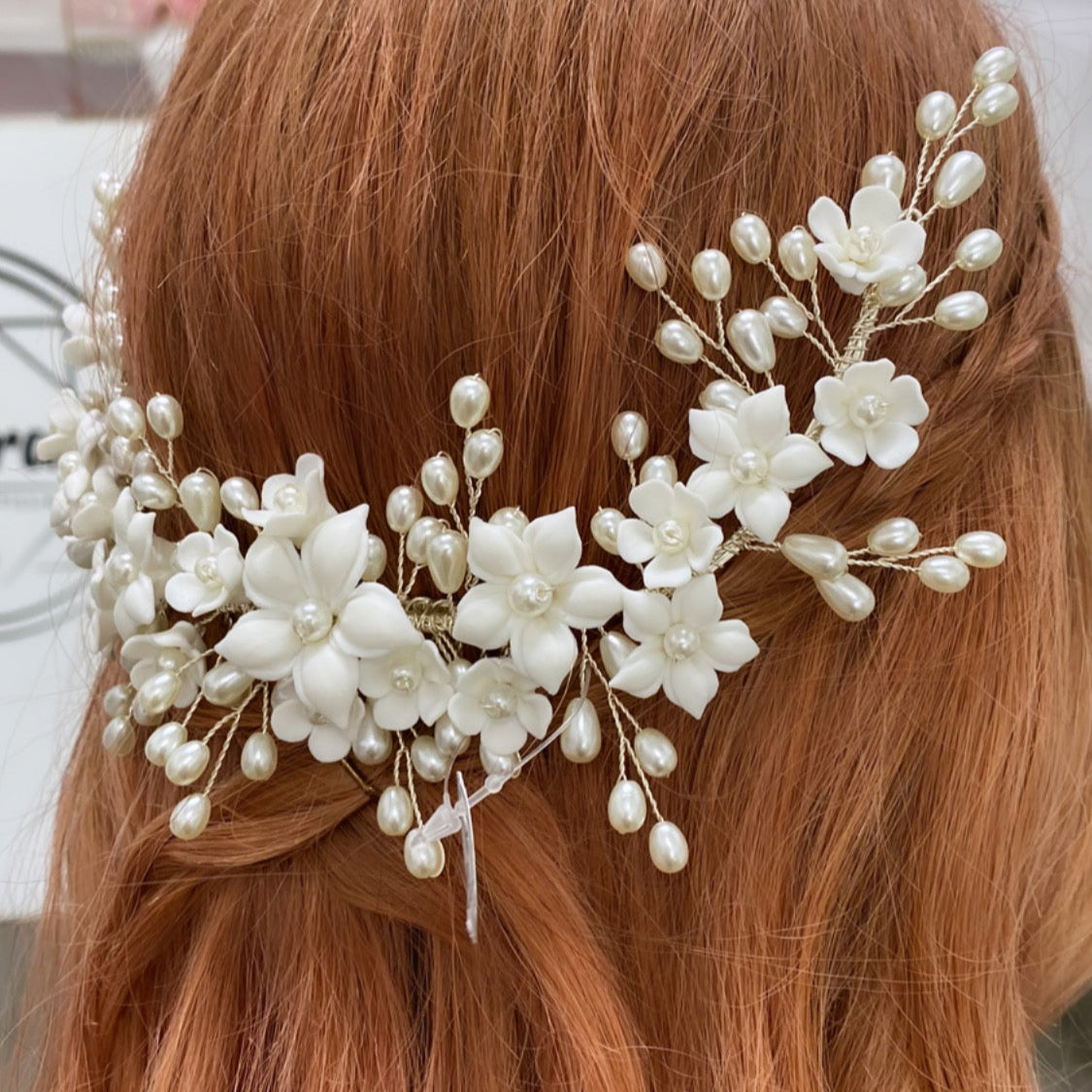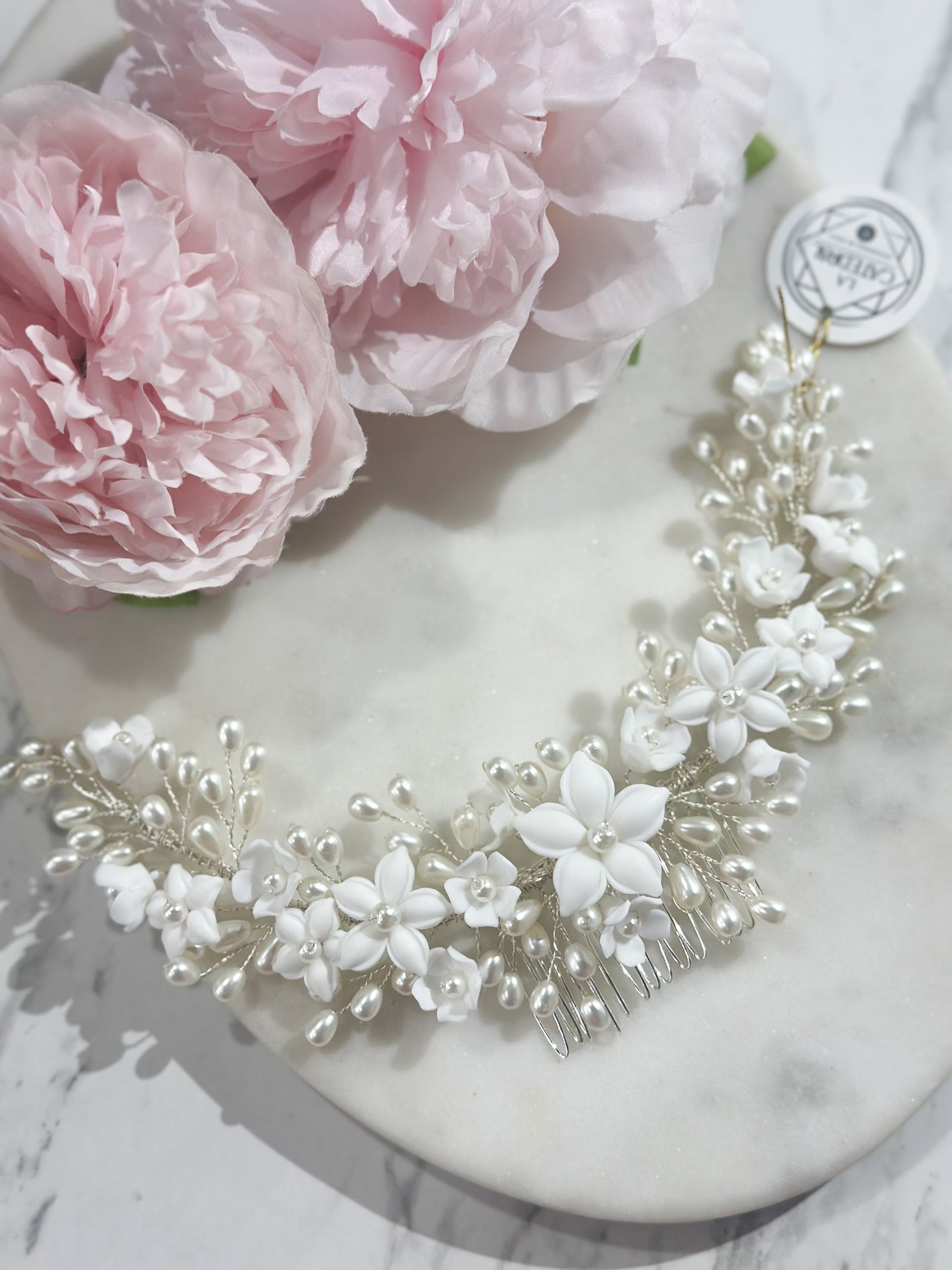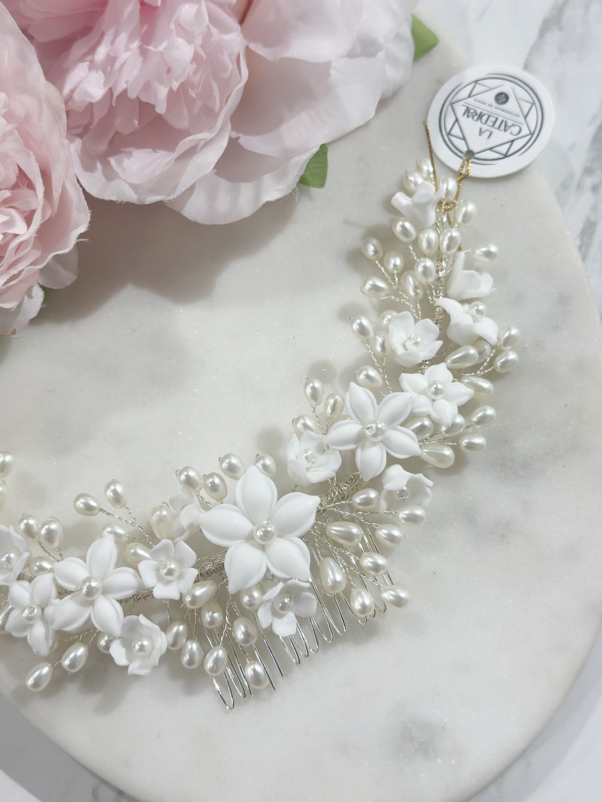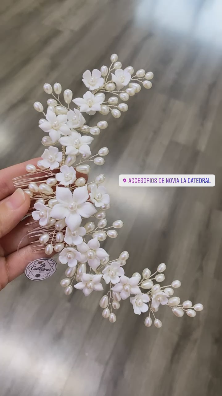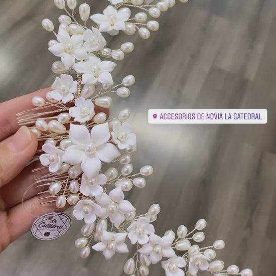 Material: Flores de porcelana y perlas sintéticas en forma de grano de arroz.