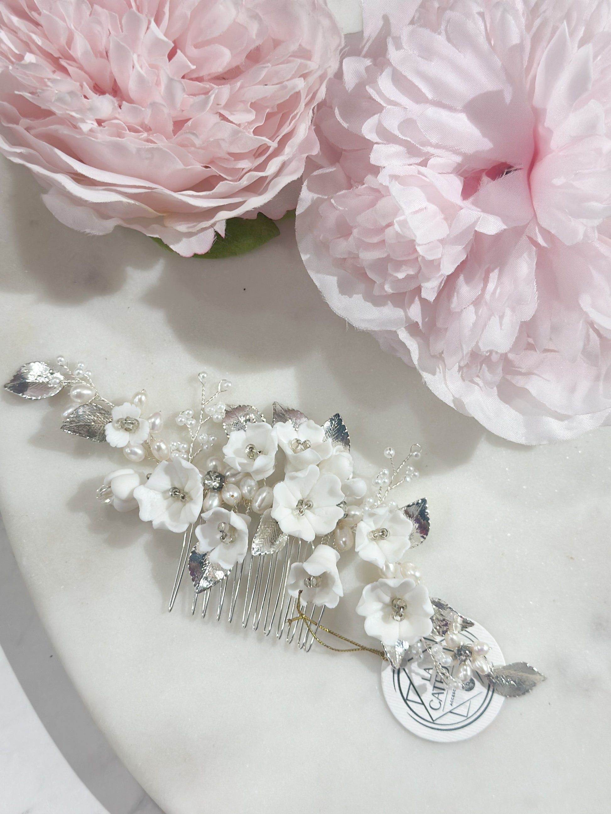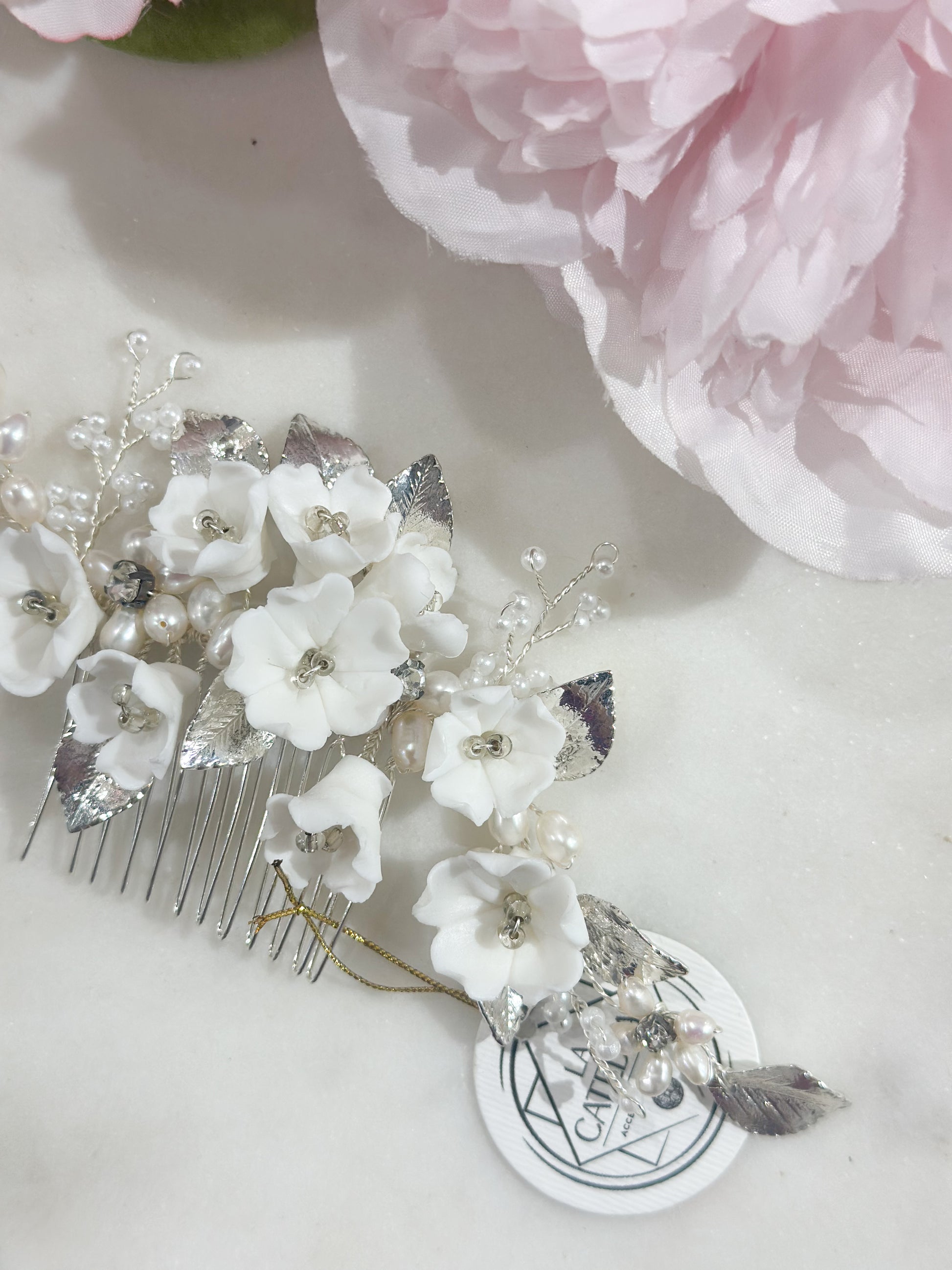 Peineta clásica con flores de porcelana y hojas esmaltadas que dan un toque de sofisticación a tu look nupcial.