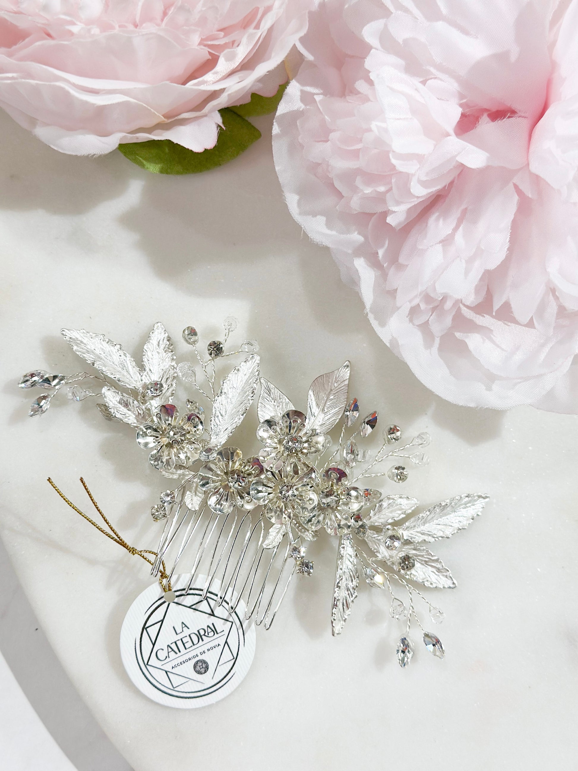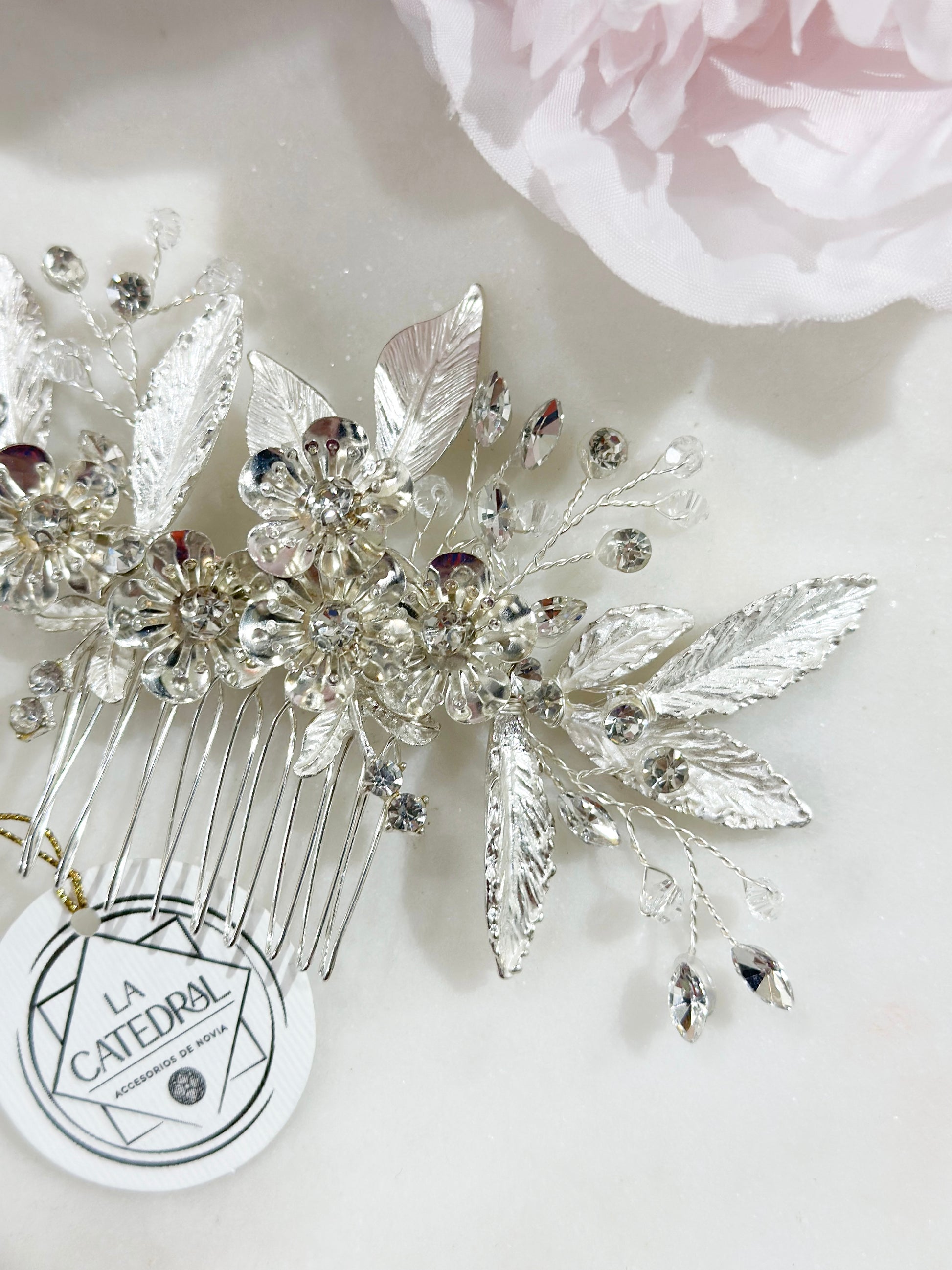 Peineta exquisita con flores y hojas esmaltadas que añaden un toque de brillo a tu peinado gracias a sus cristales austriacos.