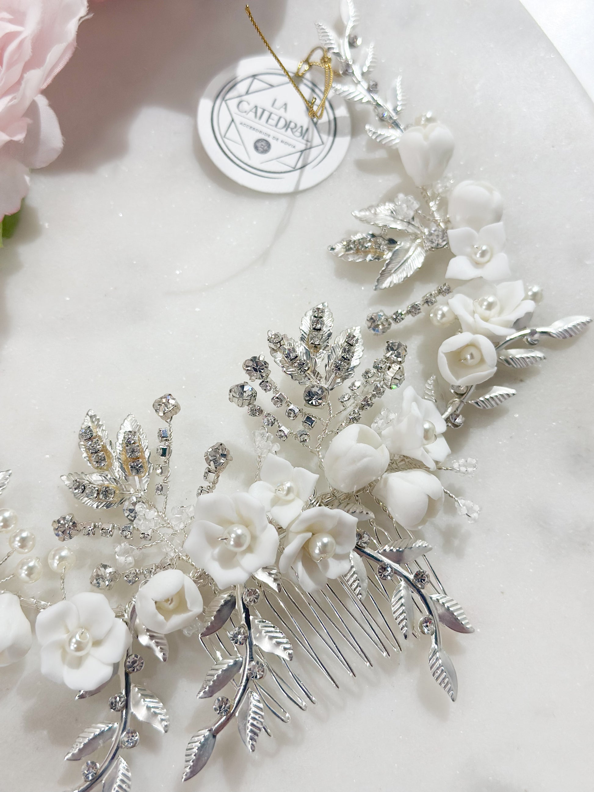 Peineta de flores de porcelana con detalles en cristales austriacos y hojas esmaltadas que crean la combinación perfecta entre elegancia y modernidad.
