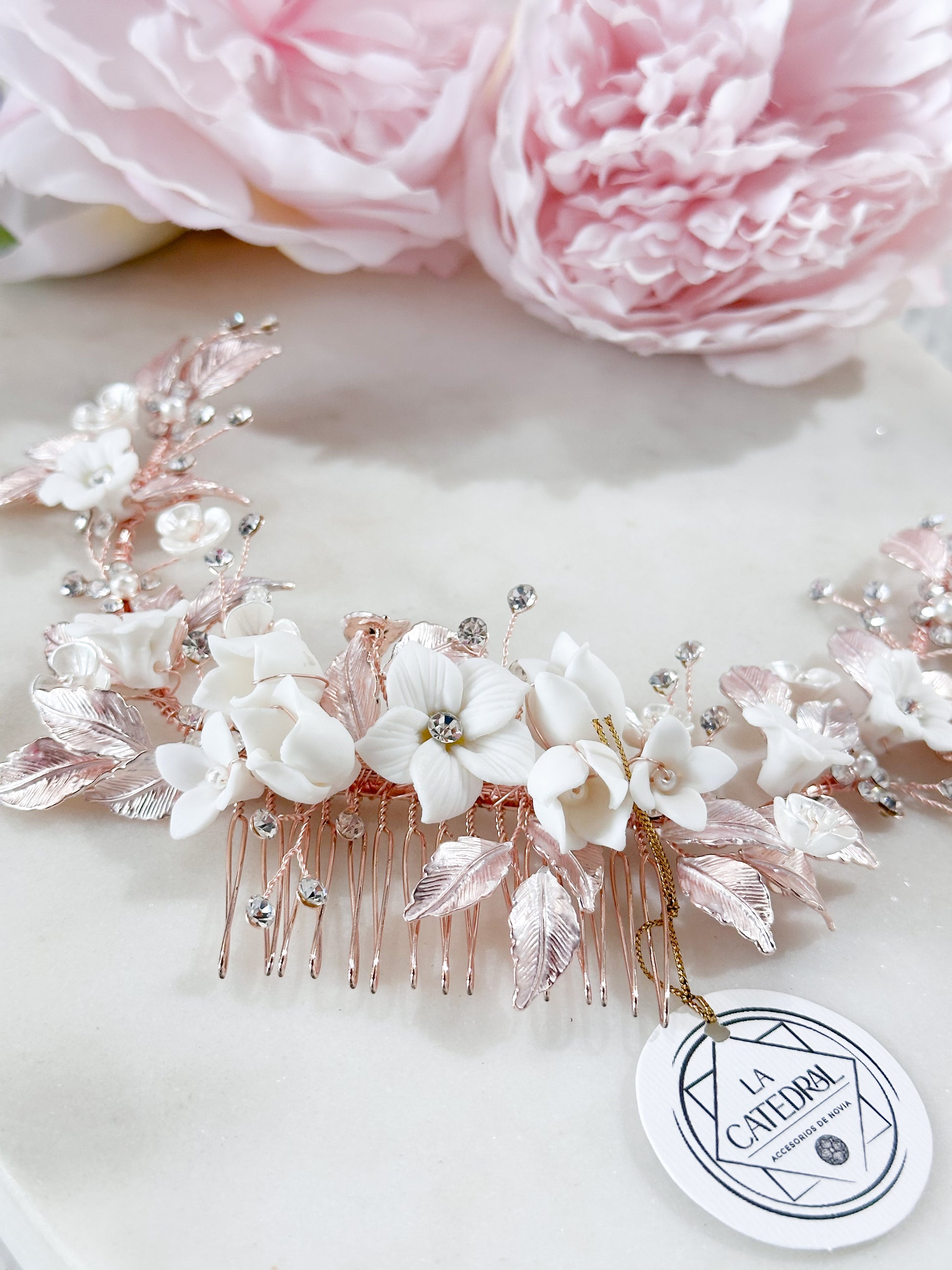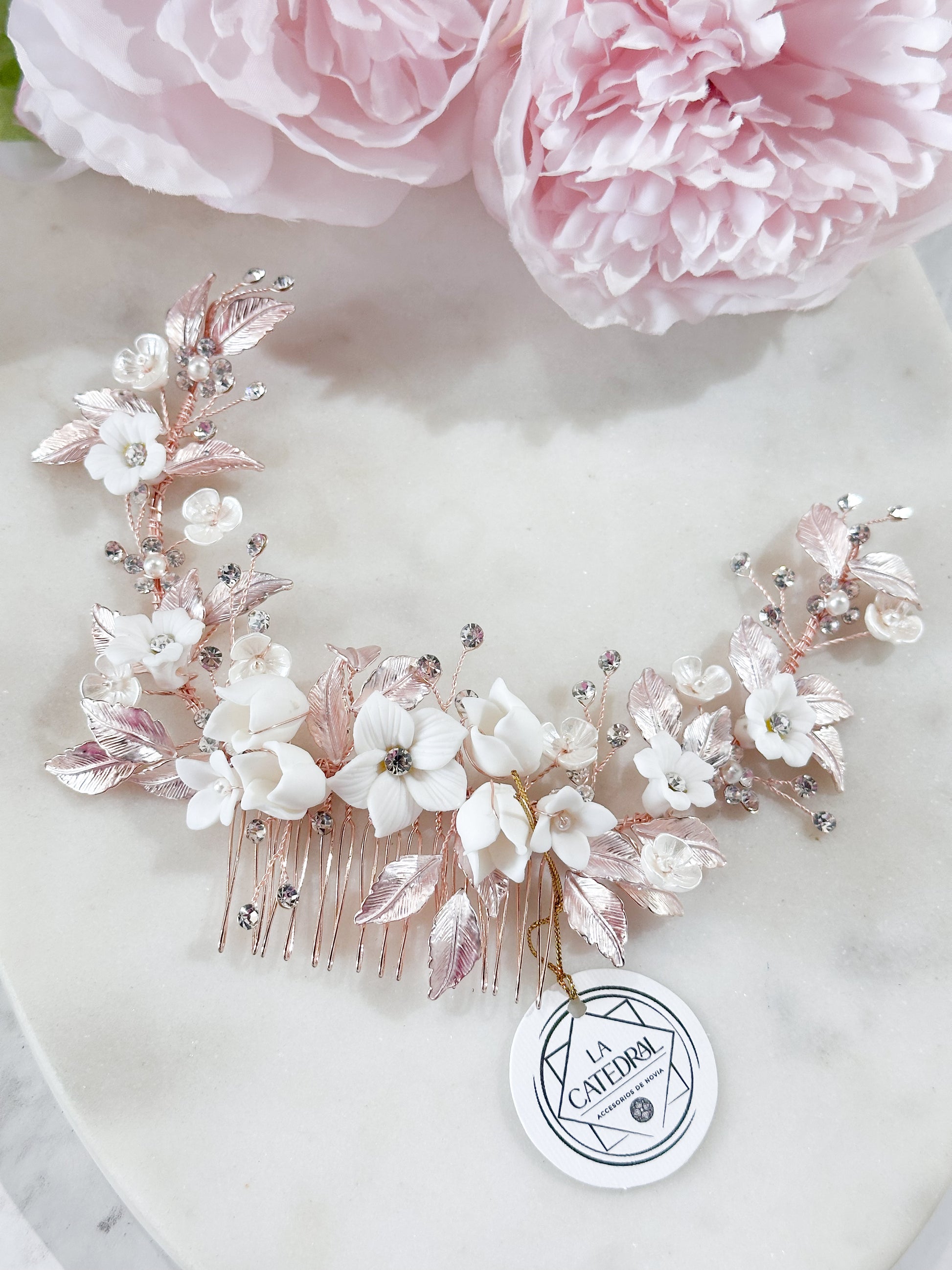Peineta de novia grande de estilo romántica con delicadas flores de porcelana, hojas esmaltadas y cristales austriacos que harán que seas el centro de atención.