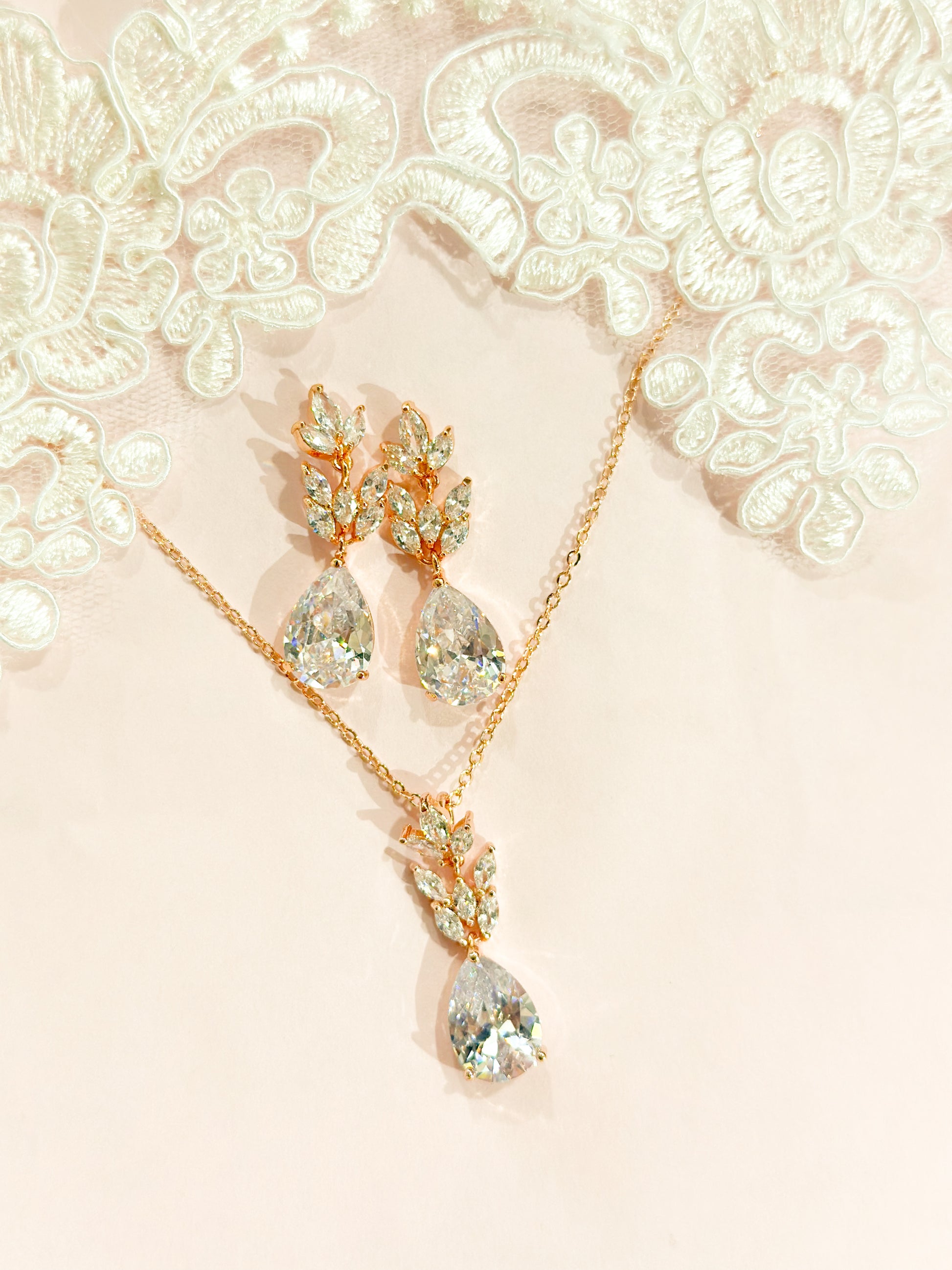 Material: Zirconias en forma de hojas y gota grande al final montadas en armazón con aleación de acero inoxidable en baño de rodio