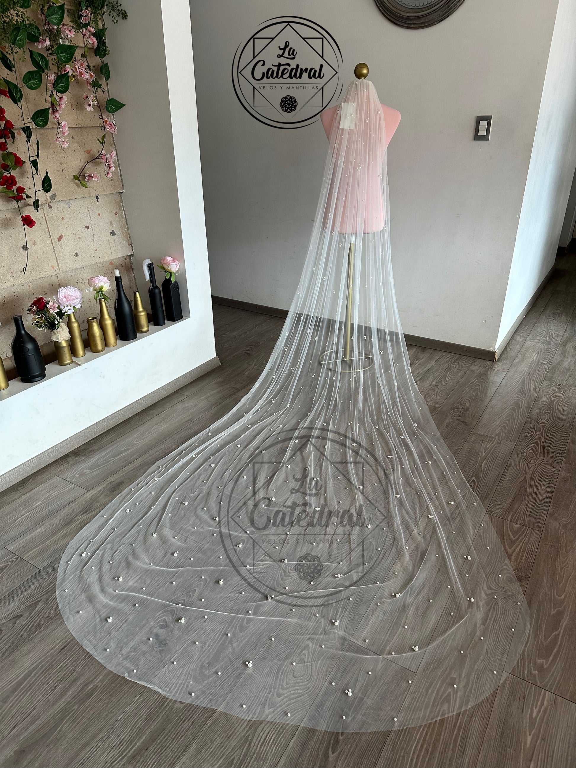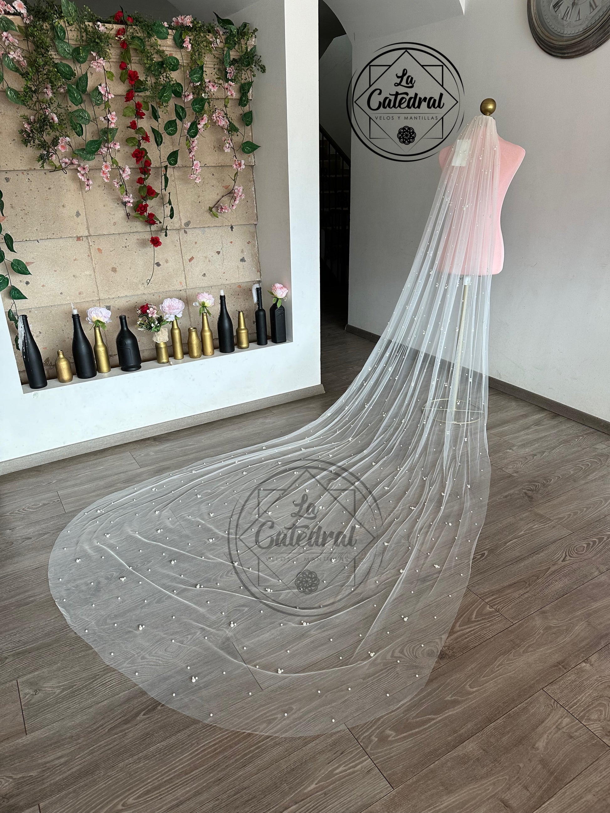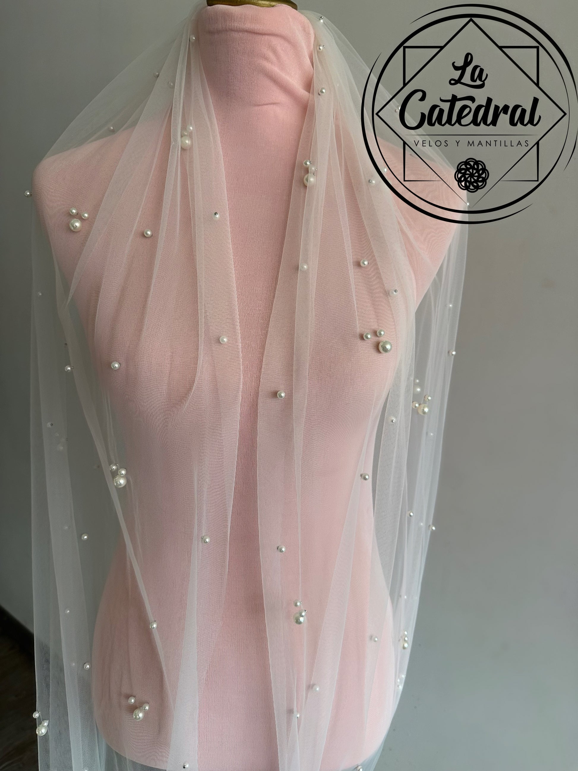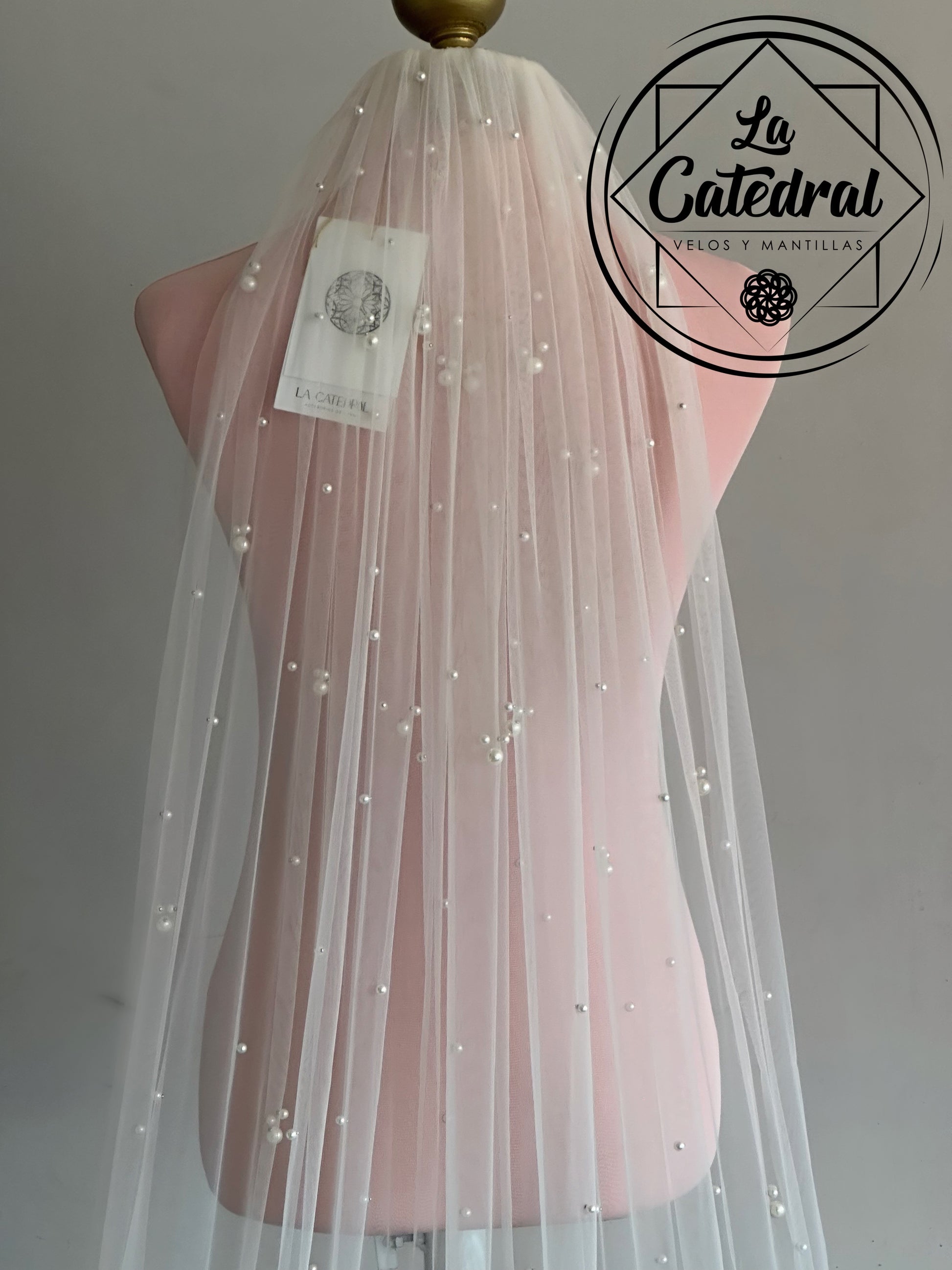 Tipo: Velo catedral una capa con peineta lleno de perlas incrustadas de diferentes tamaños.