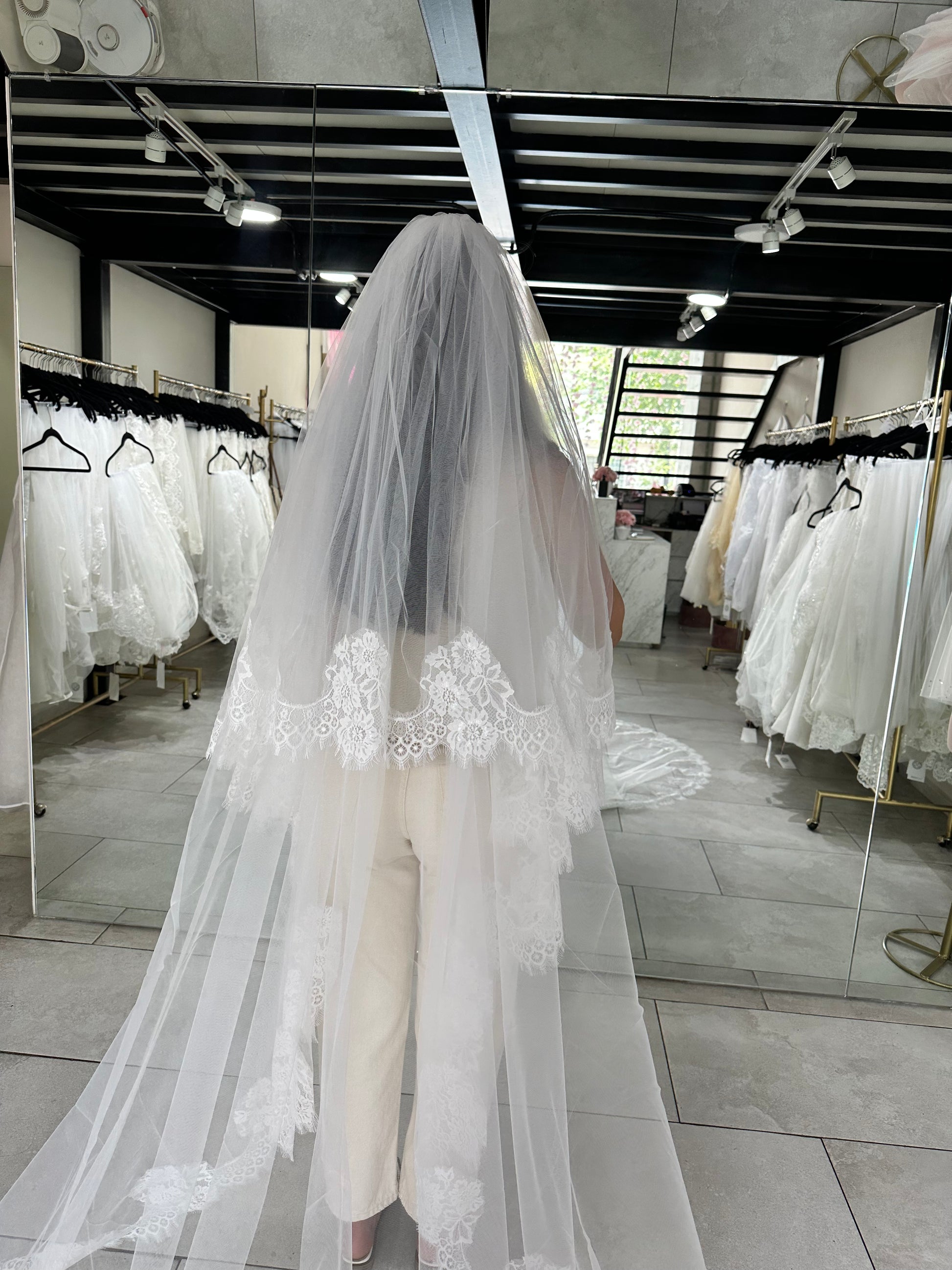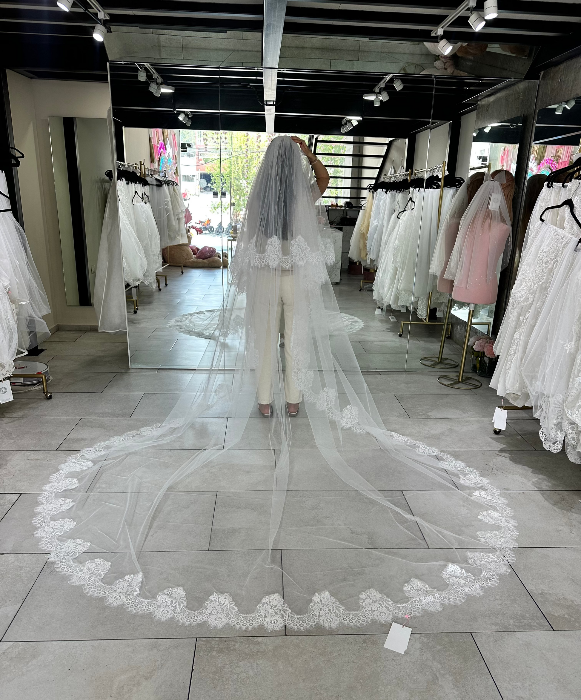 Tipo: Velo catedral doble capa con peineta, elaborado en tulle de seda puro con encaje francés grande en toda la orilla, ideal para una novia extra romántica y elegante.