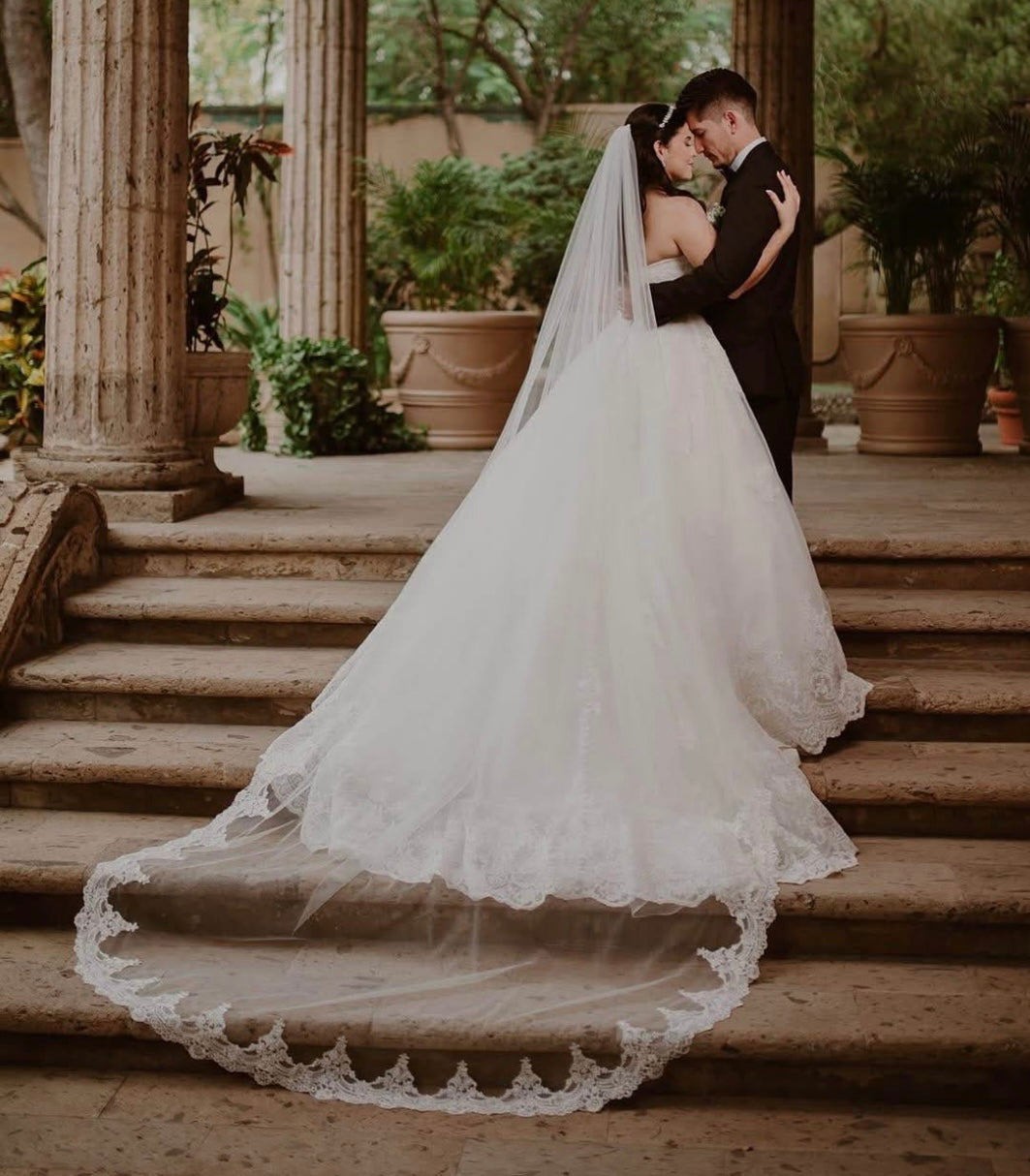 Velo una capa con peineta en tulle de seda con un encaje tradicionalmente elegante ideal para enmarcar tu vestido.